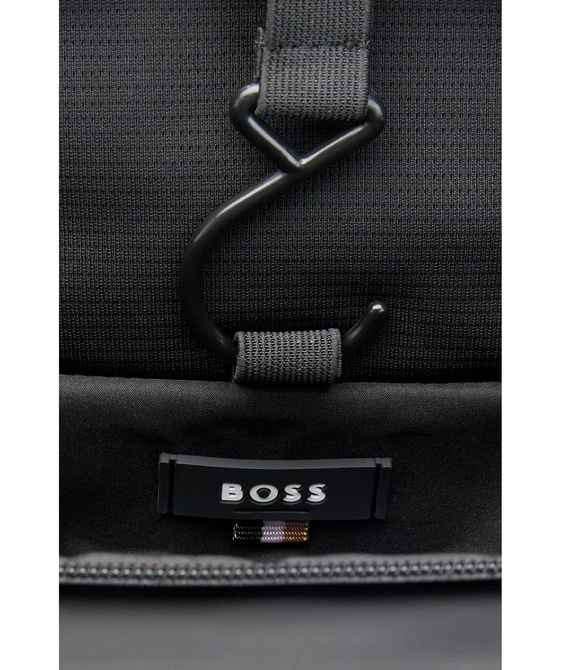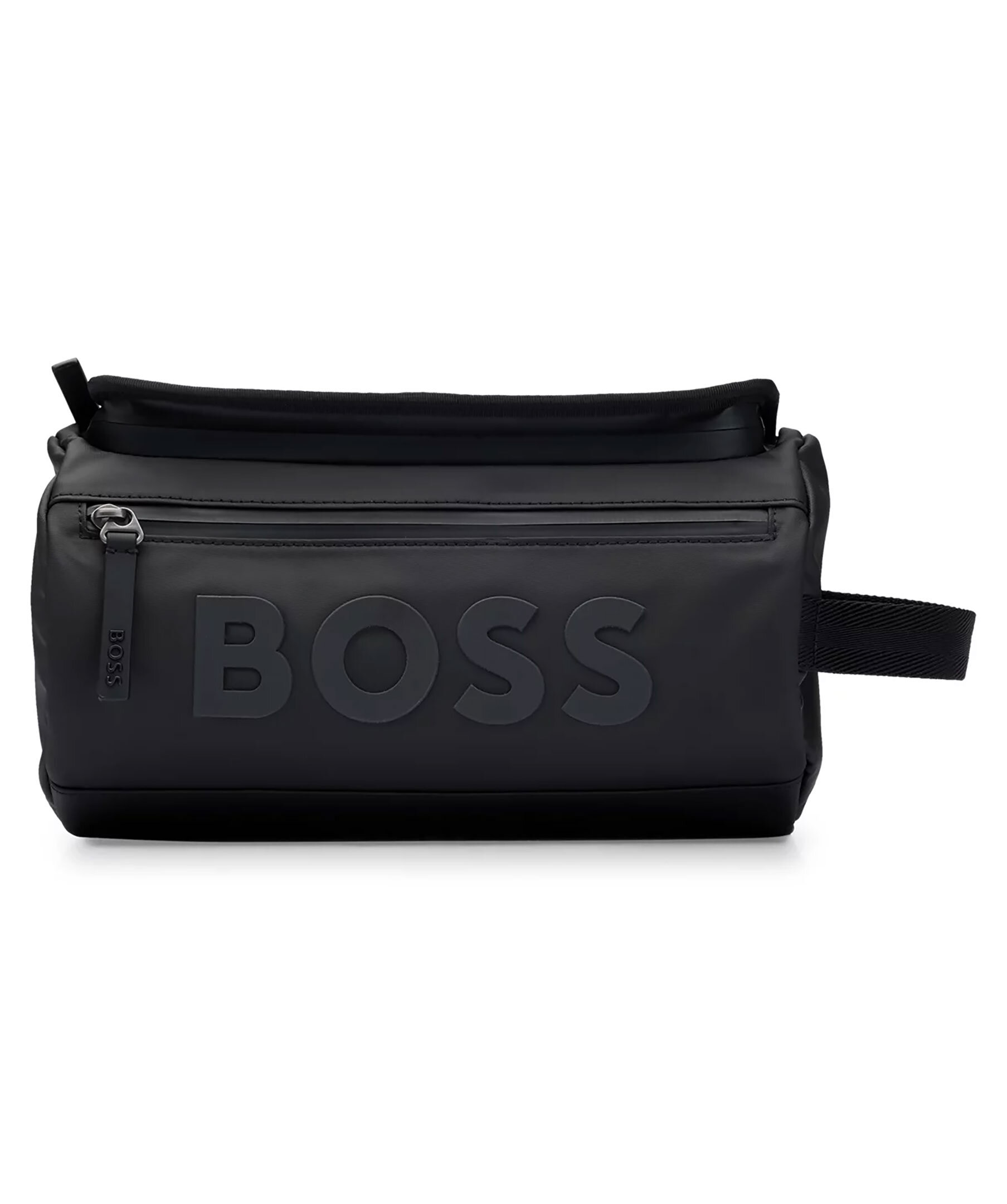 Svart necessär från BOSS Black. Huvudfacket stängs med dragkedja, ytterfack som stängs med dragkedja. Gummerad logotyp på necessärens framsida. Ögla på vänster kortsida. Necessärens mått: 27 x 15 x 15 cm