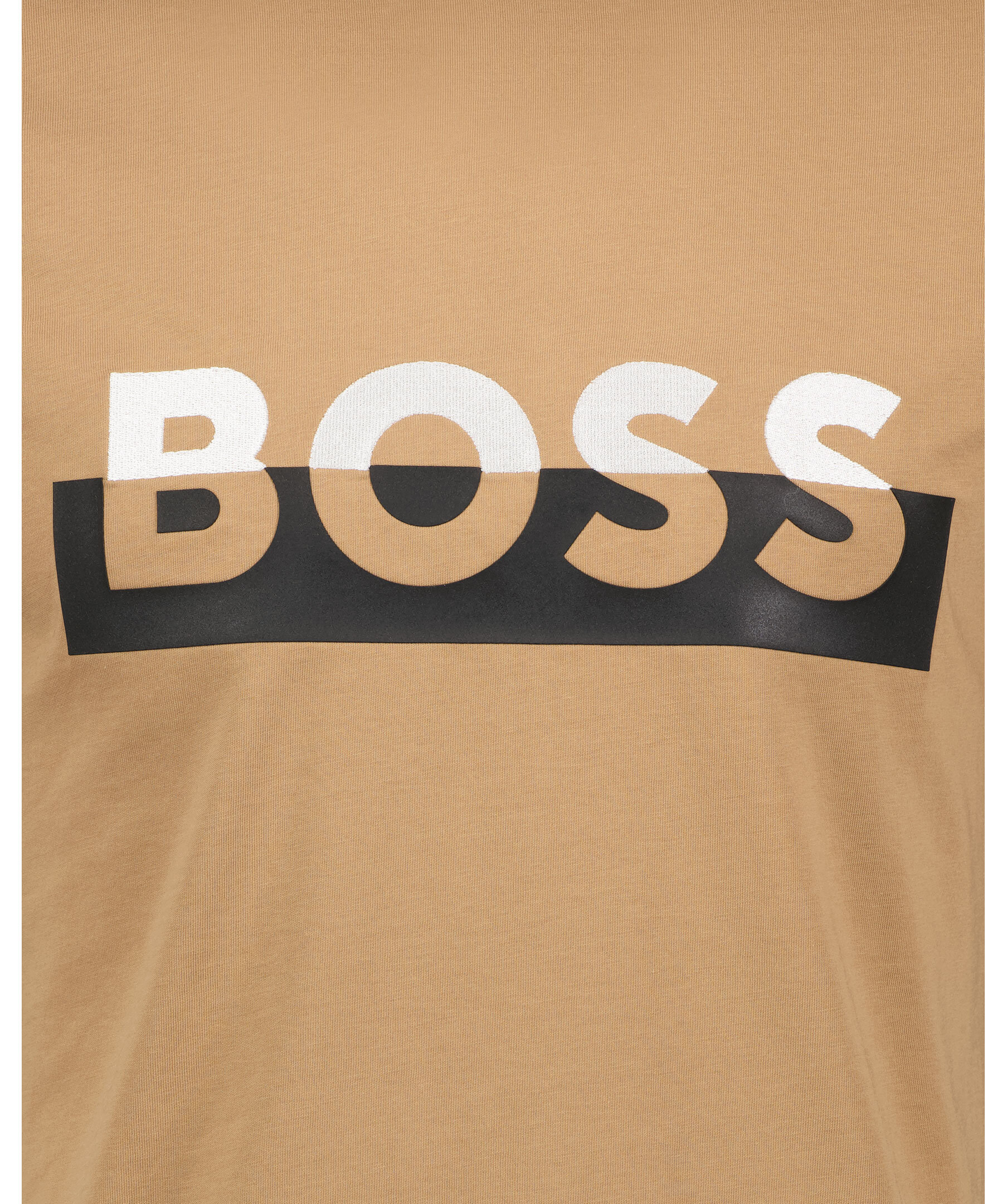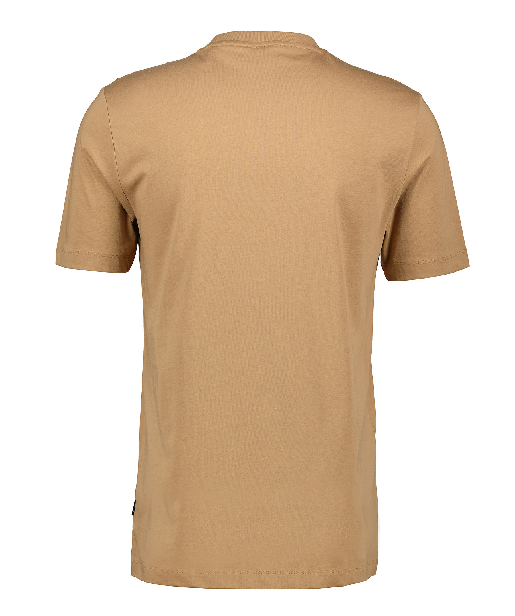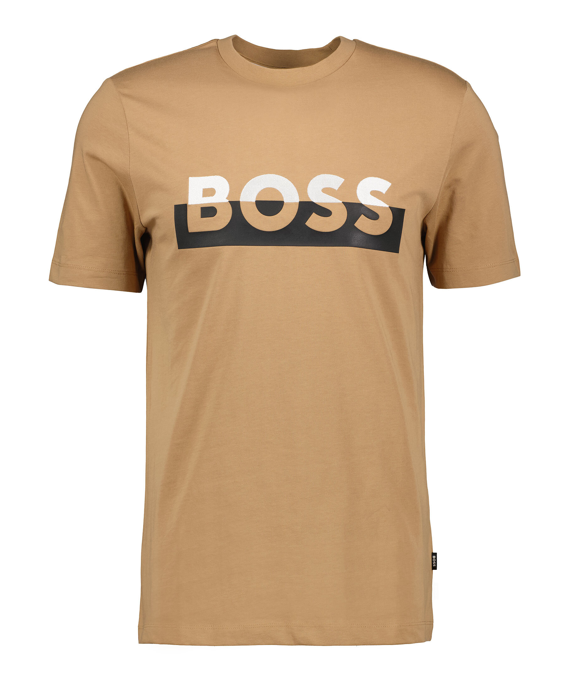 Kamelfärgad t-shirt från BOSS Black. Tillverkad i 100% bomull. Ribbstickad halsring. Gummerade logotyp i matchande färg till tröja, svart och vitt över bröstet.