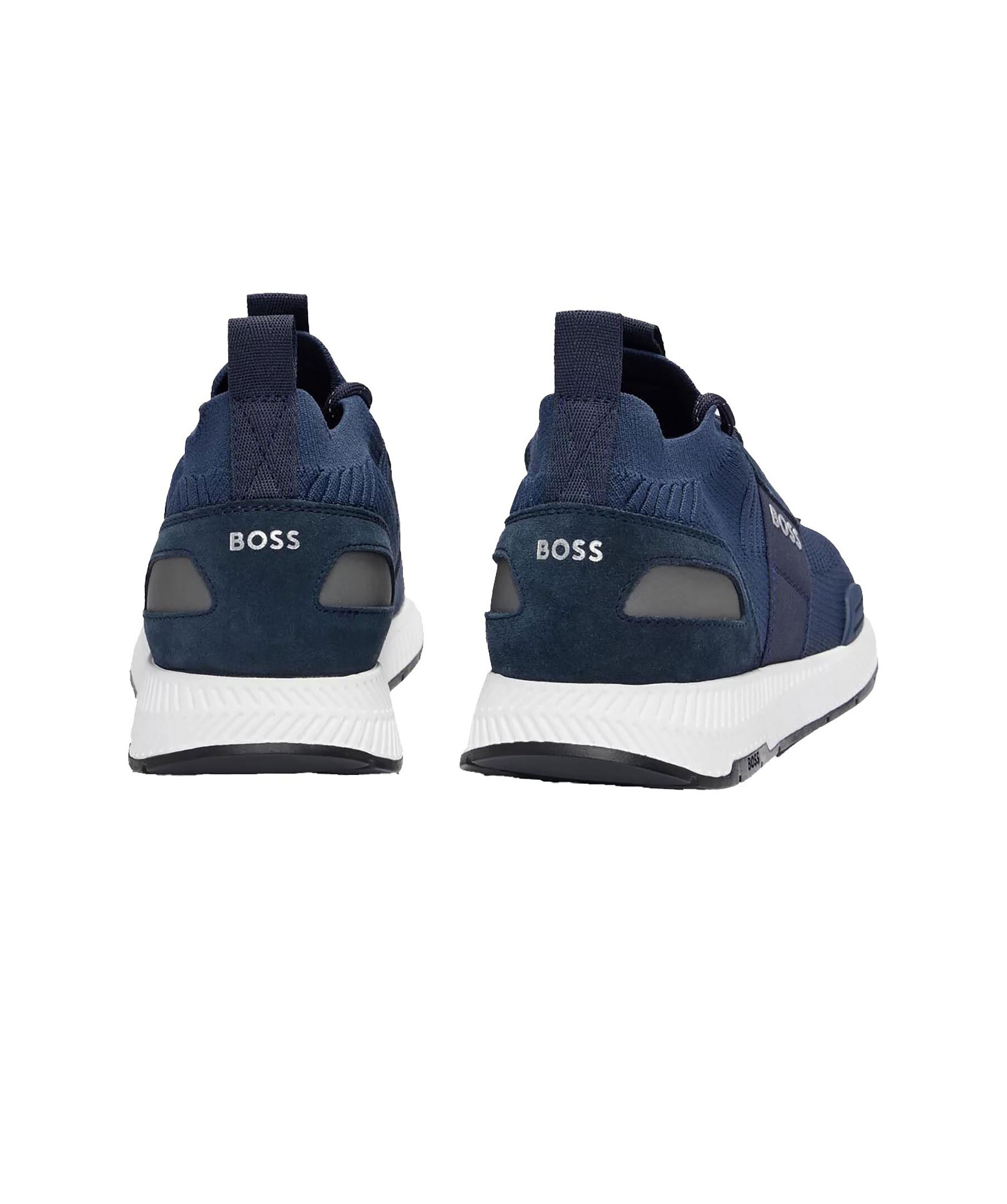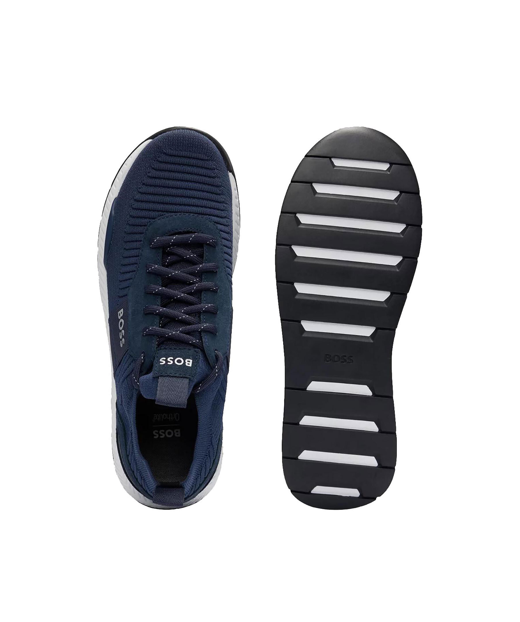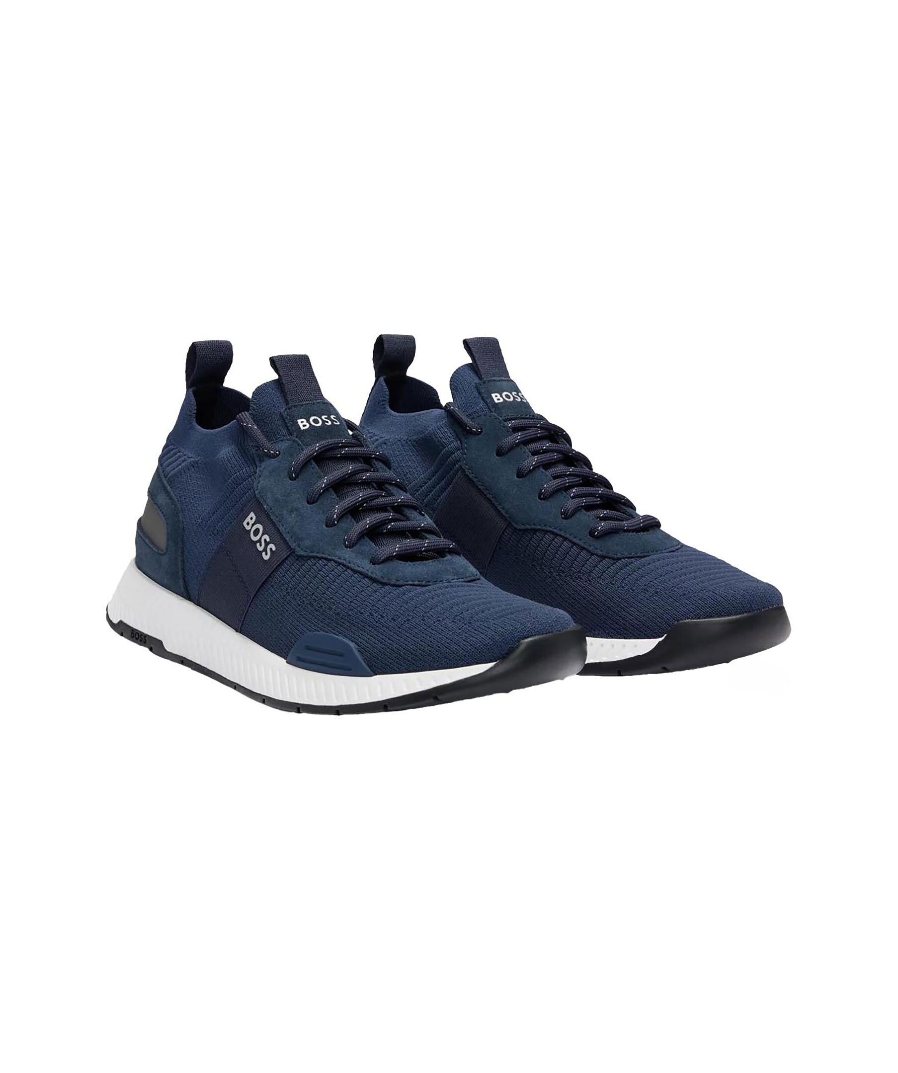 Mörkblåa sneakers från BOSS Black. Runda skosnören. Detaljer i mocka. Resår på sidan av skon med tryck logotyp. Tryckta logotyper på skons plös och häl. Vävd ögla vid hälen och plösen. Vit sula i gummi.