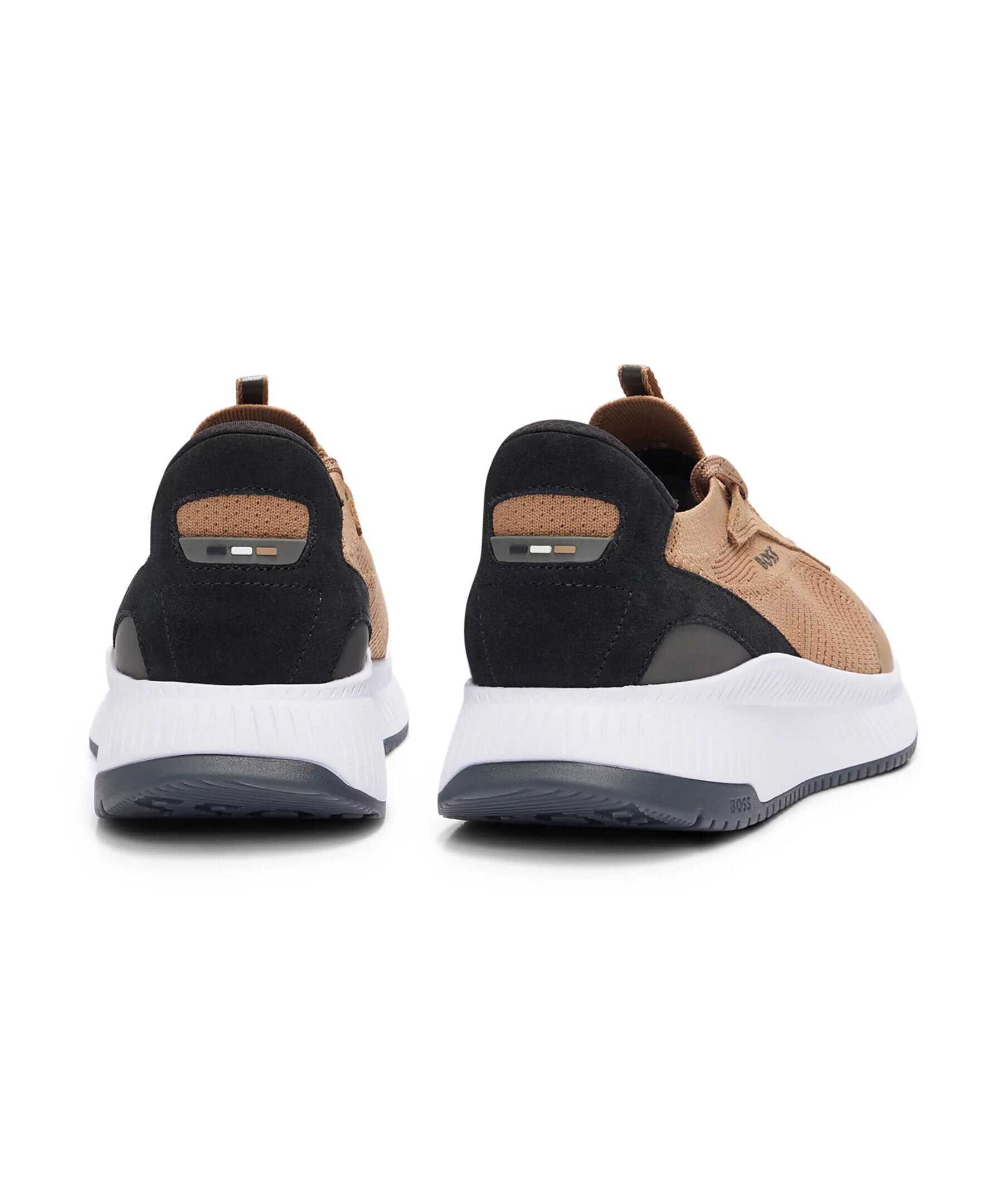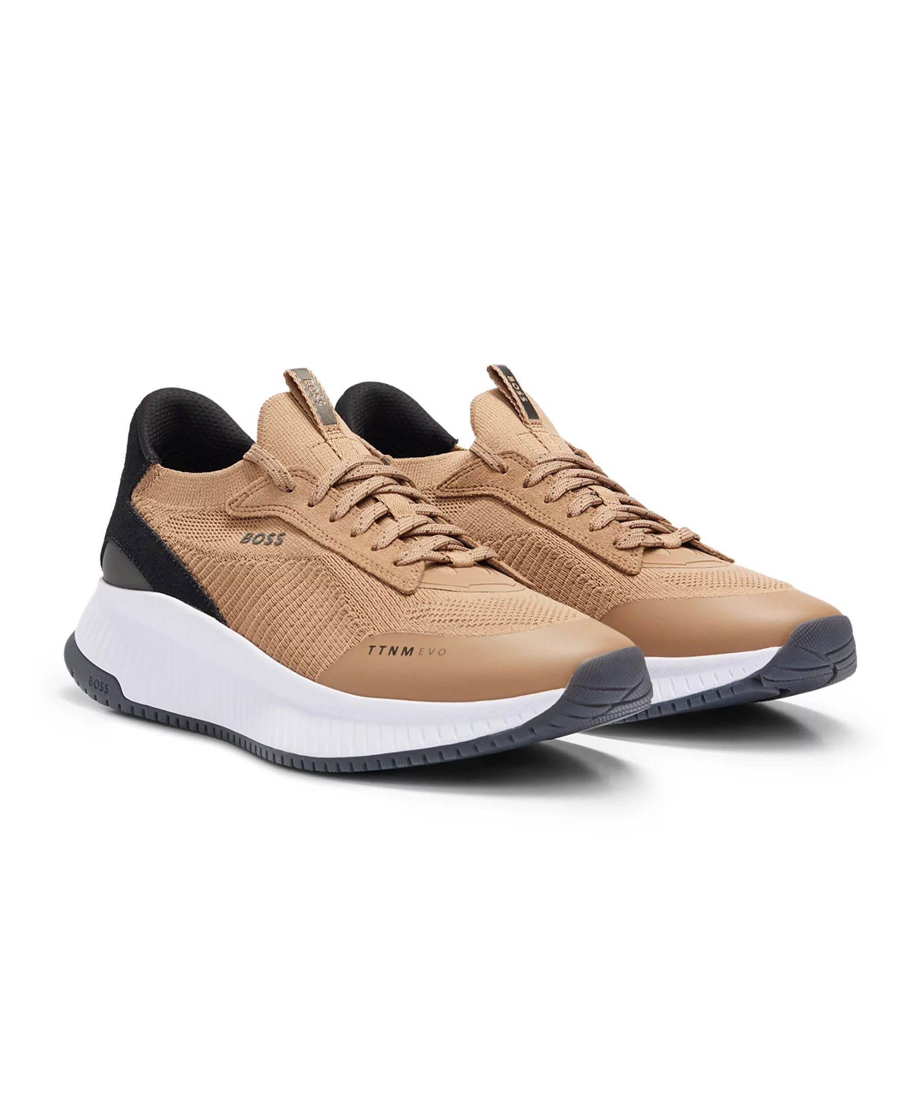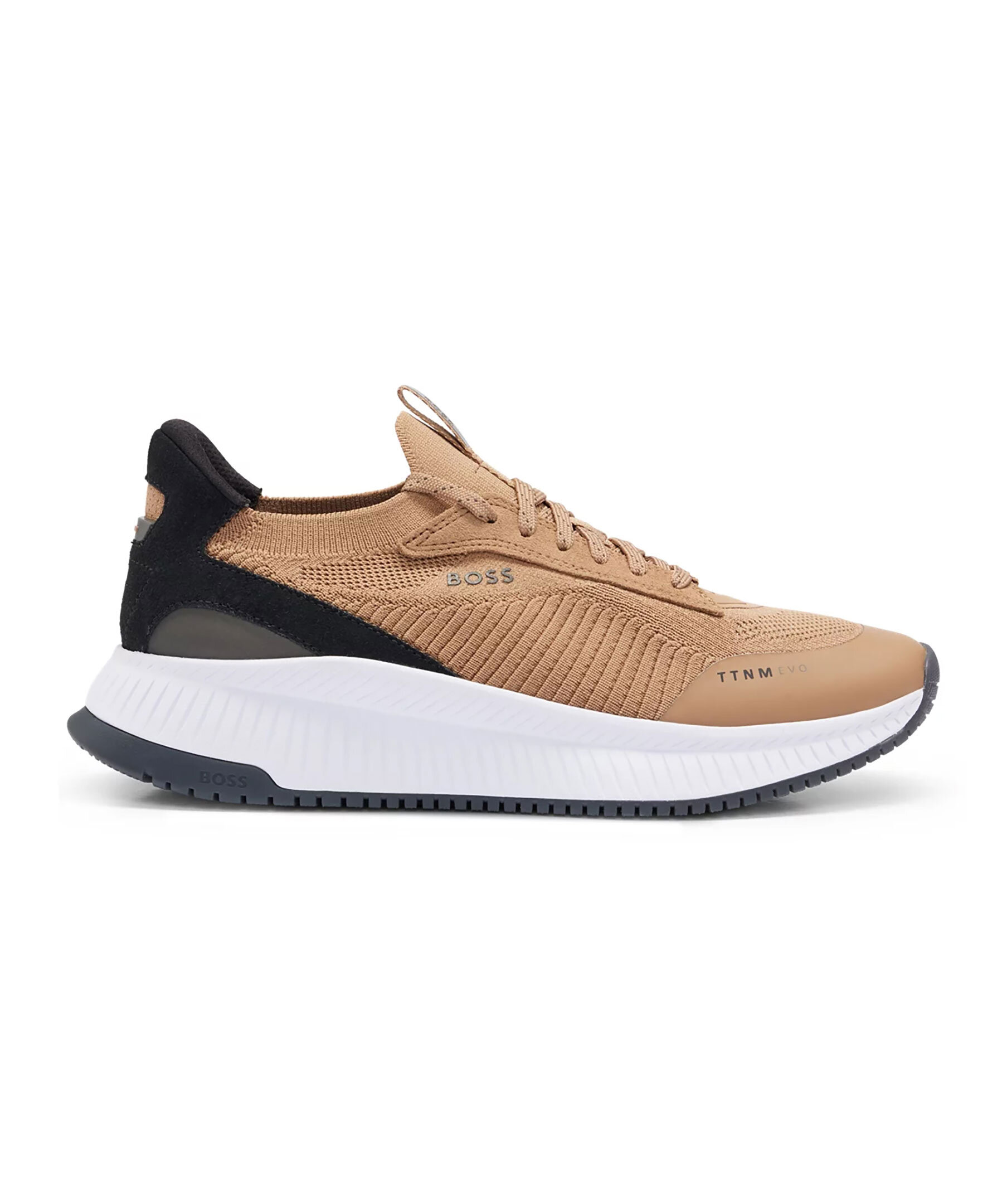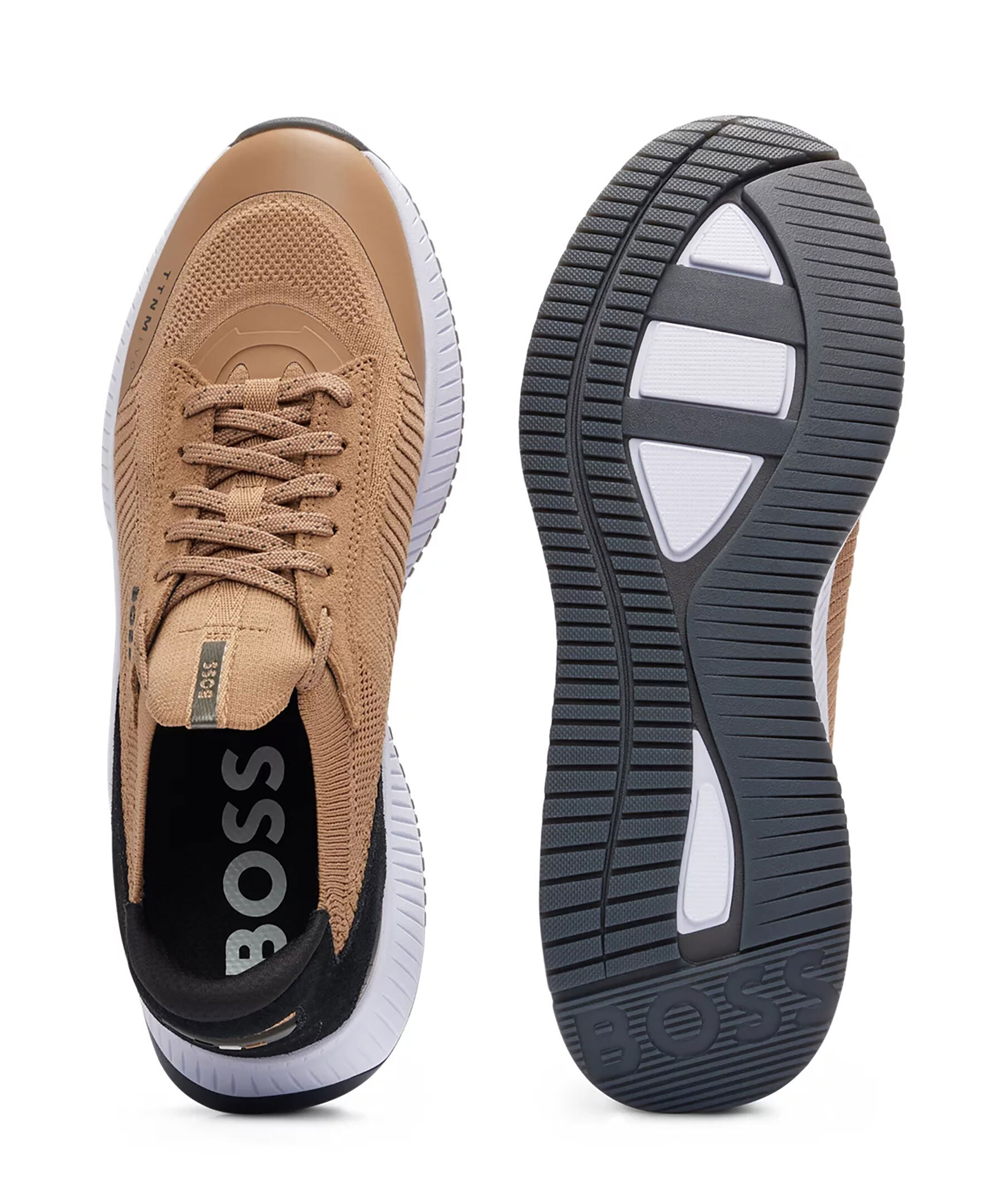 Beigea Sneakers från BOSS Black. Stickad översida. Fiskbenssula i gummi. Gummerad logotyp på skons yttersida. Platta skosnören. Ögla med tryckt logotyp på plösen. Detalj i svart mocka imitation på hälen.