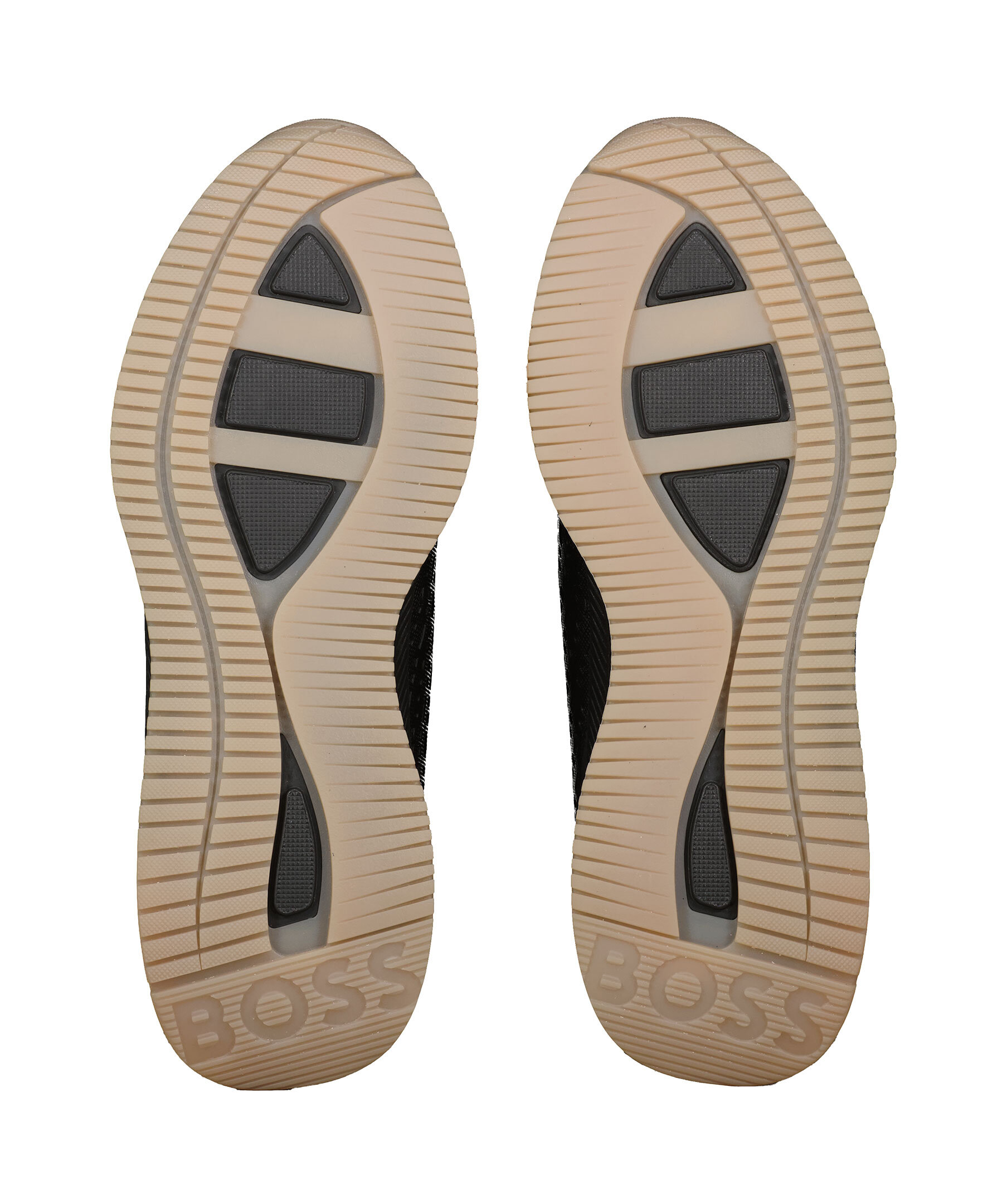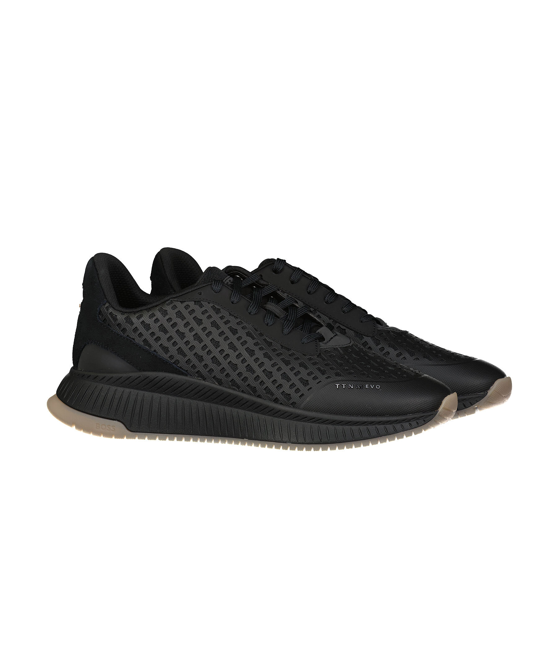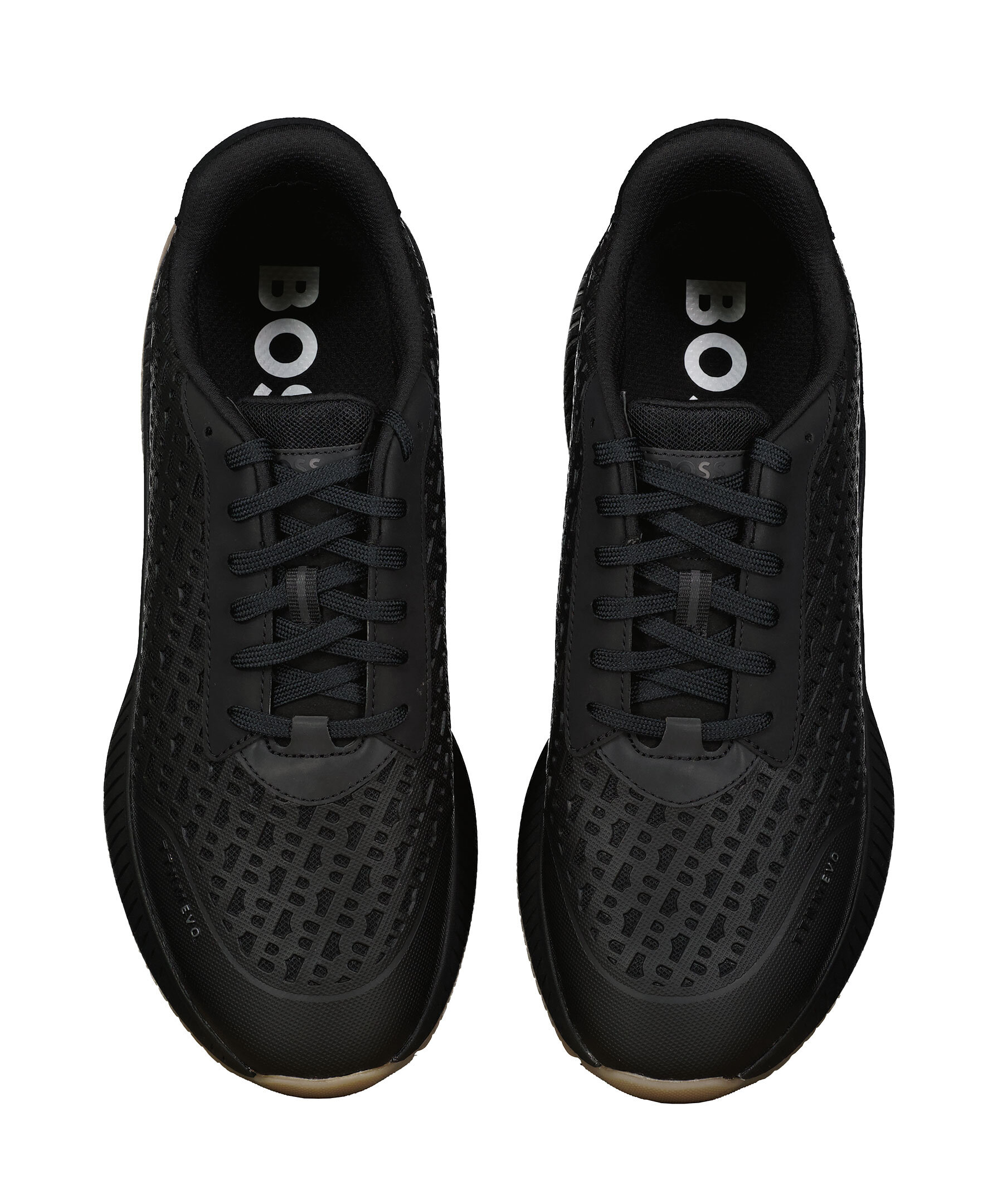 Svarta, stilsäkra sneakers från BOSS Black. Tillverkade av en kombination av mjuk mocka och monogram-mesh. Stor i storleken, vi rekommenderar att gå ned i storlek.