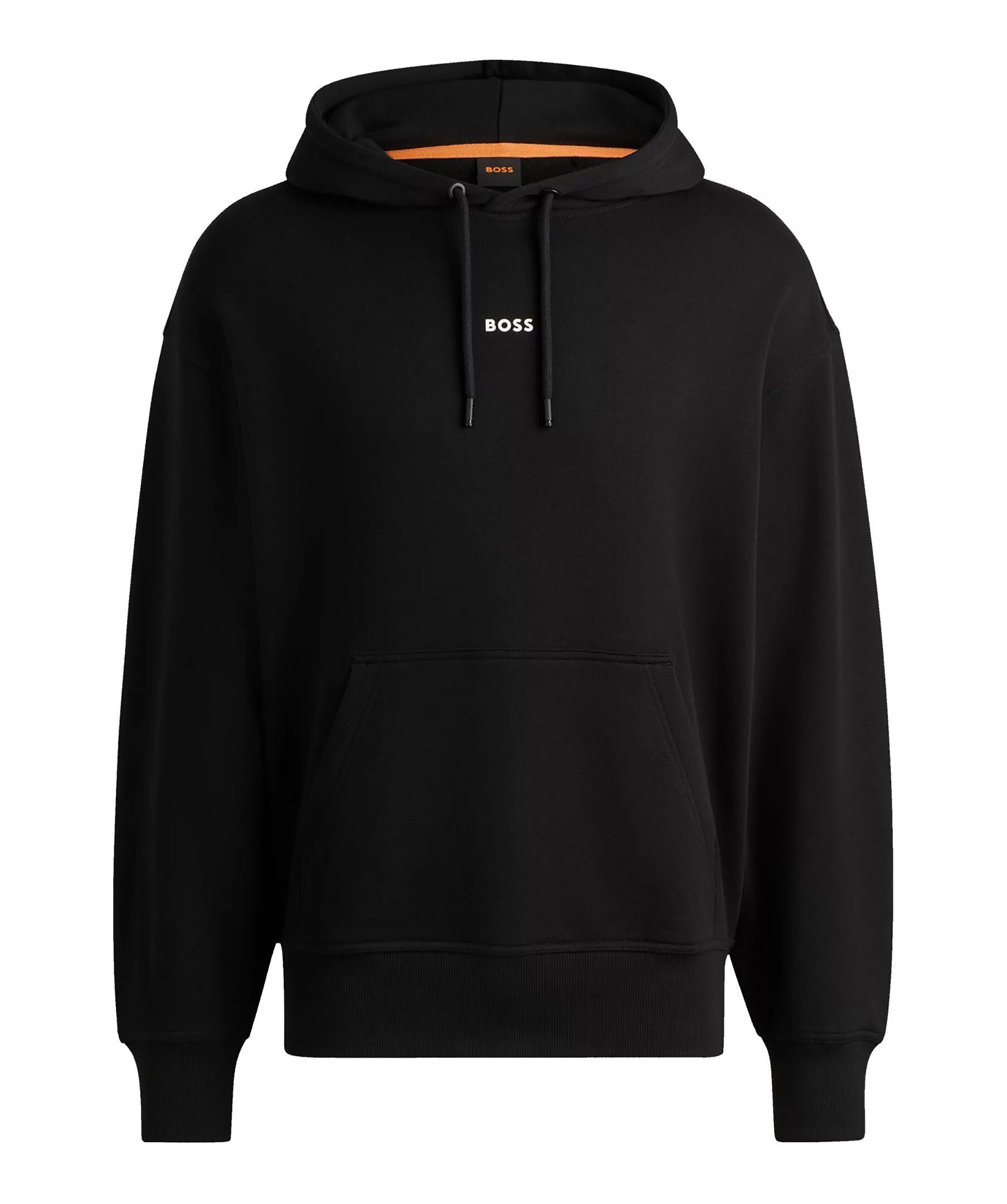 Svart hoodie från BOSS Orange. Hoodien har huva med dragsko, ribbstickade muddar, känguruficka samt gummerad logotyp på bröstet. Tillverkad i bomull.