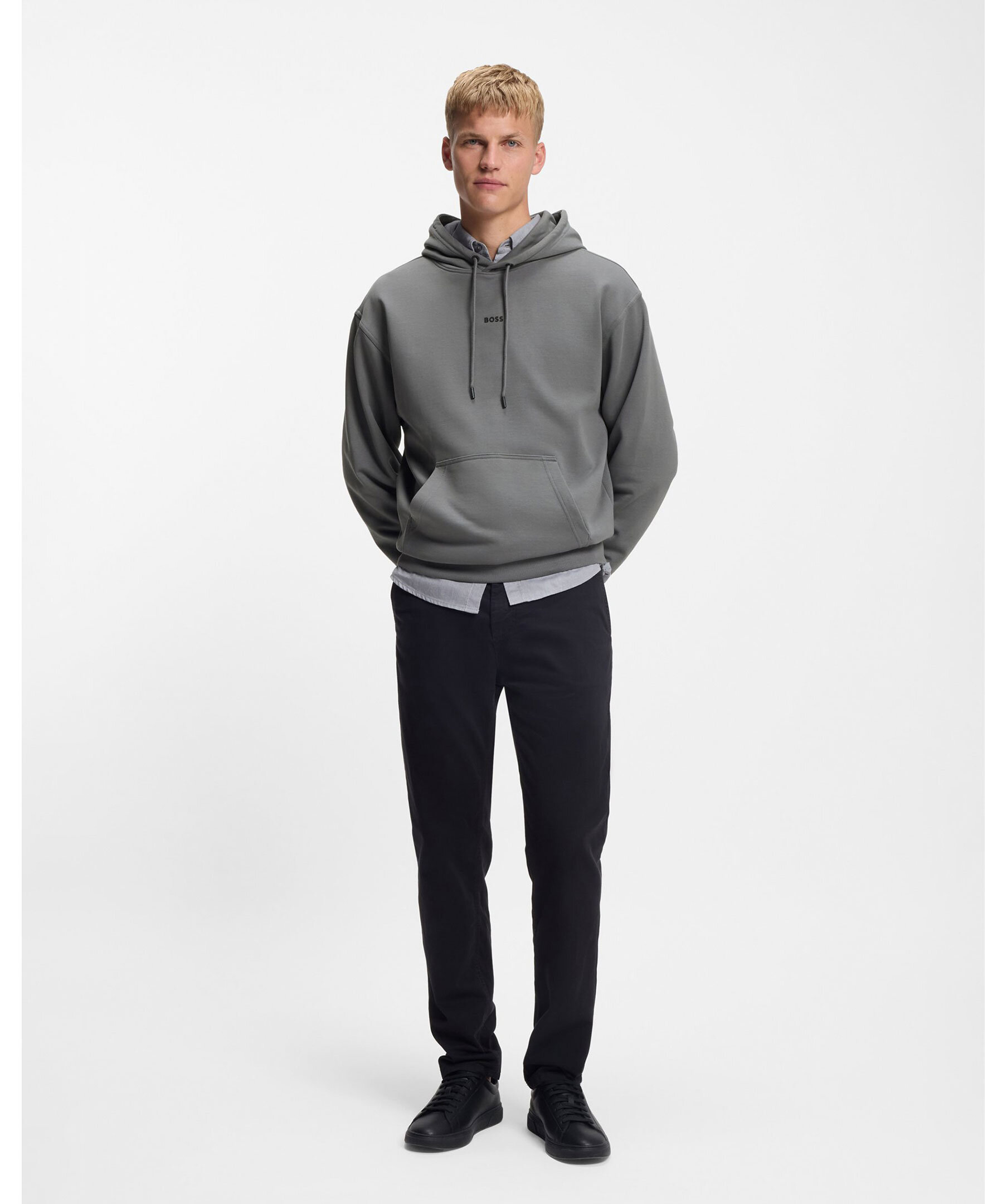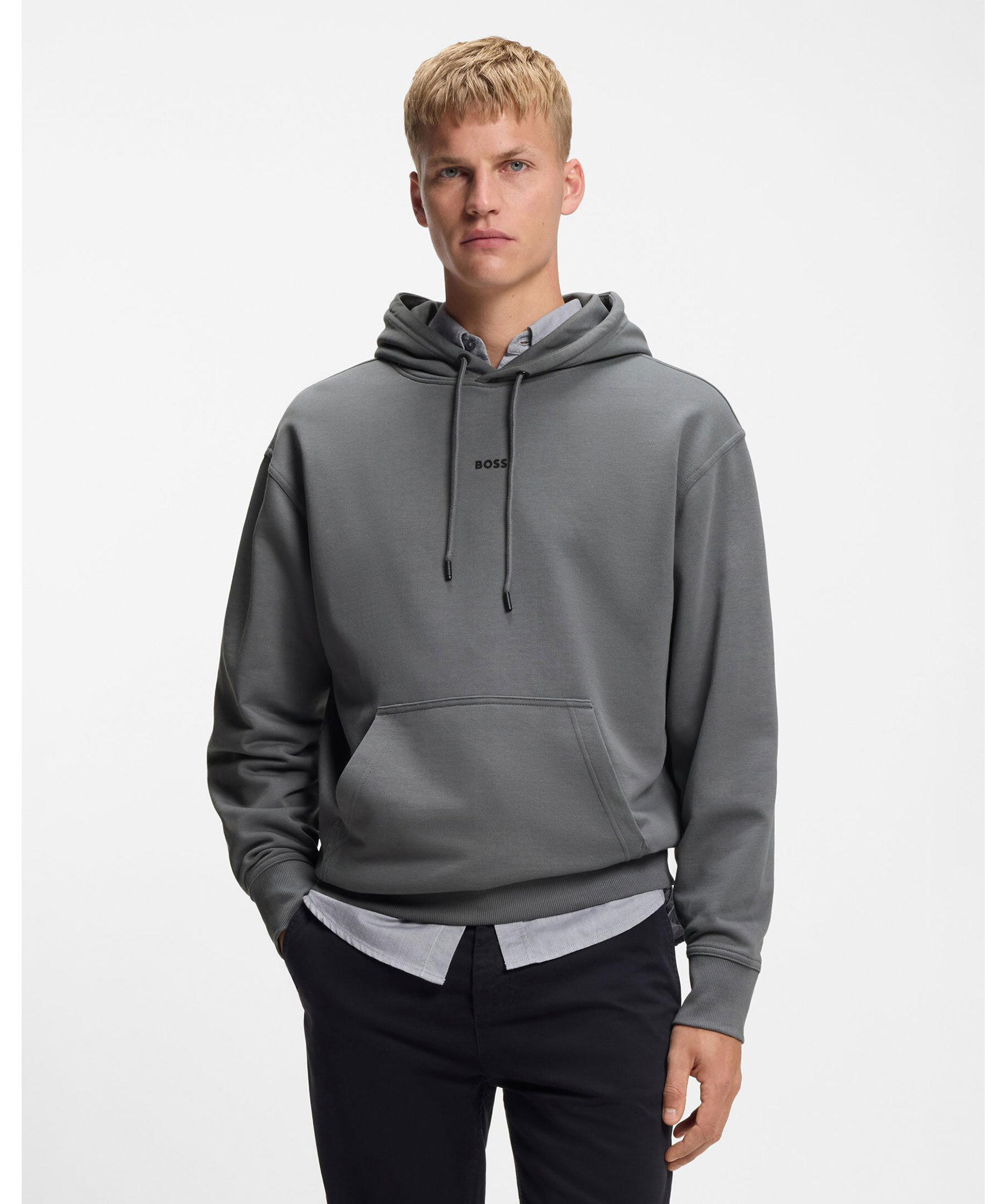 Grå Hoodie från Boss. Hoodien har huva med dragsko, ribbstickade muddar, känguruficka samt gummerad logotyp på bröstet. Tillverkad i bomull.
