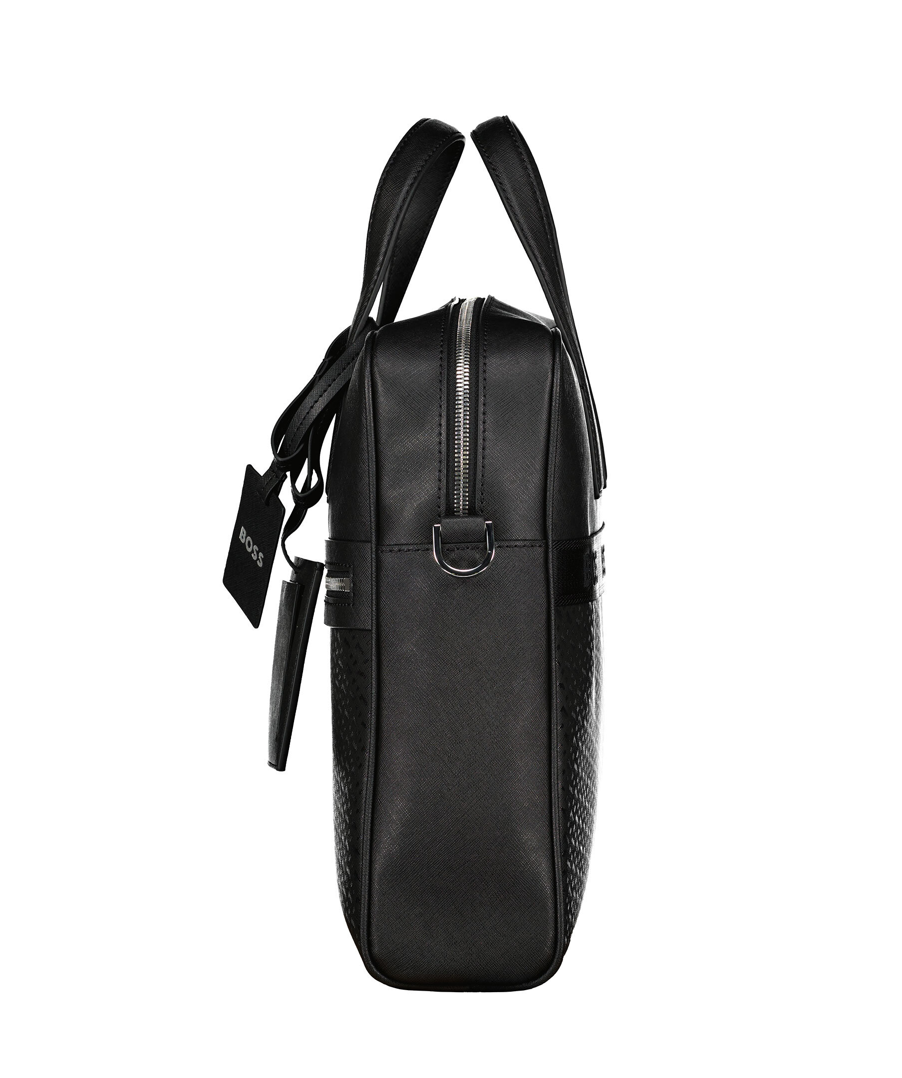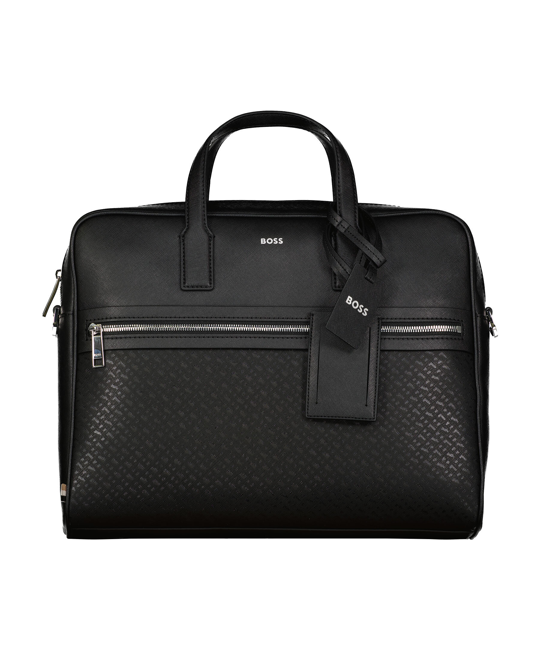 Svart, mönstrad dator/ kontorsväska i regenererat läder från BOSS Black. Inre datorficka och smart ficka på baksidan så att väskan enkelt kan fästas på ett rullväskhandtag. Monogramtryck och justerbar, avtagbar axelrem. Ficka med dragkedja på utsidan och liten silverfärgad logotyp i fram. Dubbelhandtag och stängning med dragkedja upptill. Mått: 30 x 39 x 9 cm.
