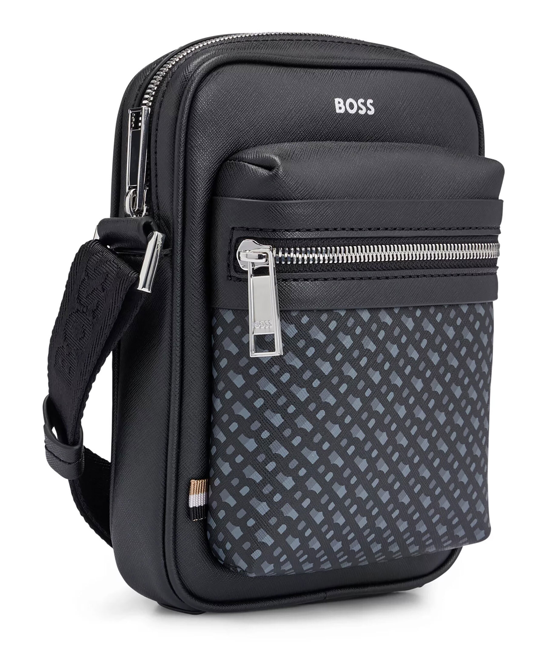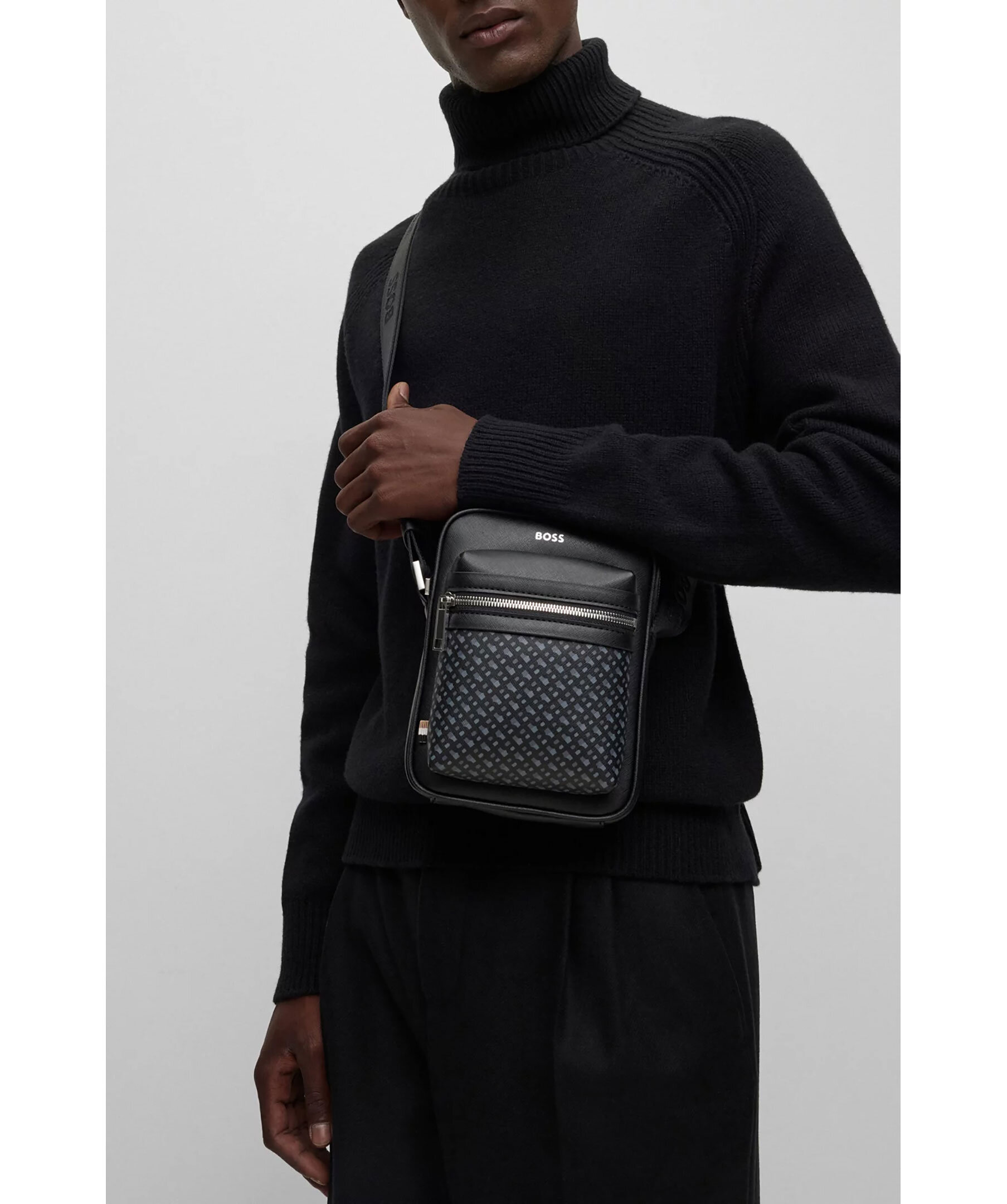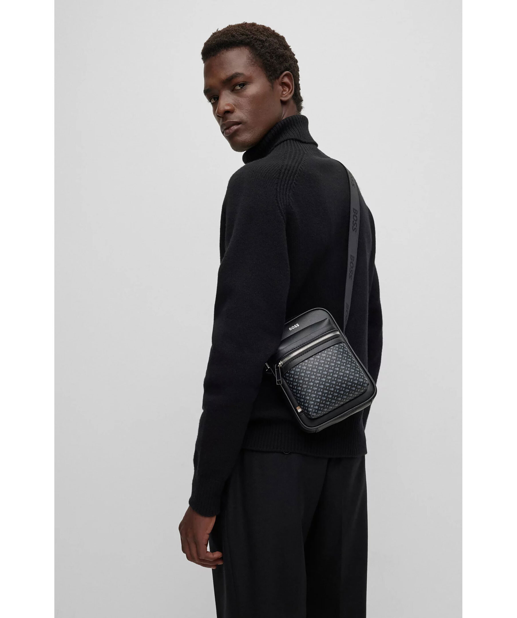En kompakt svart reporterväska från BOSS Black. Fack på framsidan med dragkedja och monogrammönster. Stängs med dragkedja upptill. En innerficka med dragkedja. B: 16 cm D: 3,5 cm H: 21 cm.