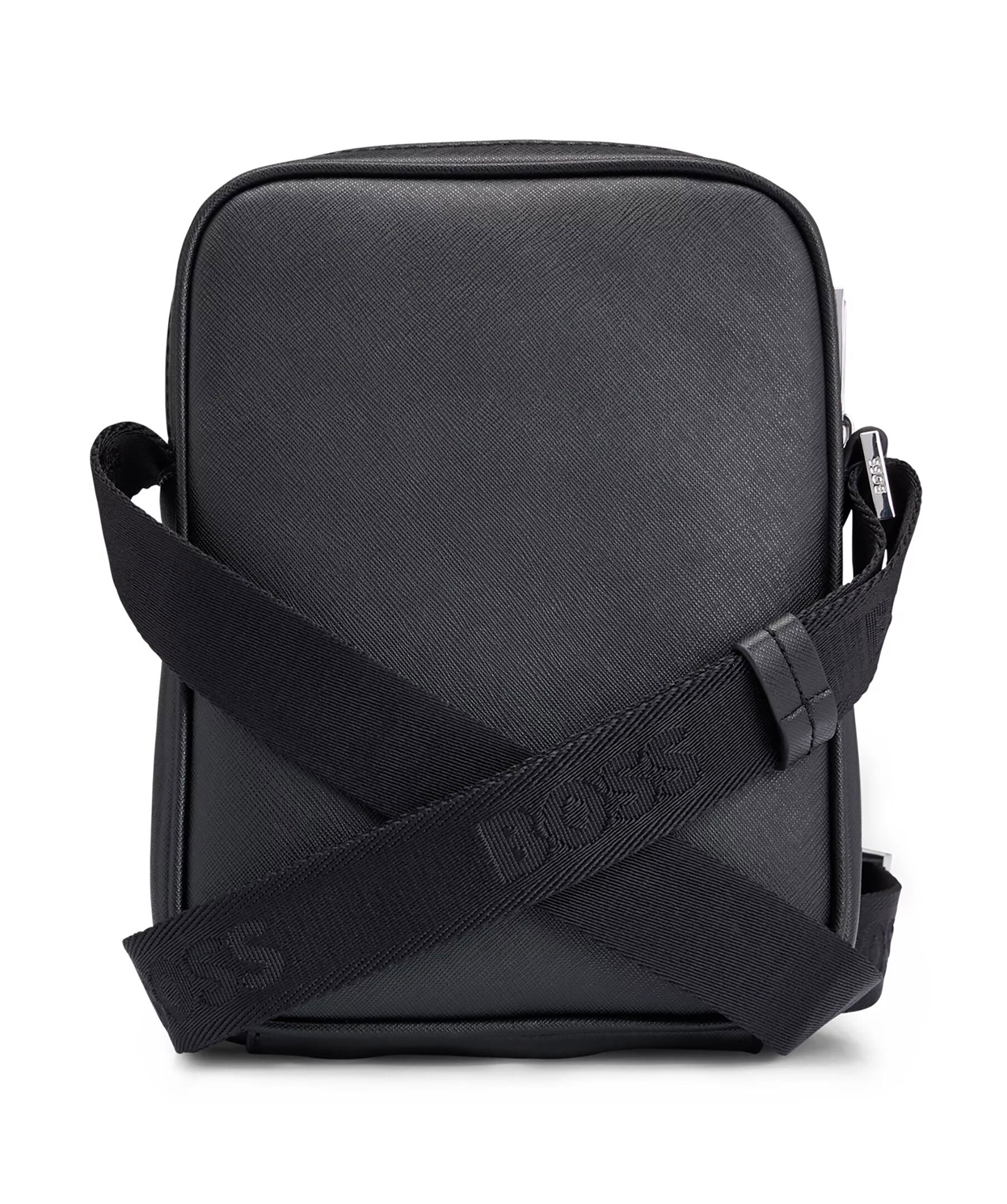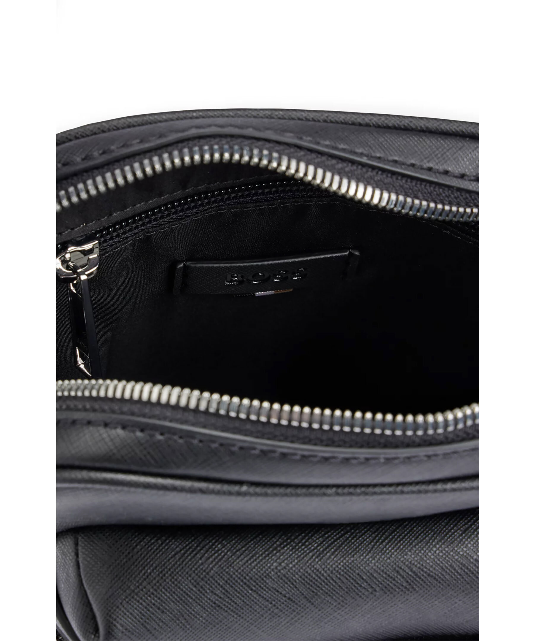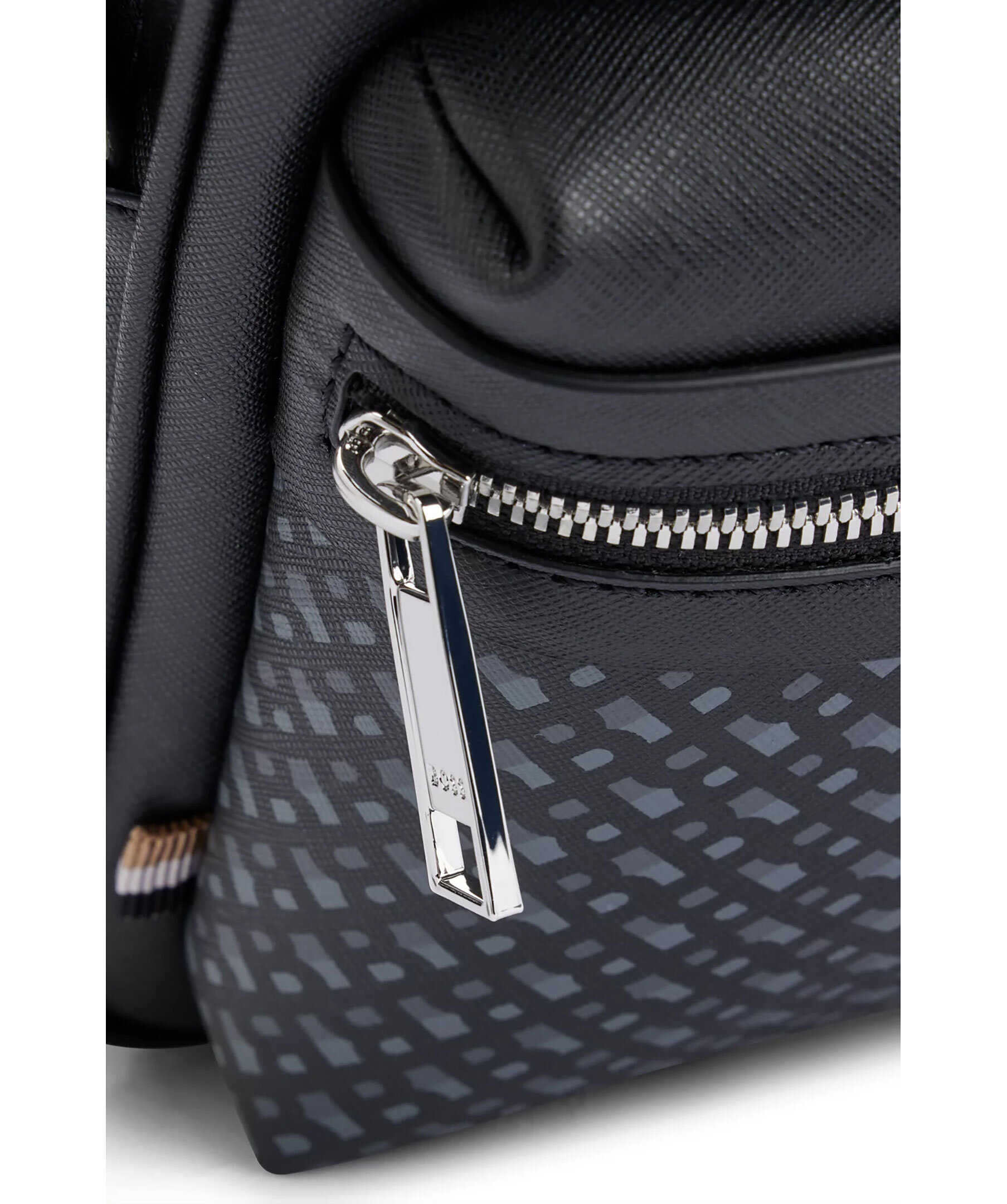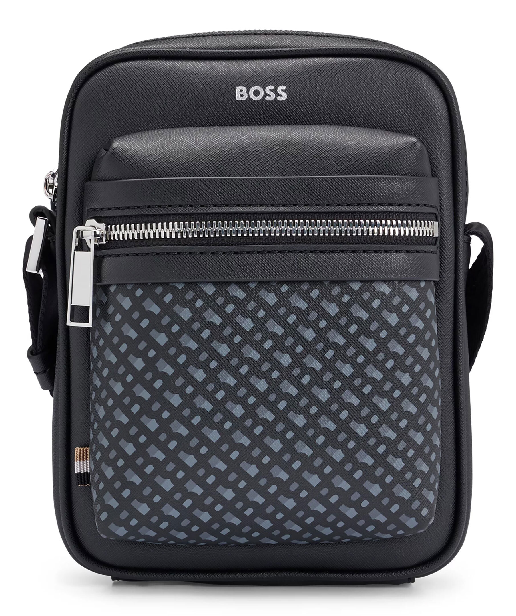 En kompakt svart reporterväska från BOSS Black. Fack på framsidan med dragkedja och monogrammönster. Stängs med dragkedja upptill. En innerficka med dragkedja. B: 16 cm D: 3,5 cm H: 21 cm.