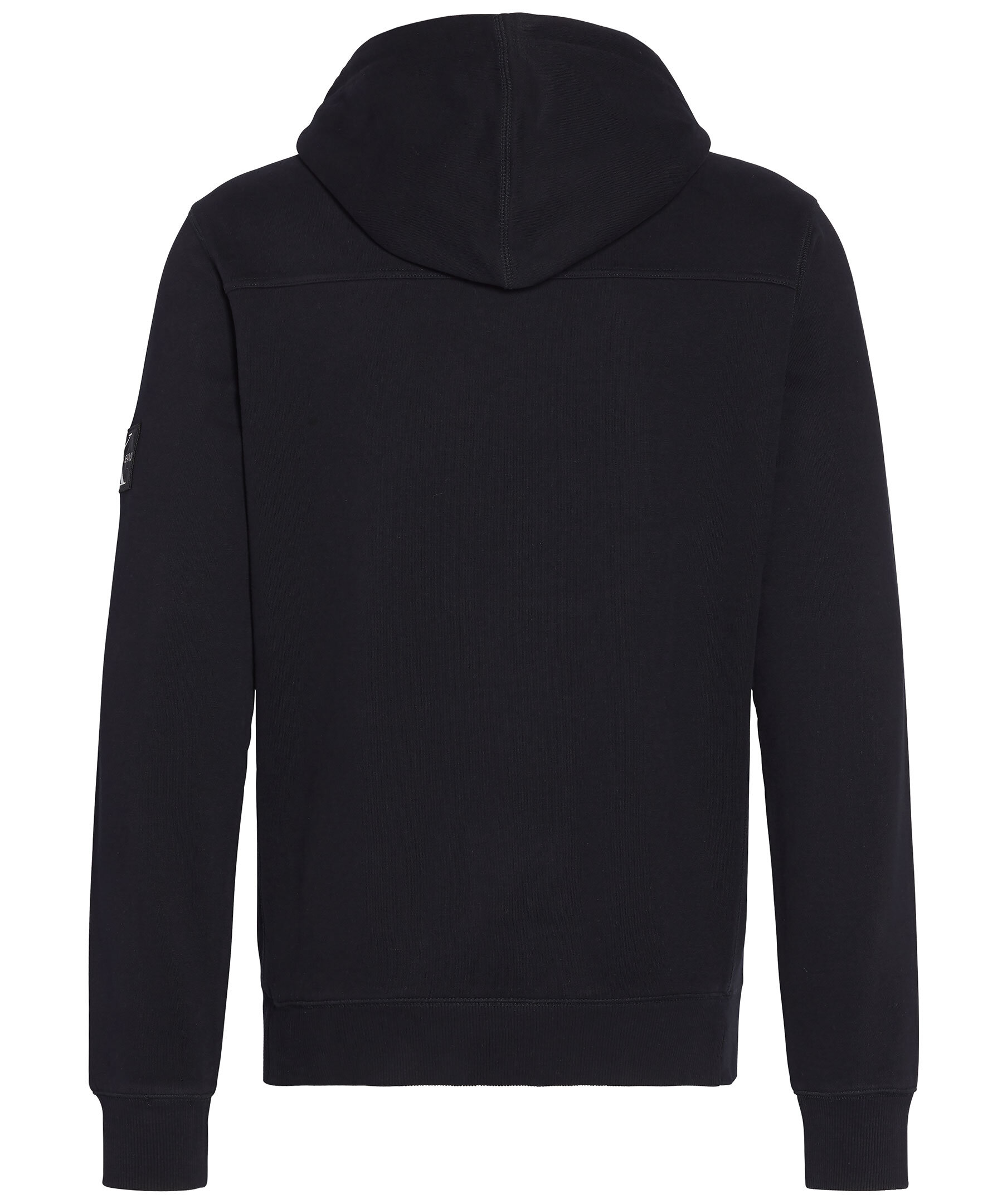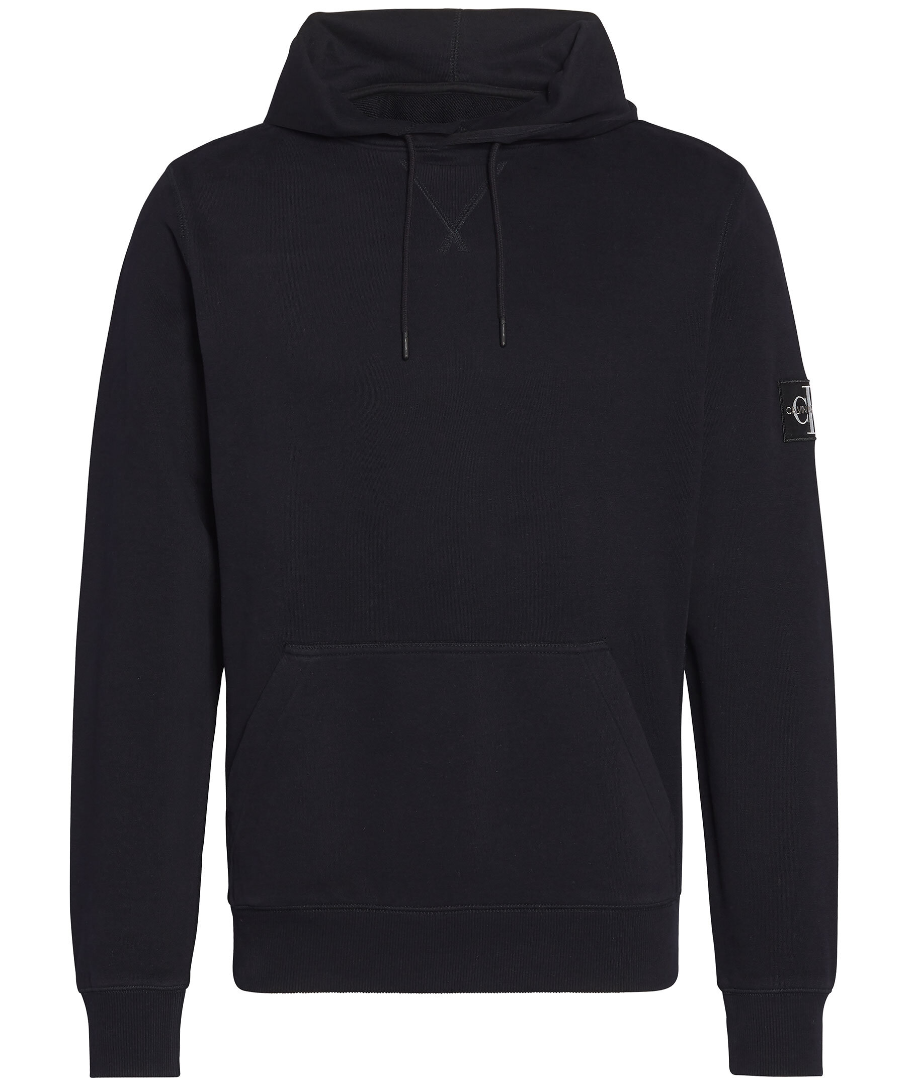 Svart hoodie från Calvin Klein. Tillverkad i 100% bomull. Normal passform, dragsko med v-insats och ribbade muddar i ärmslut och plaggslut. Känguruficka på magen, luva med dragsko och dragskoändar av metall.
