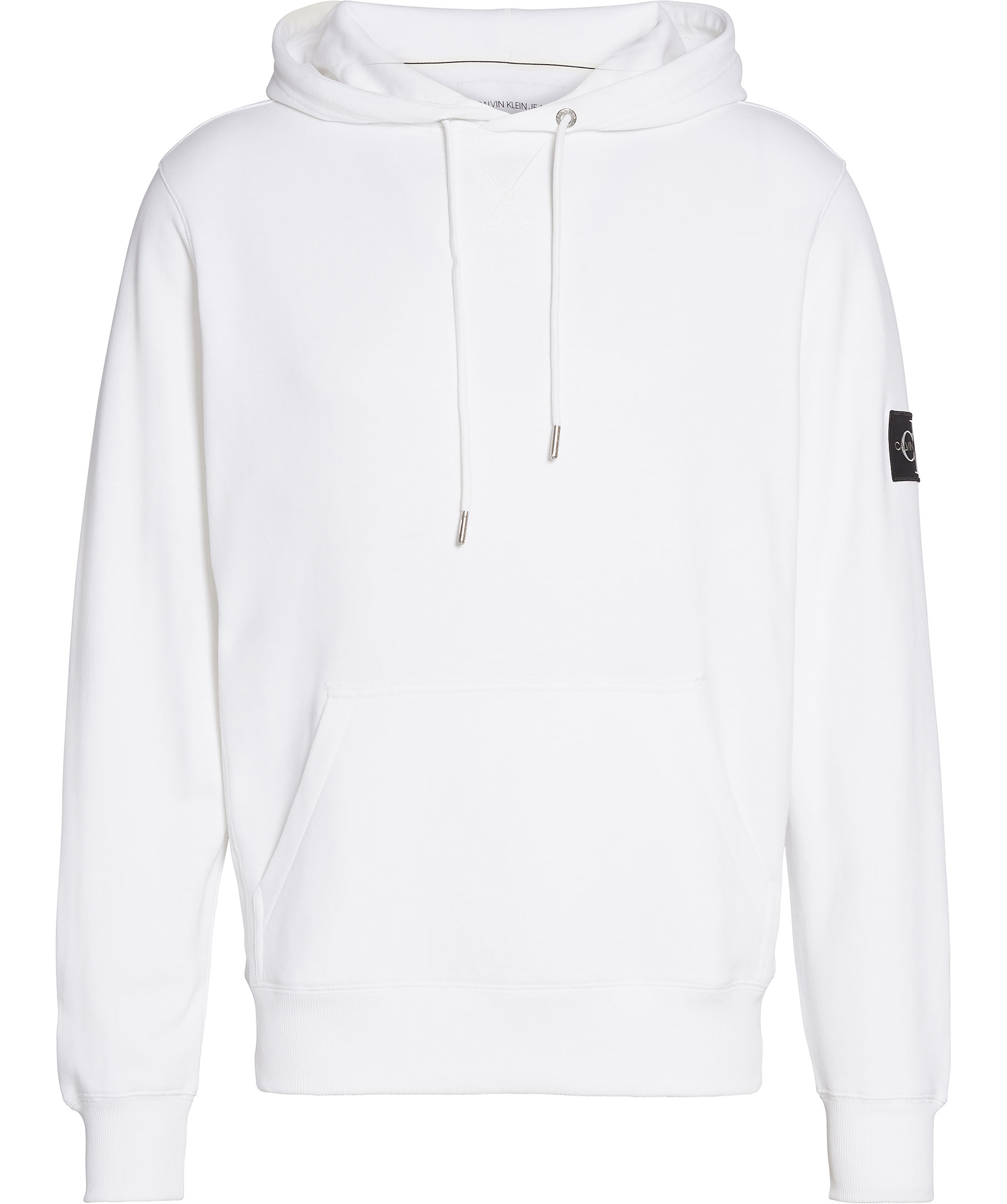 Vit hoodie från Calvin Klein. Tillverkad i bomull. Vita snören i luvan, svart patch på vänster ärm och ficka på magen.
