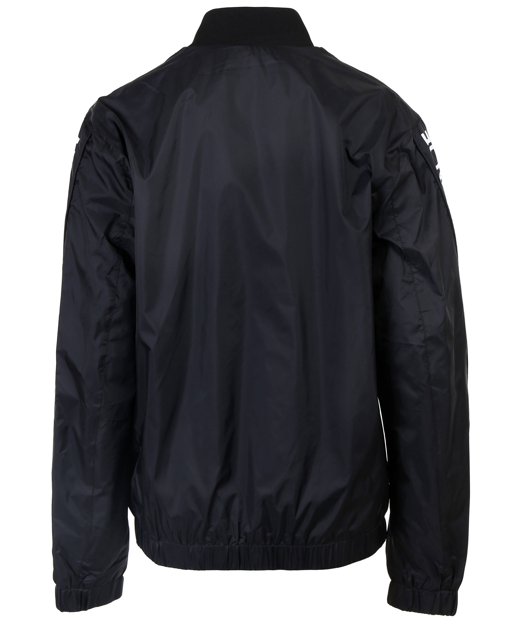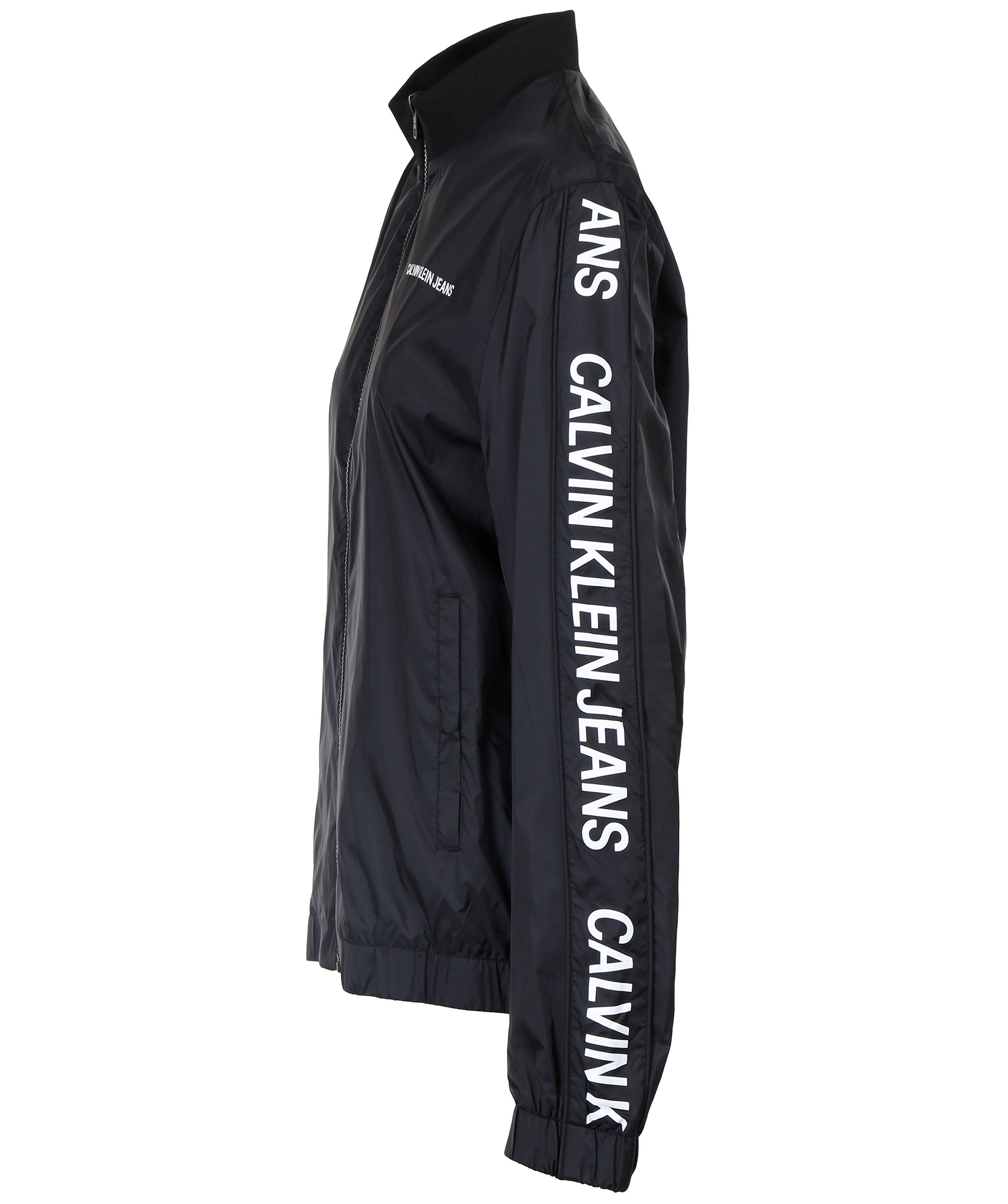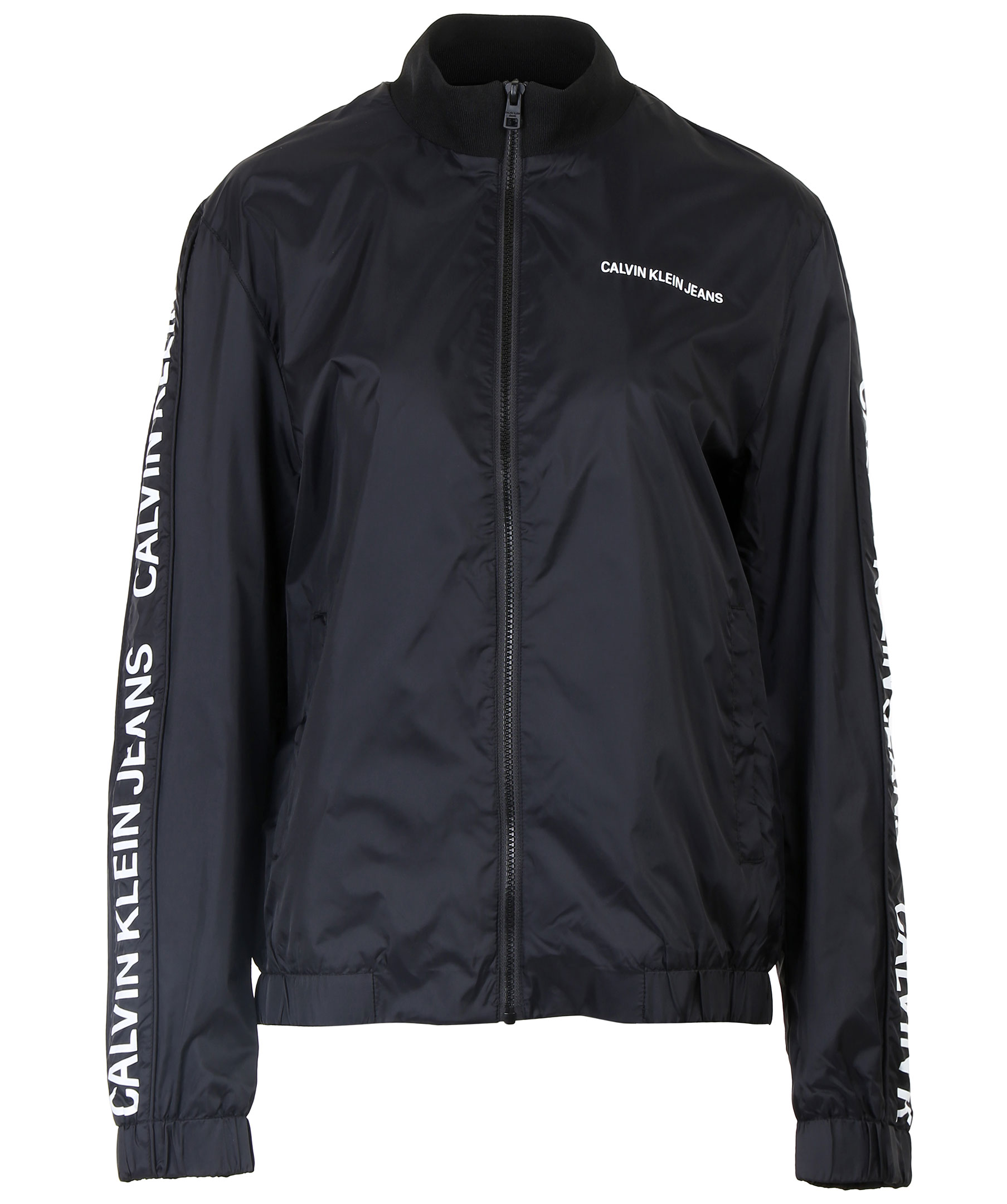 Tunn svart bomberjacka utmärkt till våren. Dekorativa revärer längst jackans armar med vit logotyp. Hög ribbstickad krage, liten logga på bröstet och två framfickor. Stängs med dragkedja. Från Calvin Klein.