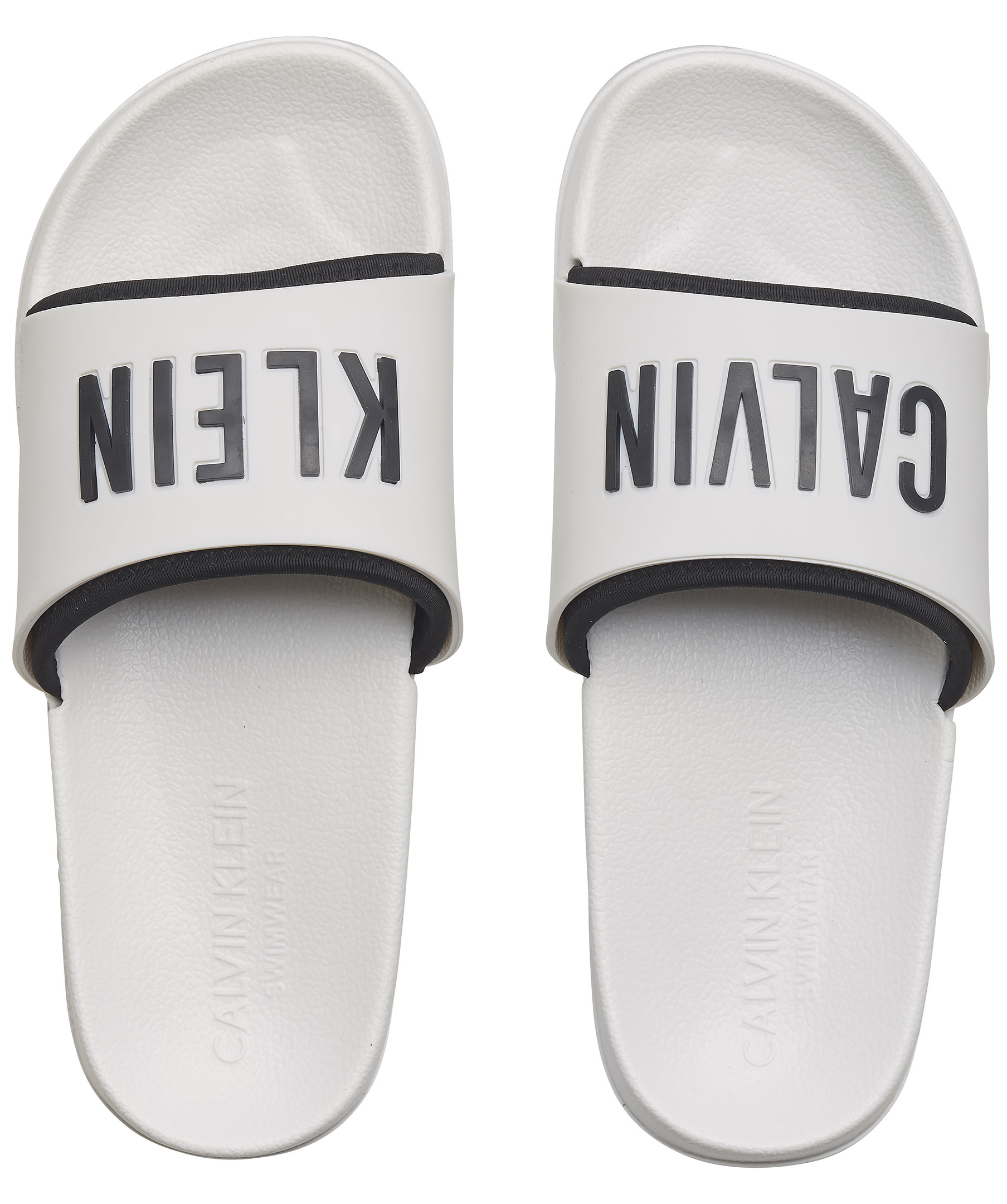 Vita badtofflor från Calvin Klein med svart utåtstående logotyp upptill. Mjukt, svart foder på insidan och vitt gummi på ovansidan. Logotyper på undersidan av sulan.