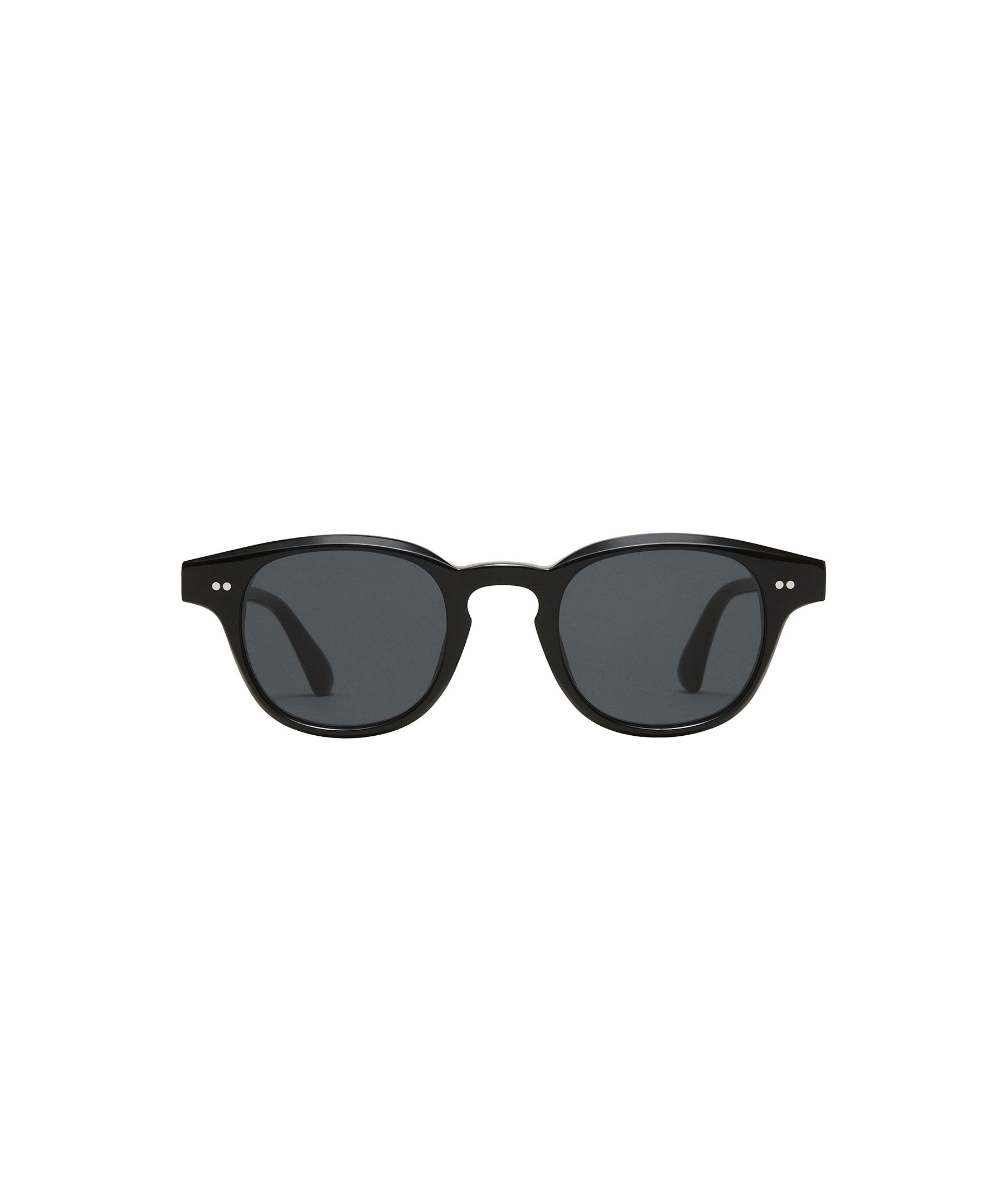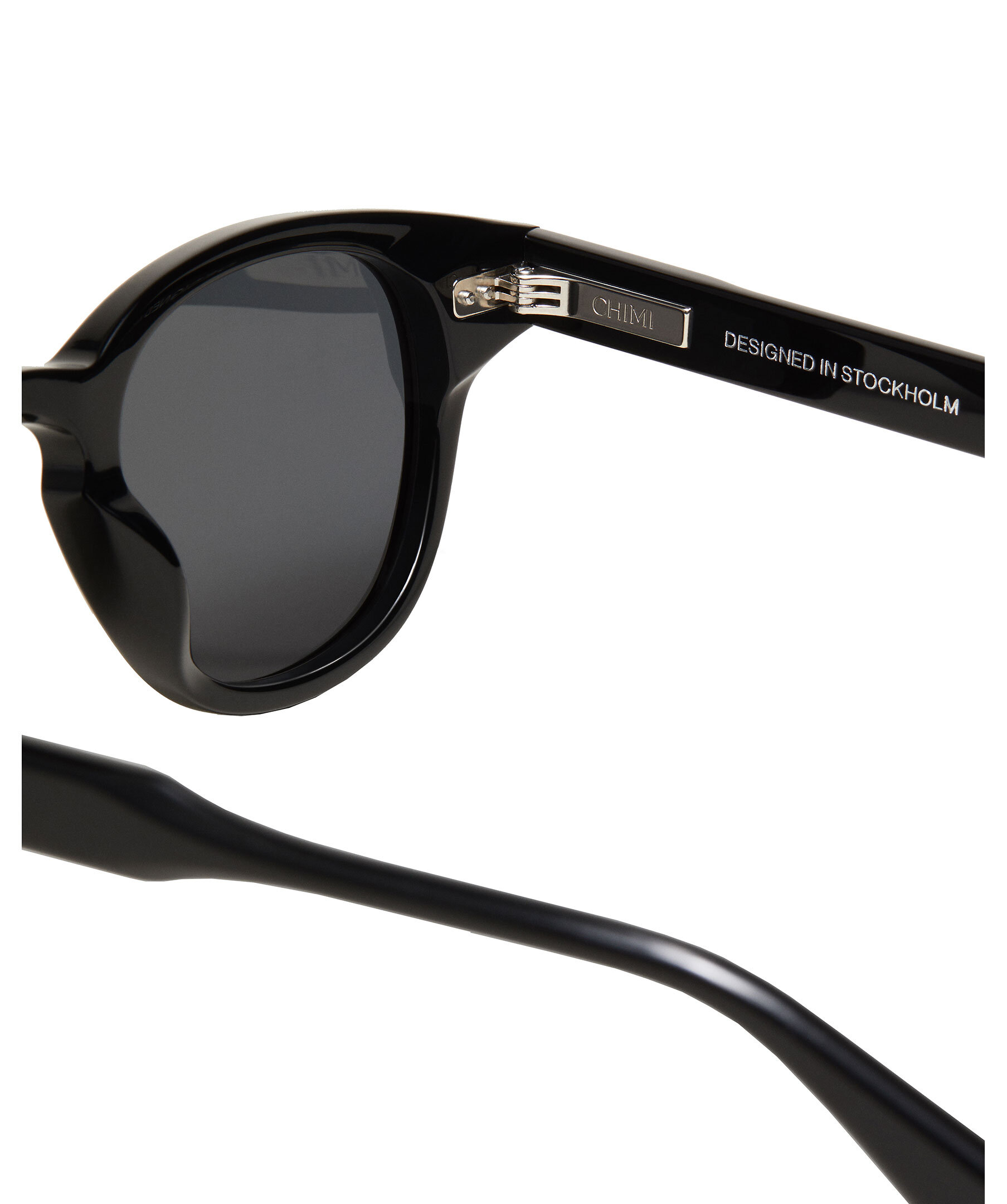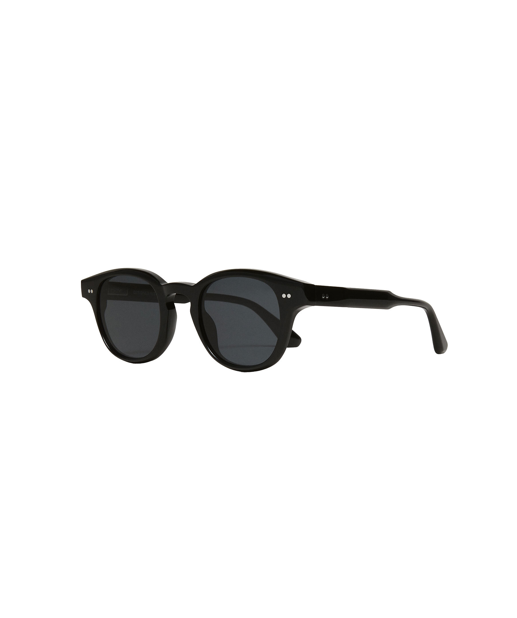 Svarta solglasögon i modell 01 från Chimi. 01 är en klassisk rundad siluett med en skulpturell tempelkonstruktion. Försedd med UV-skyddande CR39-linser, silvertonade nitgångjärn och avslutad med ett fasat bryn för en elegant profil.