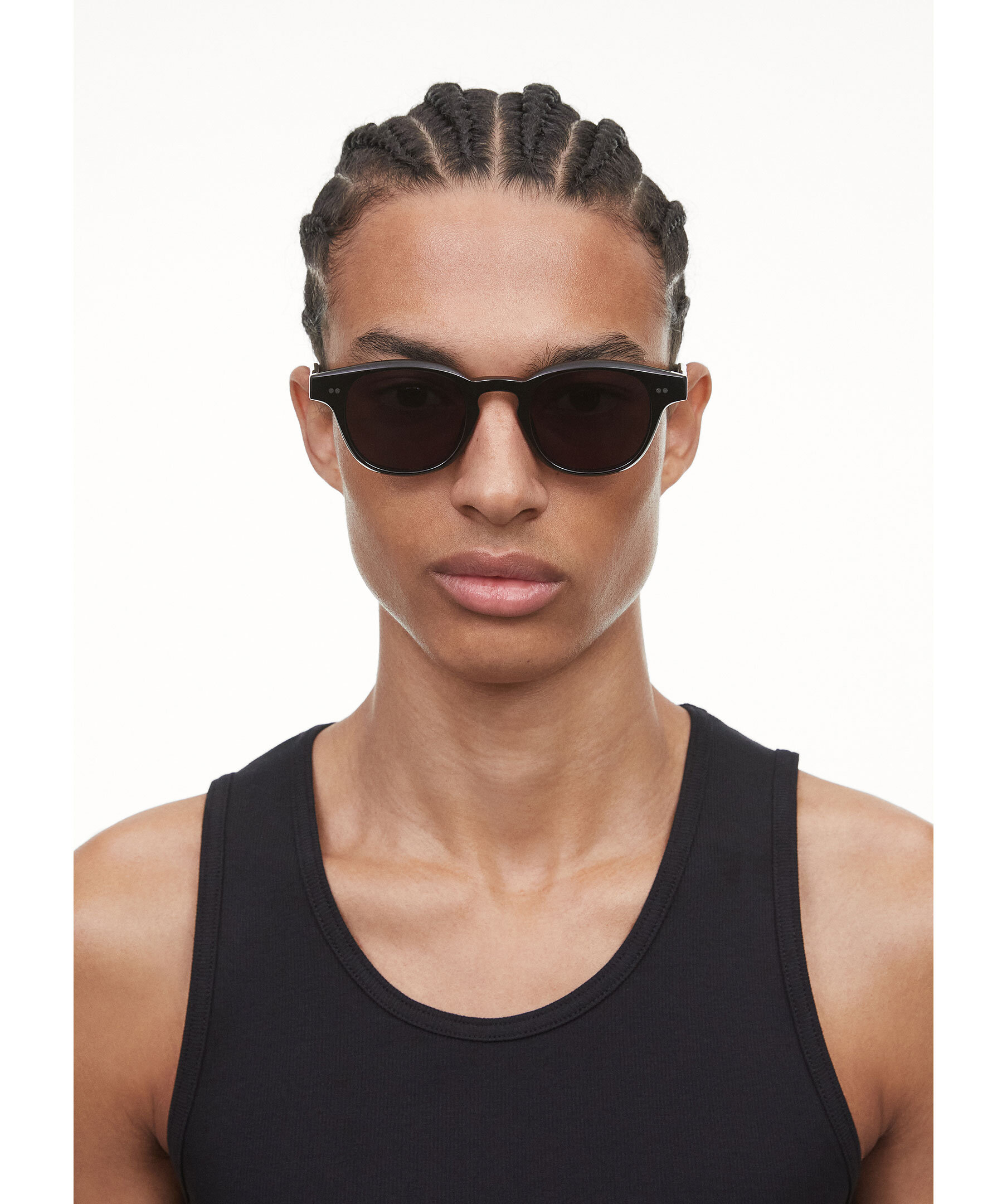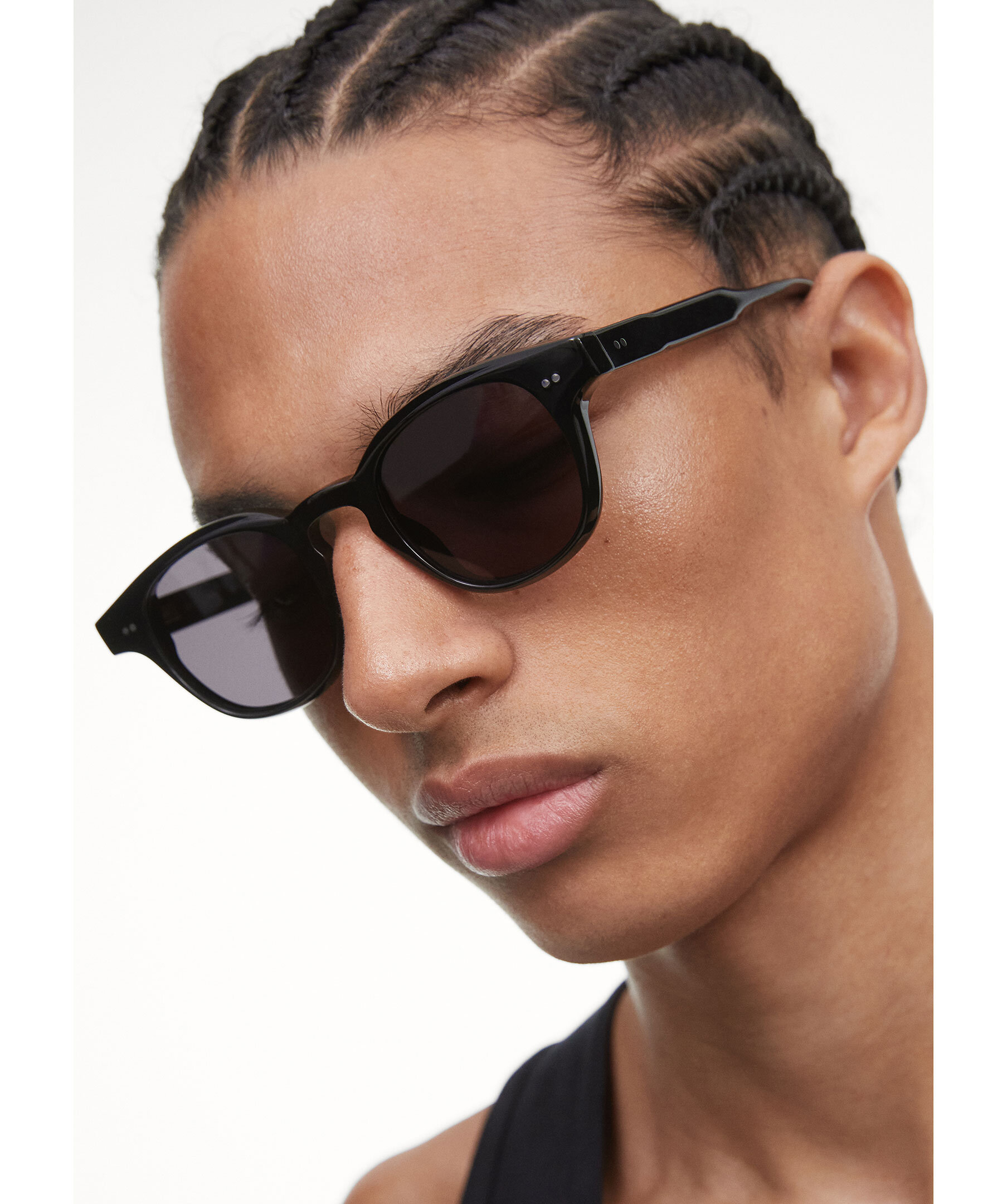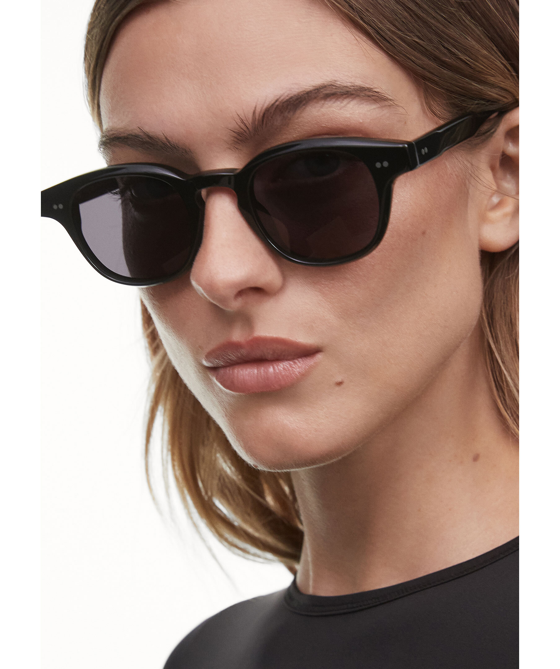 Svarta solglasögon i modell 01 från Chimi. 01 är en klassisk rundad siluett med en skulpturell tempelkonstruktion. Försedd med UV-skyddande CR39-linser, silvertonade nitgångjärn och avslutad med ett fasat bryn för en elegant profil.