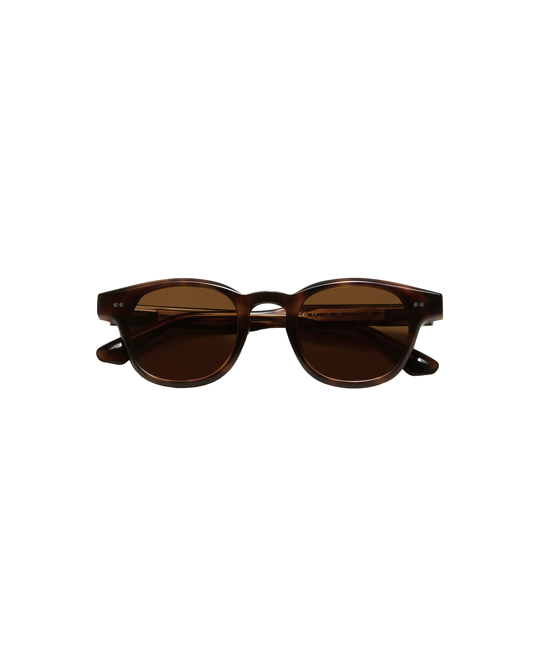 Bruna solglasögon med ett sköldpaddsliknande mönster i modell 01 från Chimi. 01 är en klassisk rundad siluett med en skulpturell tempelkonstruktion. Försedd med UV-skyddande CR39-linser, silvertonade nitgångjärn och avslutad med ett fasat bryn för en elegant profil.