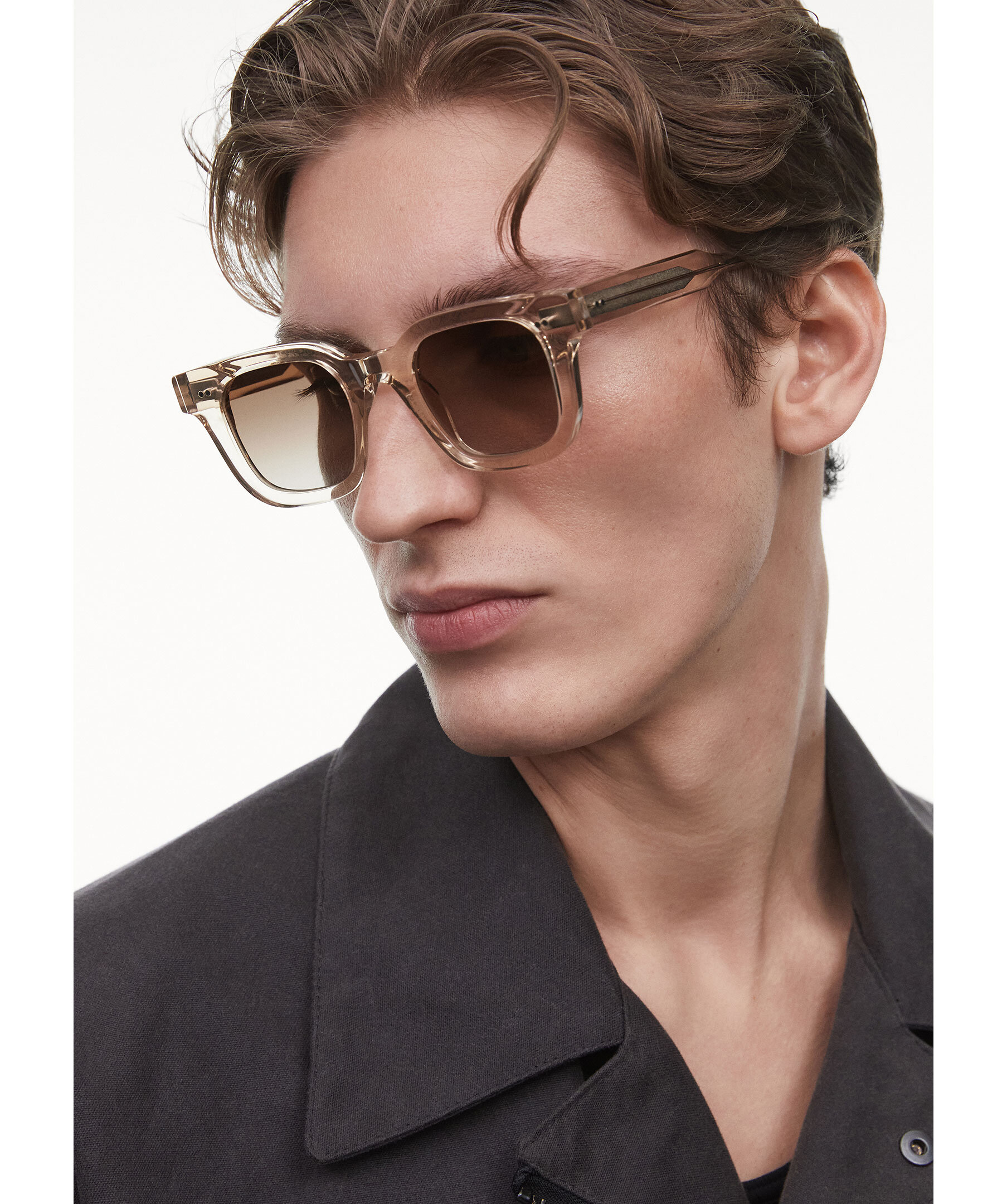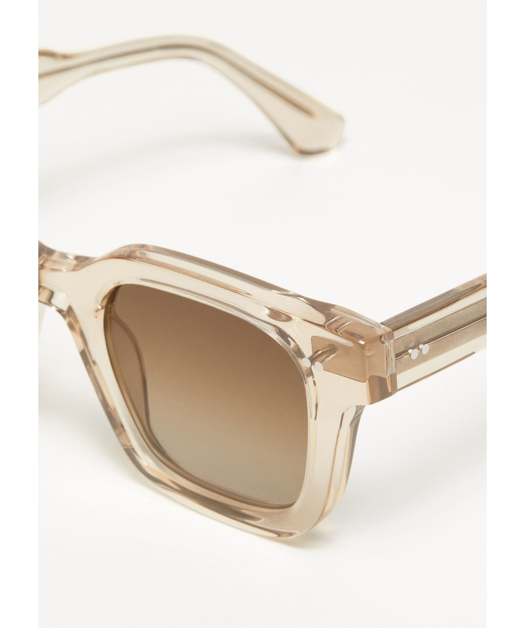 Beigea, transparenta solglasögon i modell 04 från Chimi. 04 är en stilistisk siluett som skapar dynamisk kontrast med en stark rektangulär ram och smala sidor. Färdig med silverfärgade nitgångjärn och djupa fasade snitt längs de UV-skyddande, platta CR39-linserna.