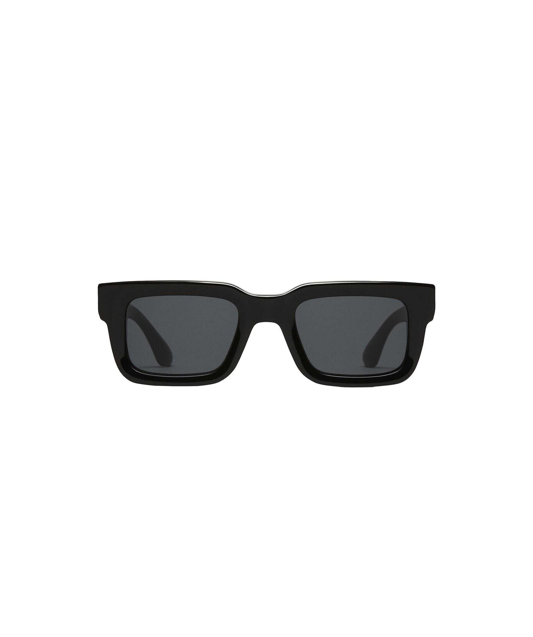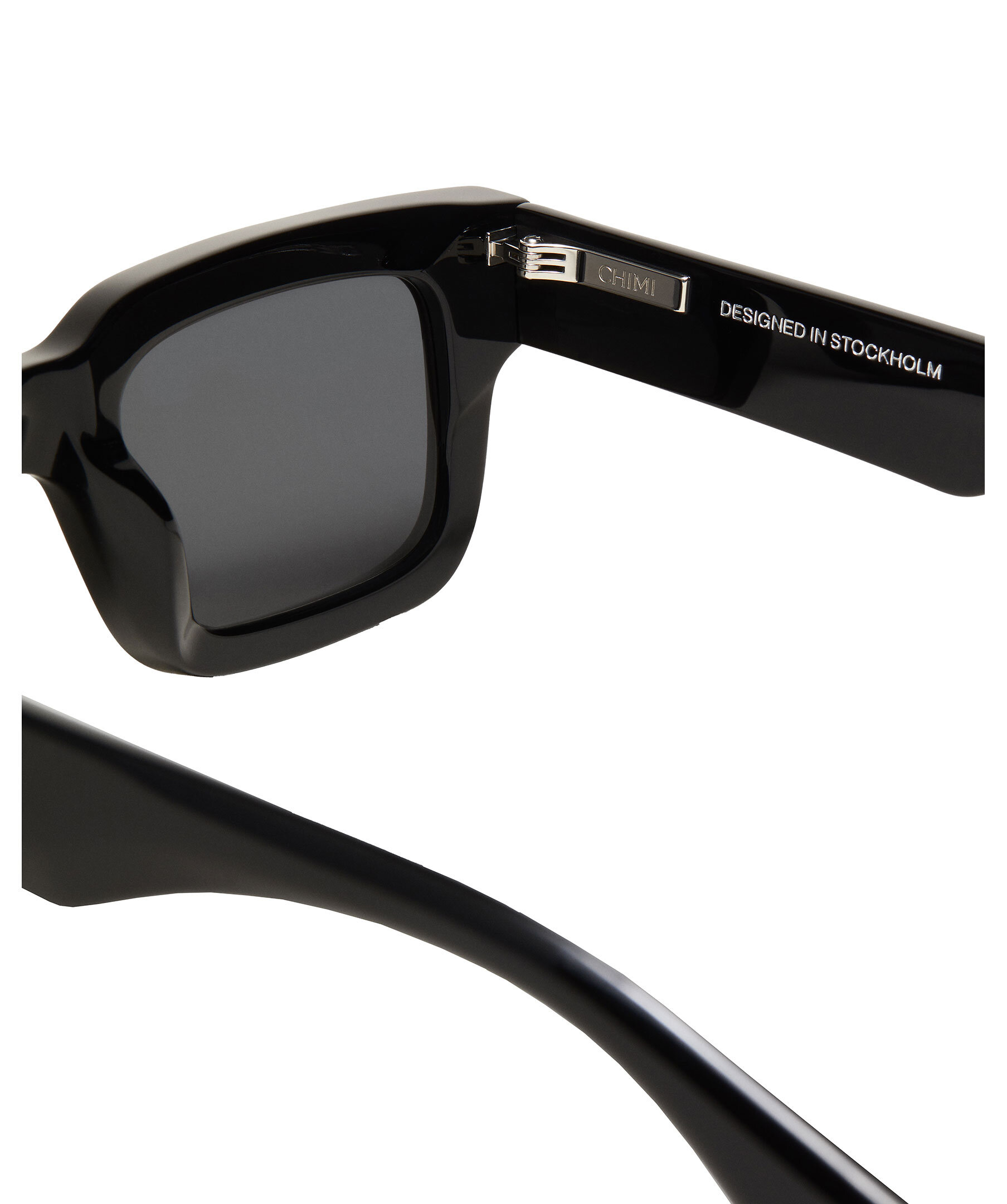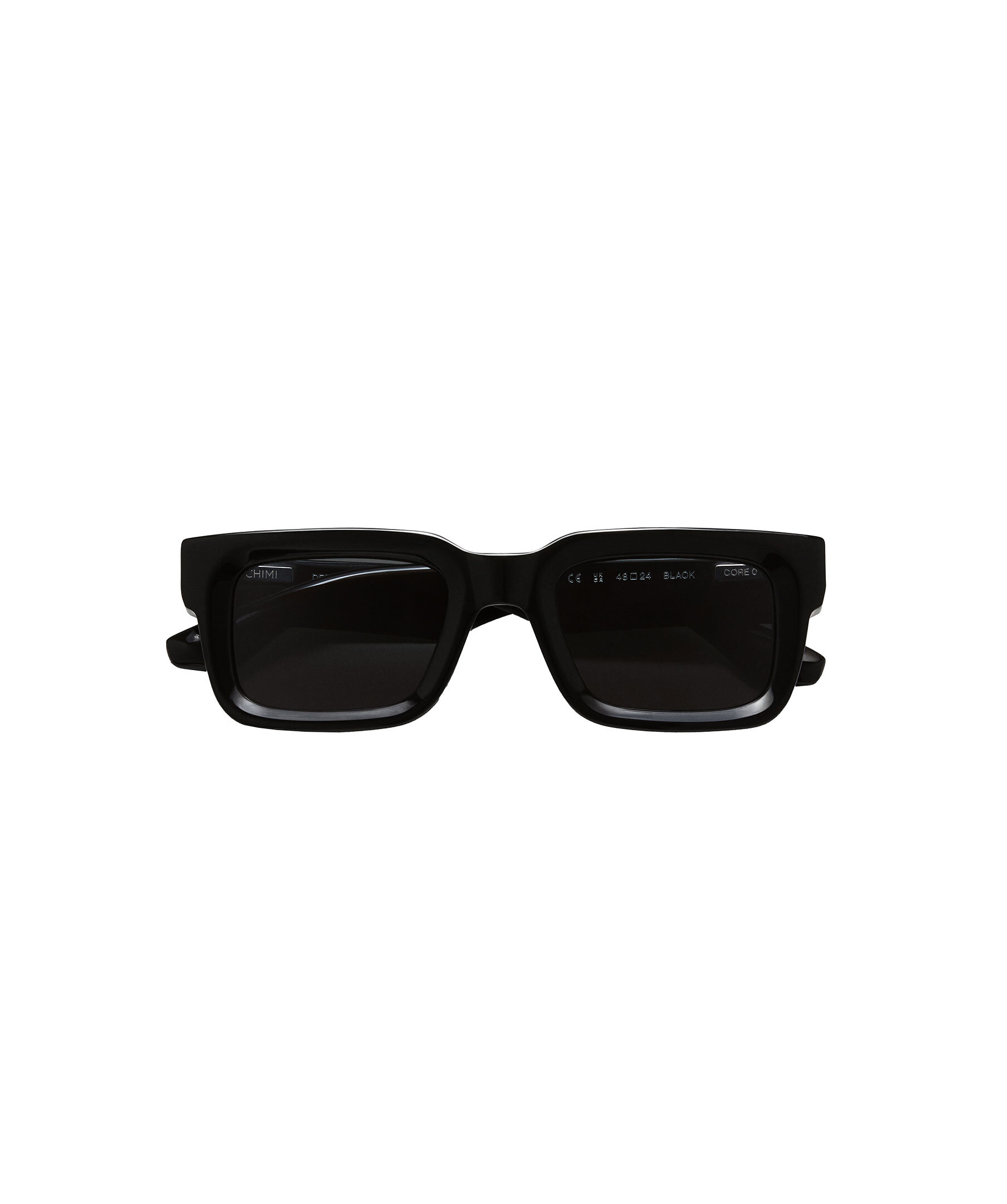 Svarta solglasögon i modell 05 från Chimi. 05 är en strukturell kvadratisk siluett med tonvikt på arkitektoniska vinklar. Den minimalistiska ramen har distinkta linjära avfasningar vid skalmarna för en sartorisk look. Försedd med UV-skyddande CR39-linser.