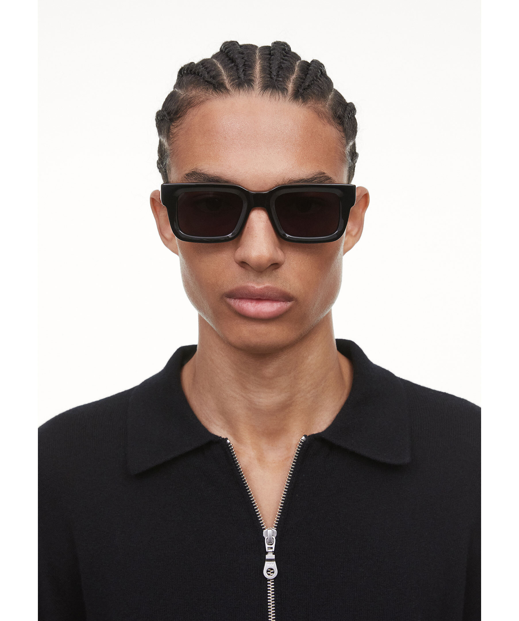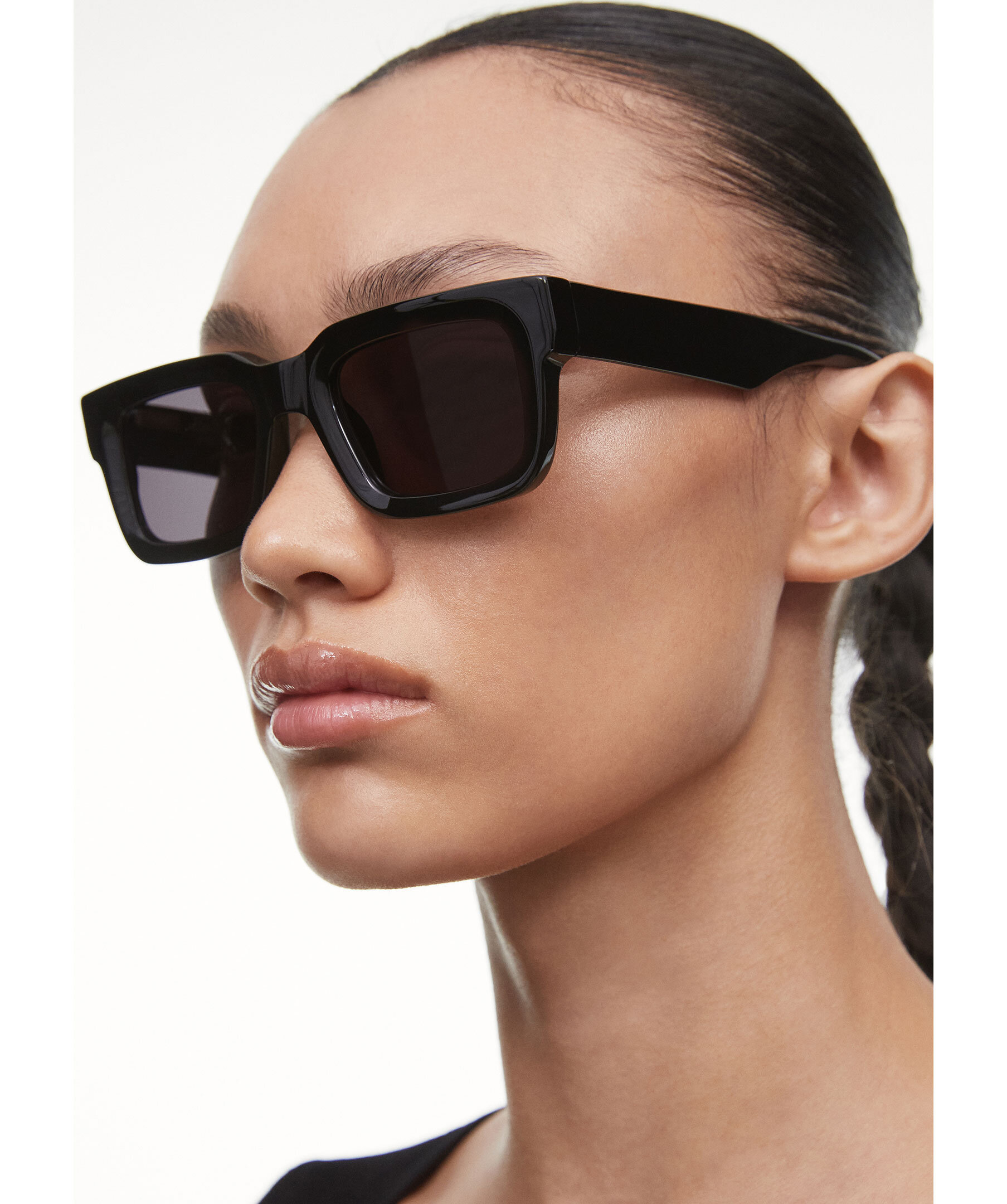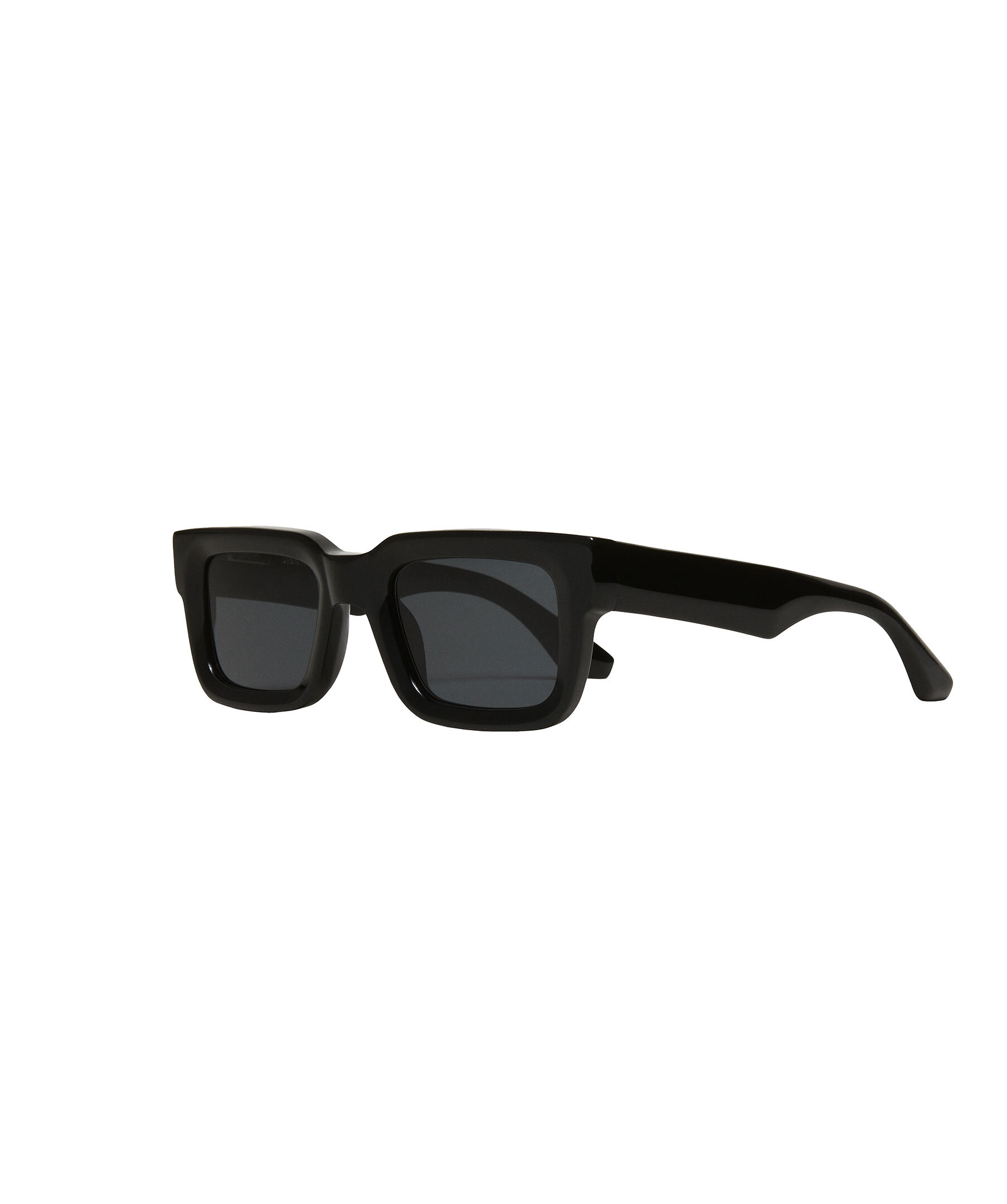 Svarta solglasögon i modell 05 från Chimi. 05 är en strukturell kvadratisk siluett med tonvikt på arkitektoniska vinklar. Den minimalistiska ramen har distinkta linjära avfasningar vid skalmarna för en sartorisk look. Försedd med UV-skyddande CR39-linser.