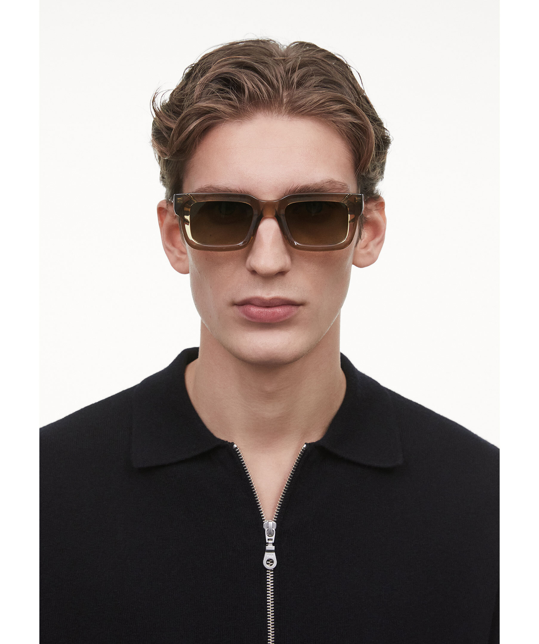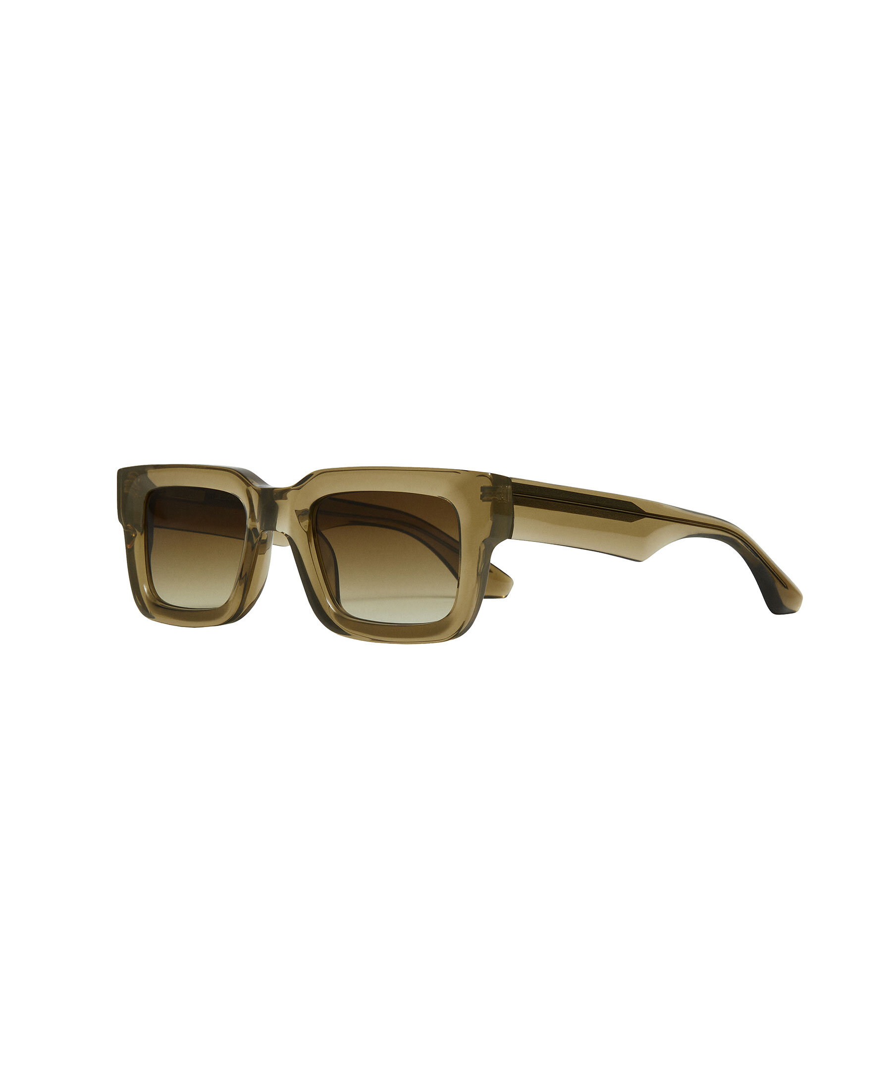 Gröna, transparenta solglasögon i modell 05 från Chimi. 05 är en strukturell kvadratisk siluett med tonvikt på arkitektoniska vinklar. Den minimalistiska ramen har distinkta linjära avfasningar vid skalmarna för en sartorisk look. Försedd med UV-skyddande CR39-linser.