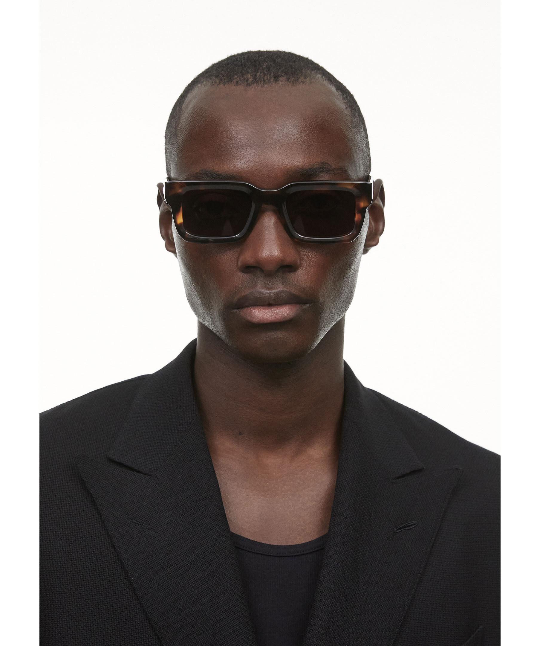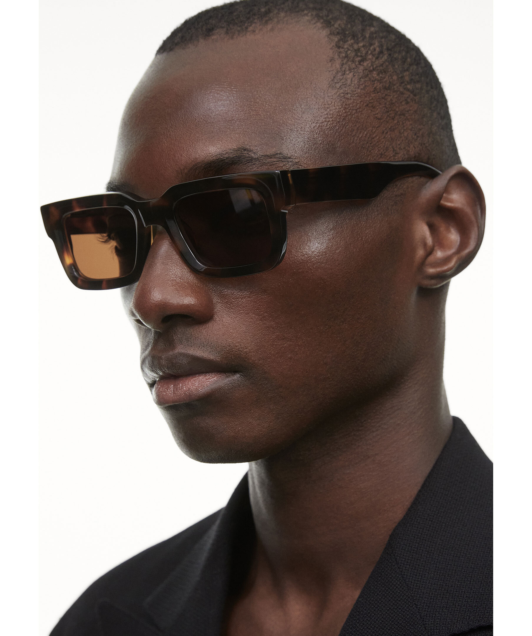 Bruna solglasögon med ett sköldpaddsliknande mönster i modell 05 från Chimi. 05 är en strukturell kvadratisk siluett med tonvikt på arkitektoniska vinklar. Den minimalistiska ramen har distinkta linjära avfasningar vid skalmarna för en sartorisk look. Försedd med UV-skyddande CR39-linser.