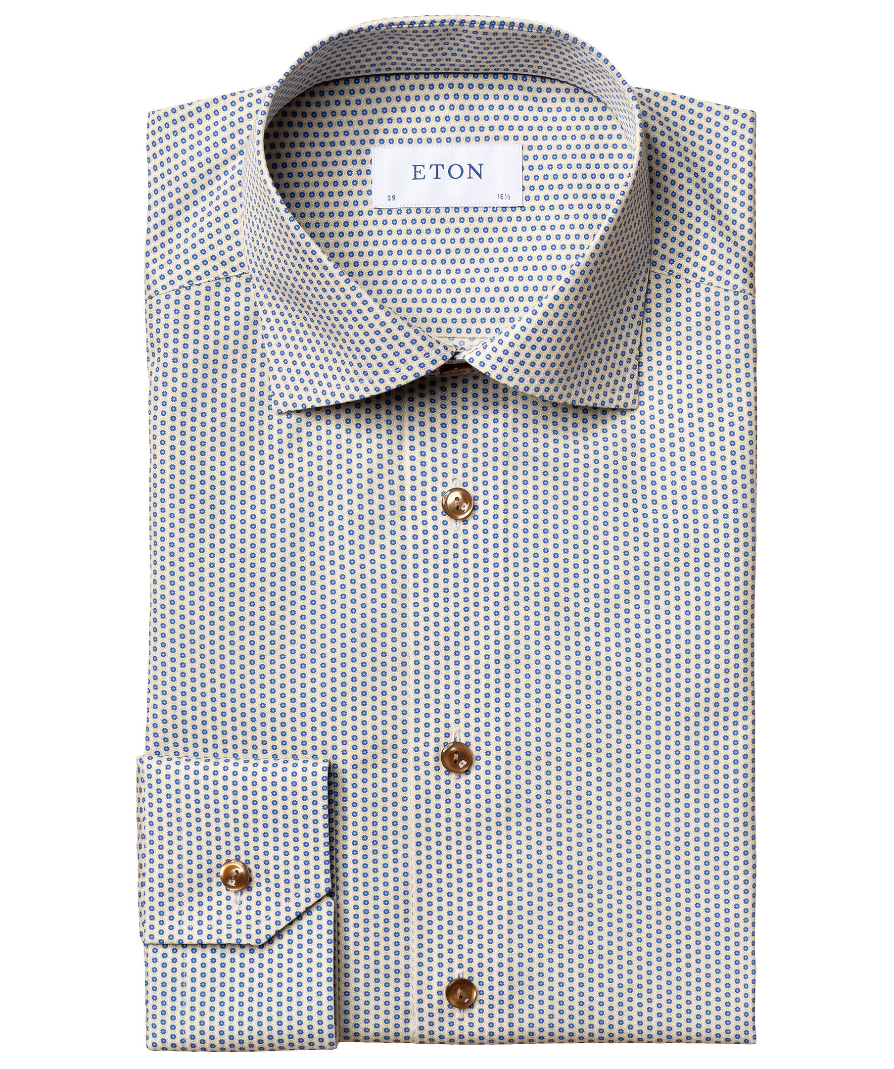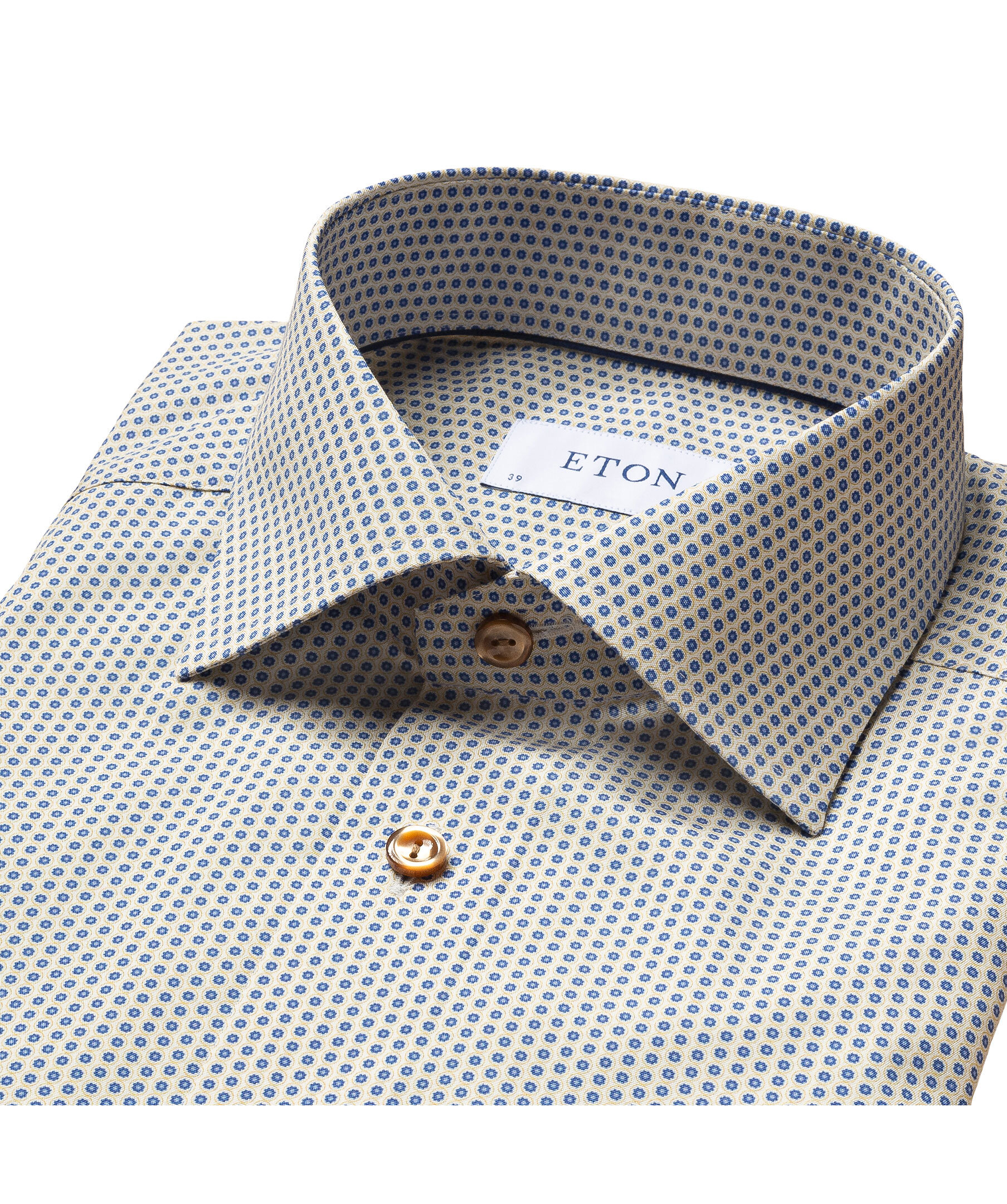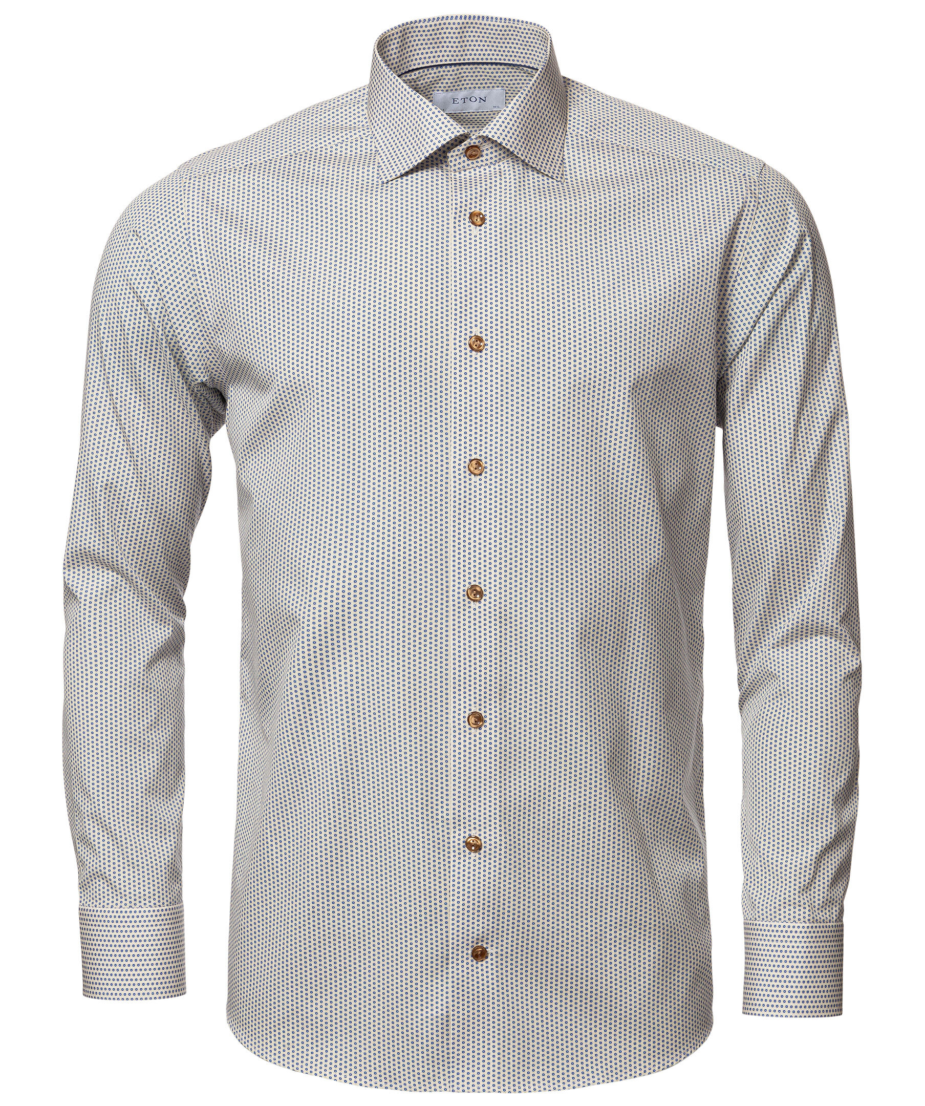 Geometriskt mönstrad skjorta från Eton. Contemporary fit, marinblå knappar, cut away krage.