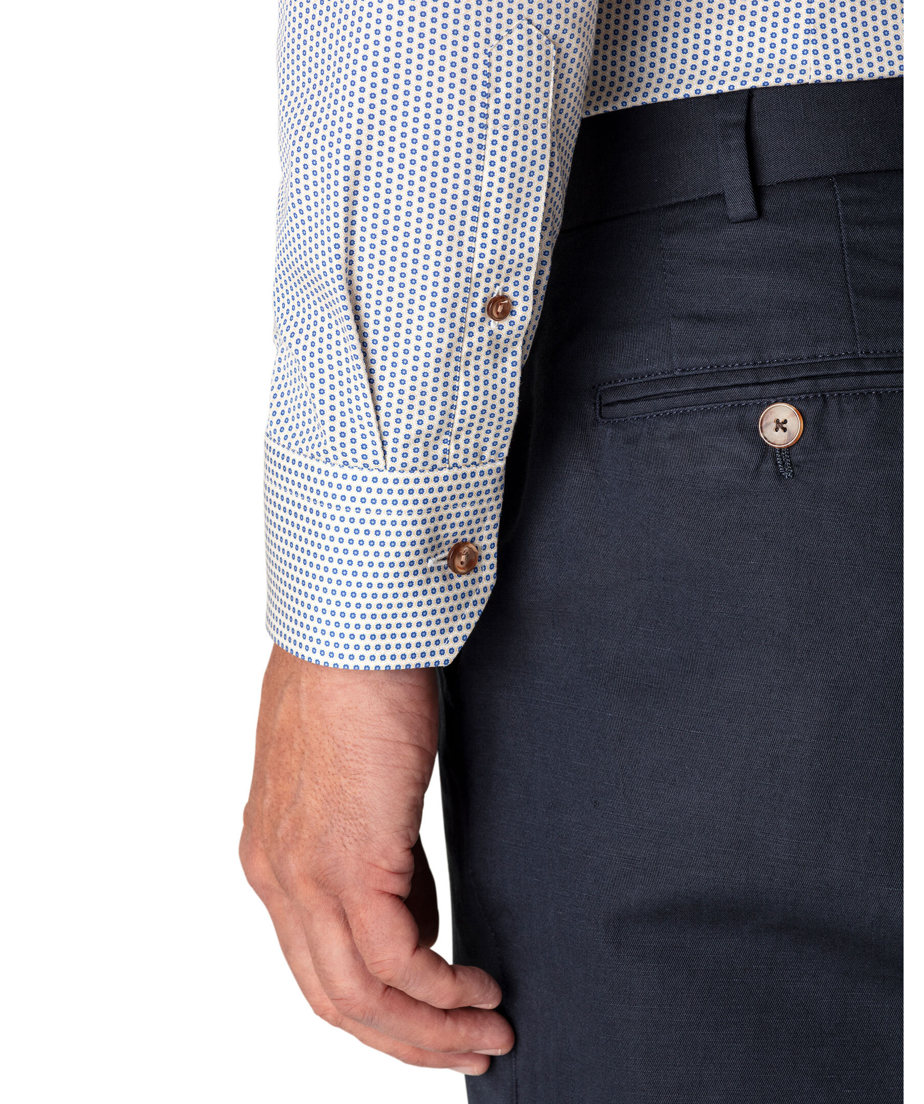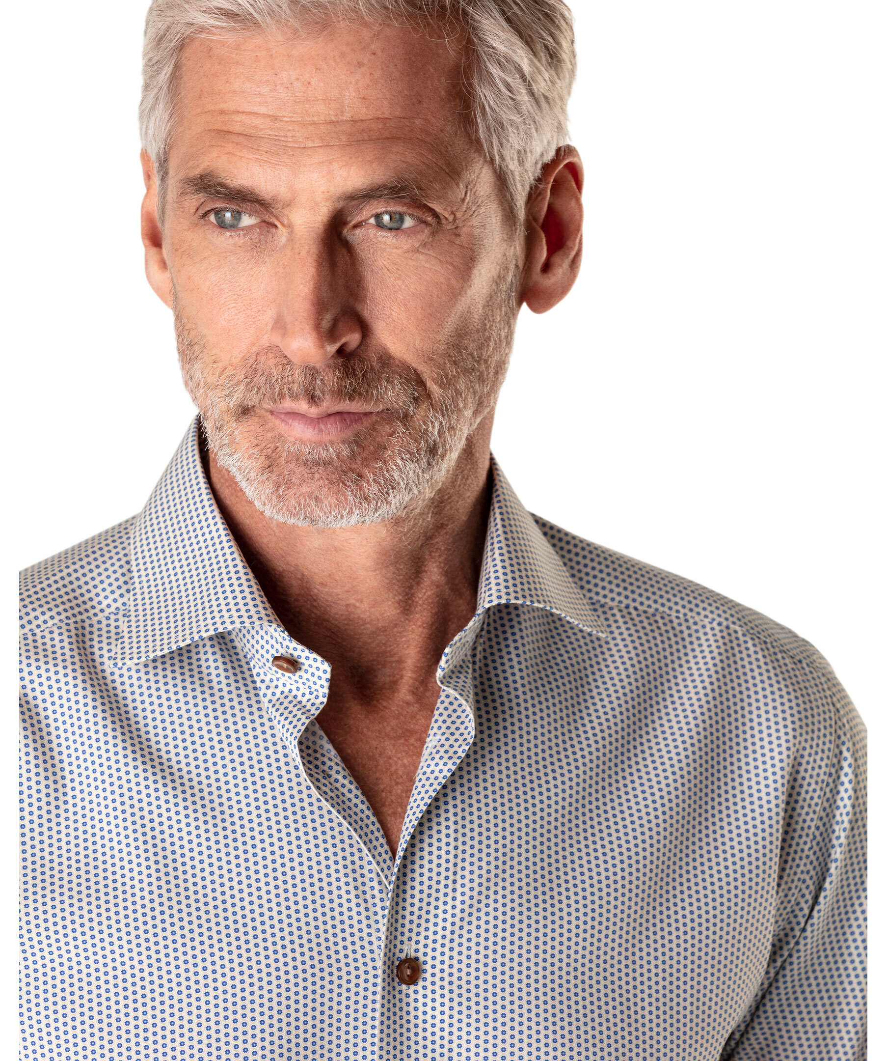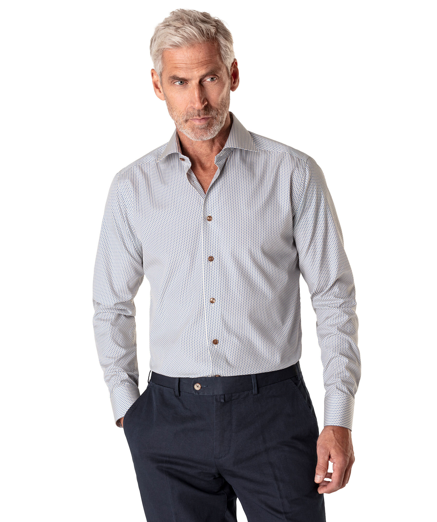 Geometriskt mönstrad skjorta från Eton. Contemporary fit, marinblå knappar, cut away krage.