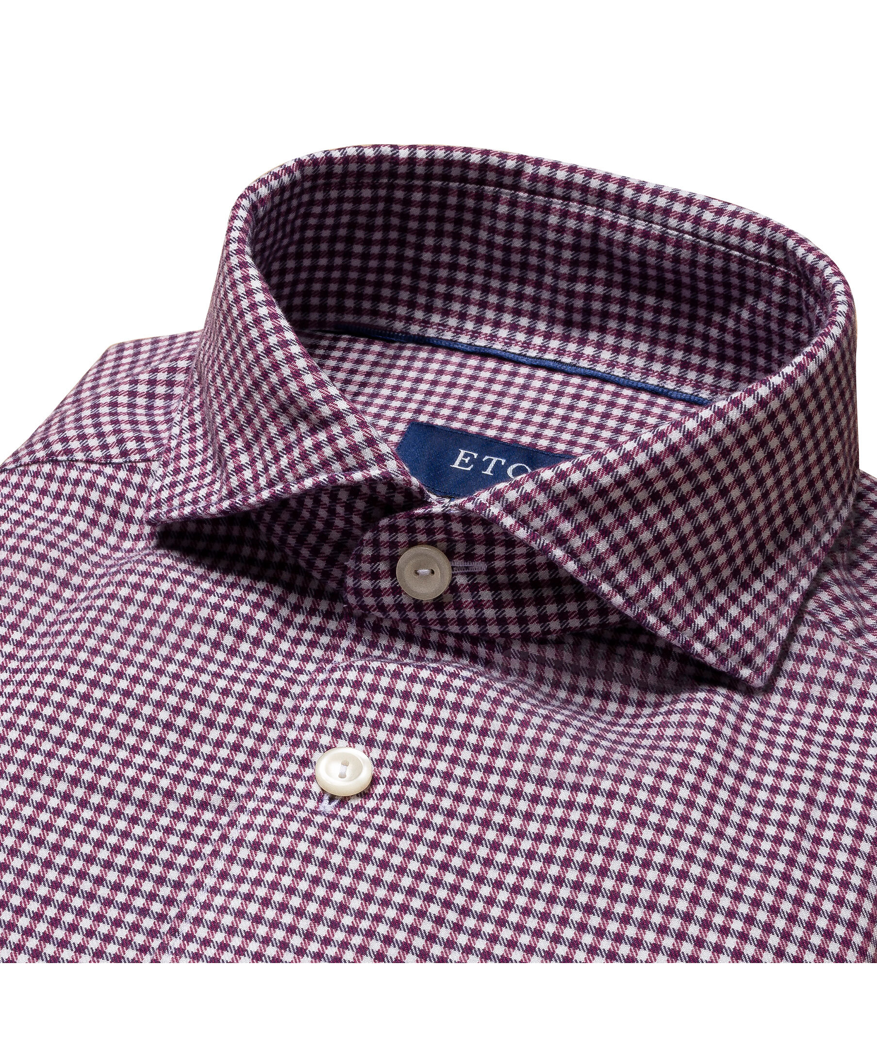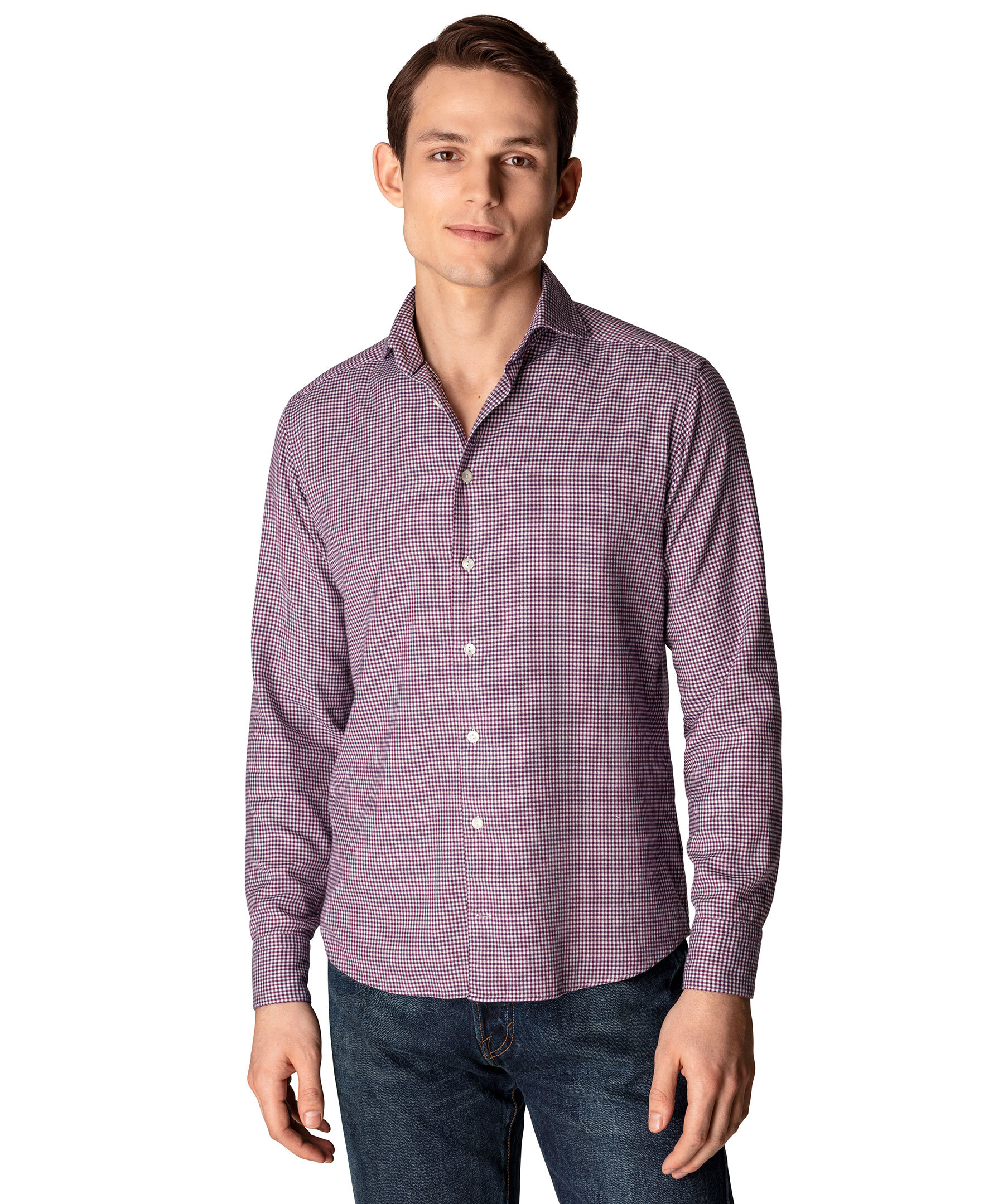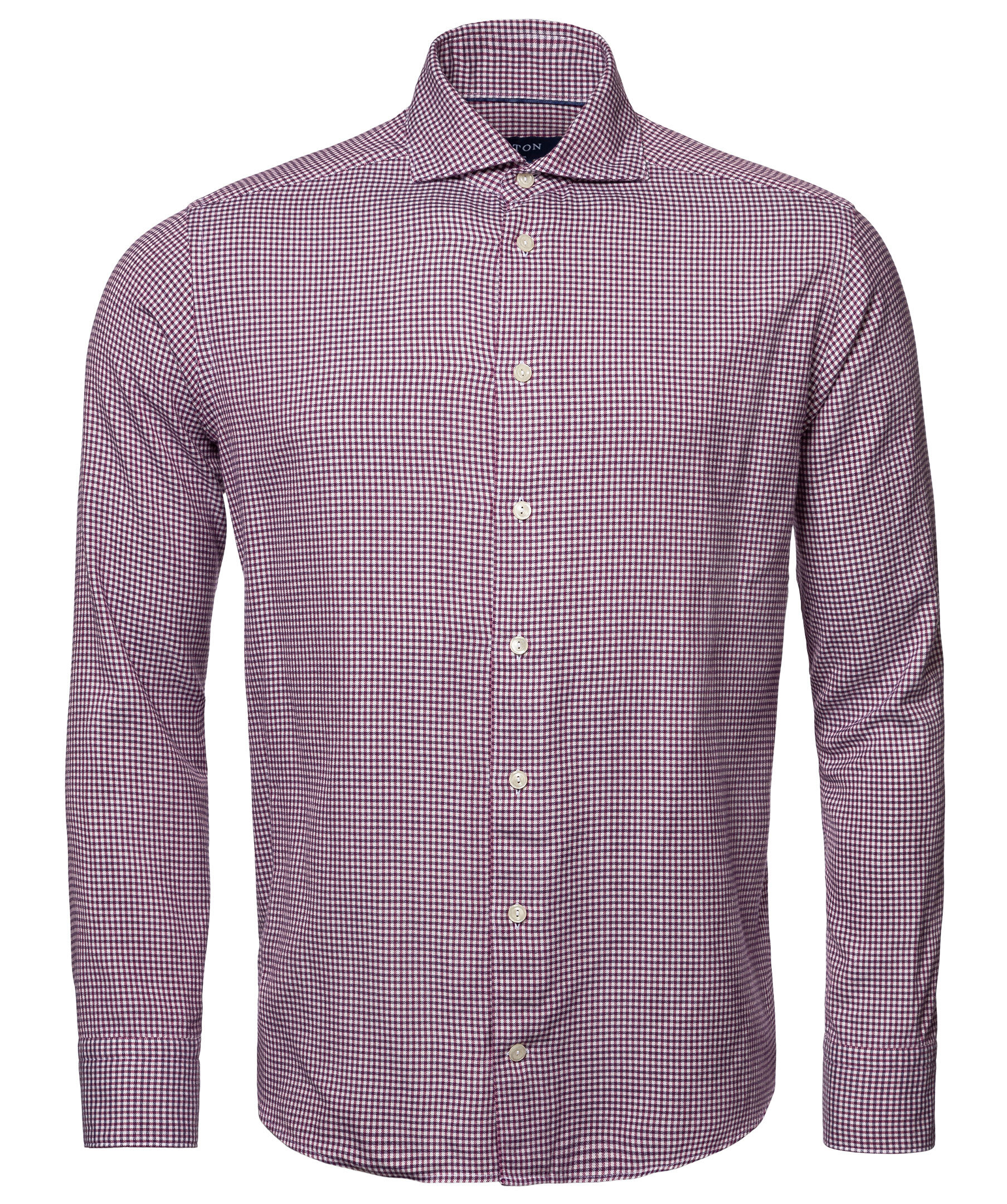 Vinröd och vit flanellskjorta i ett litet rutigt mönster från Eton. Ett avslappnat plagg i mjuk och silkeslen bomull-Tencel™ som förhöjer casual- och business casual-stilen. Den förfinade texturen i säsongens färger och det klassiska rutmönstret ger en skjorta som passar riktigt bra både på jobbet och på fritiden. Smal men inte åtsittande.