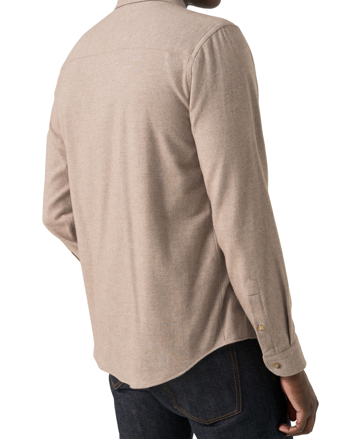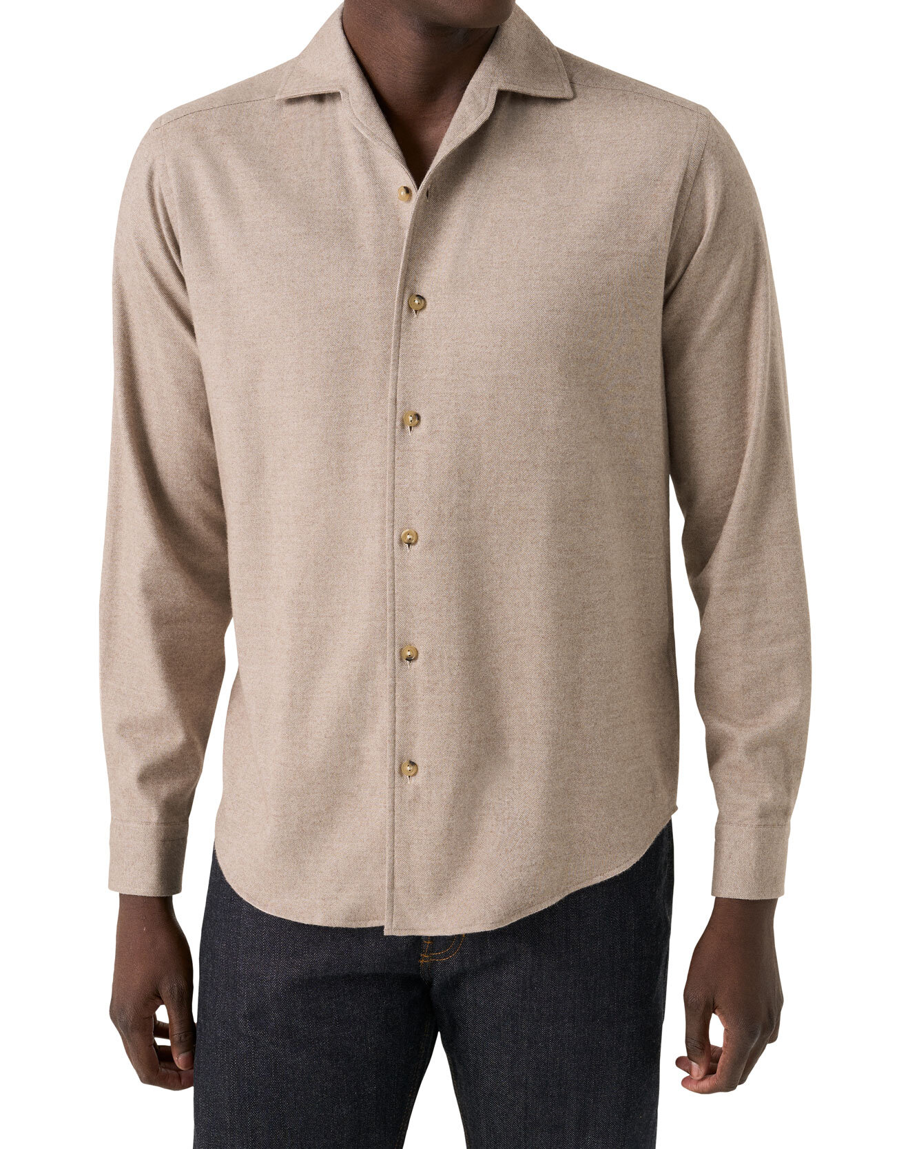 En casualskjorta i 100 % bomullsflanell, vävd i Italien av dubbeltvinnat garn och mjukt borstad för en oerhört mjuk och kashmirliknande känsla. Den solida designen framhäver twillstrukturen och de fylliga melange-tonerna. Skjortan har benfärgade knappar, spread-krage och böjd fåll. Passformen är Casual Fit, vilket gör den lätt att styla, både instoppad och oinstoppad.