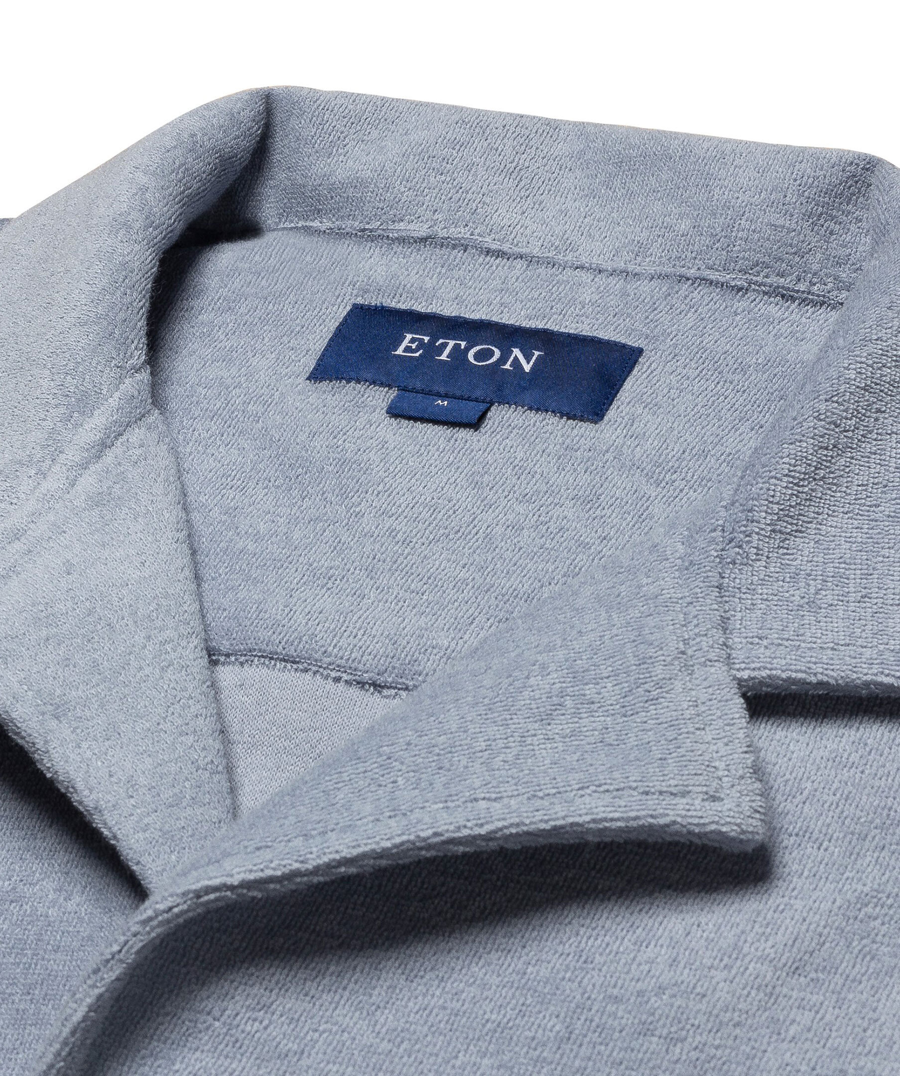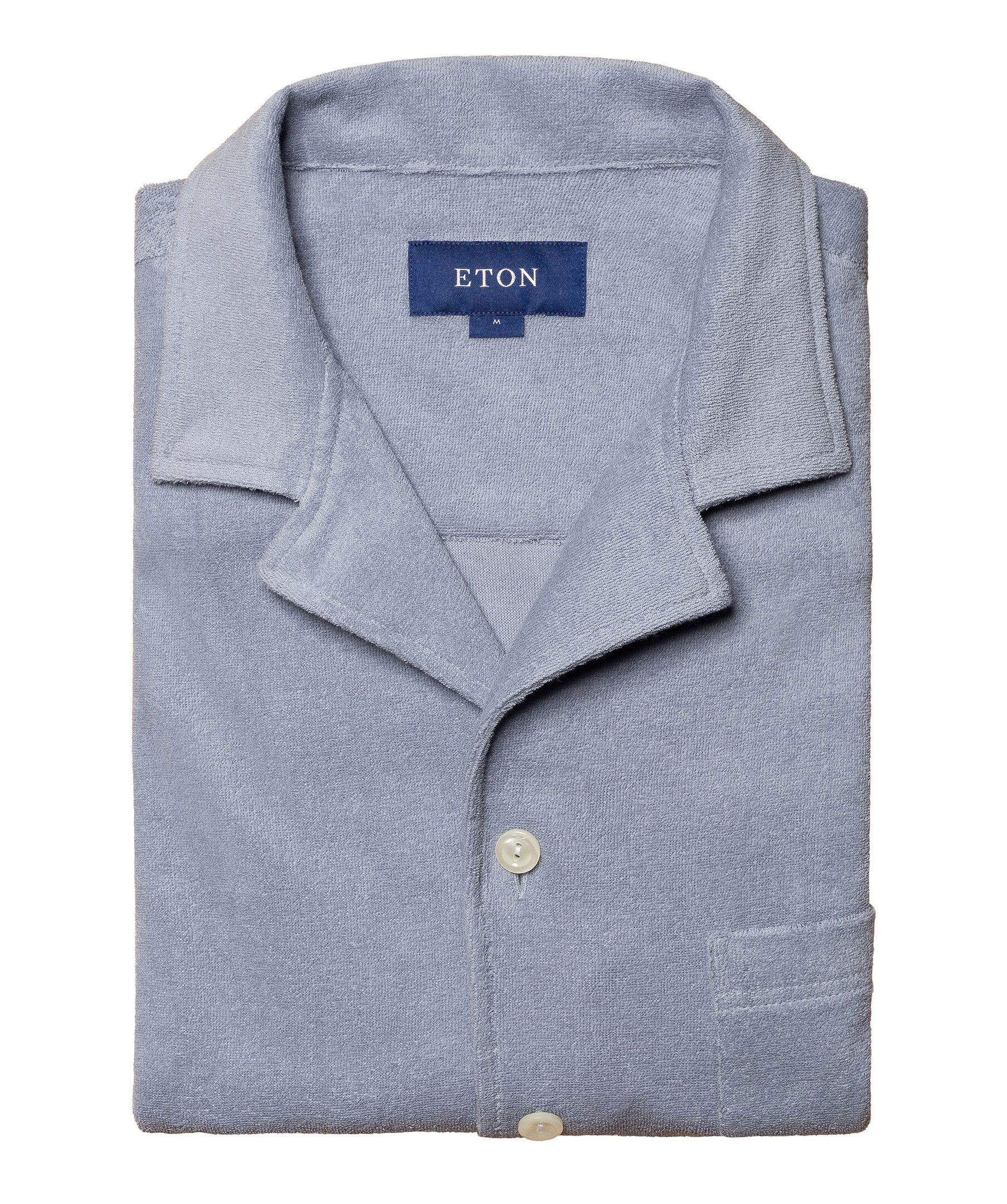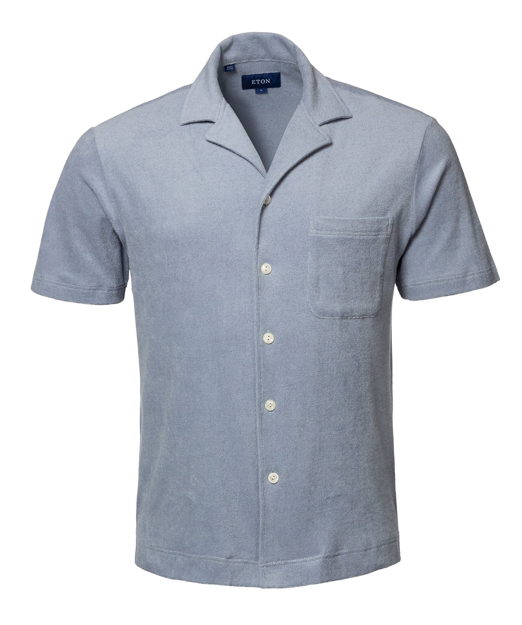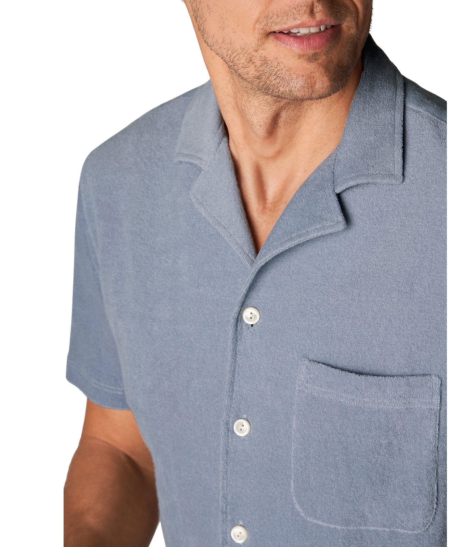 Blå retroinspirerad resortskjorta med knäppning, gjord av mjuk och skön italiensk bomullsfrotté. En skön sextiotalskänsla som passar lika bra på stan som på stranden.