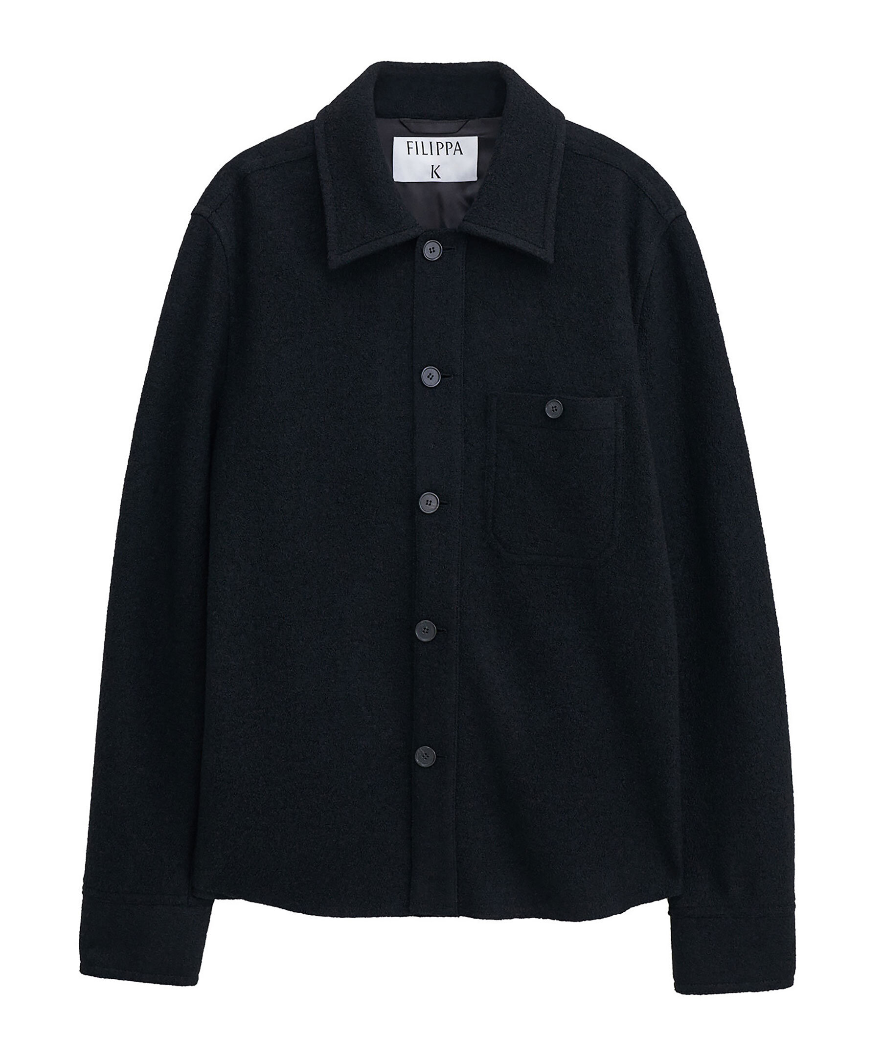 Svart skjortjacka från Filippa K. Jackan kombinerar funktionalitet och stil med en normal passform. Vävd av en italiensk ullblandning i mellantjocklek. Designad med knäppning framtill, en praktisk påsydd ficka och satinlining vid oket bak för en sofistikerad finish.