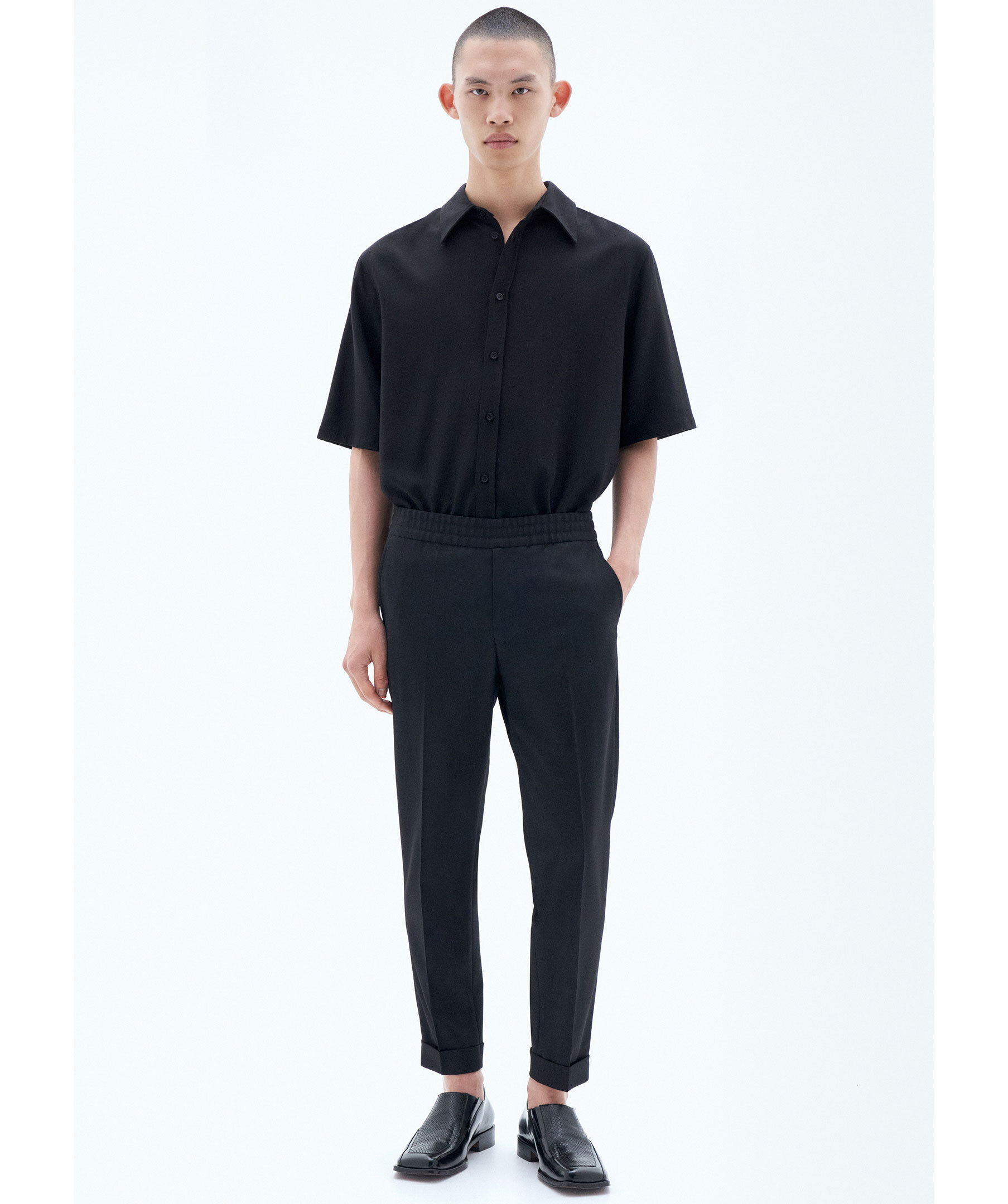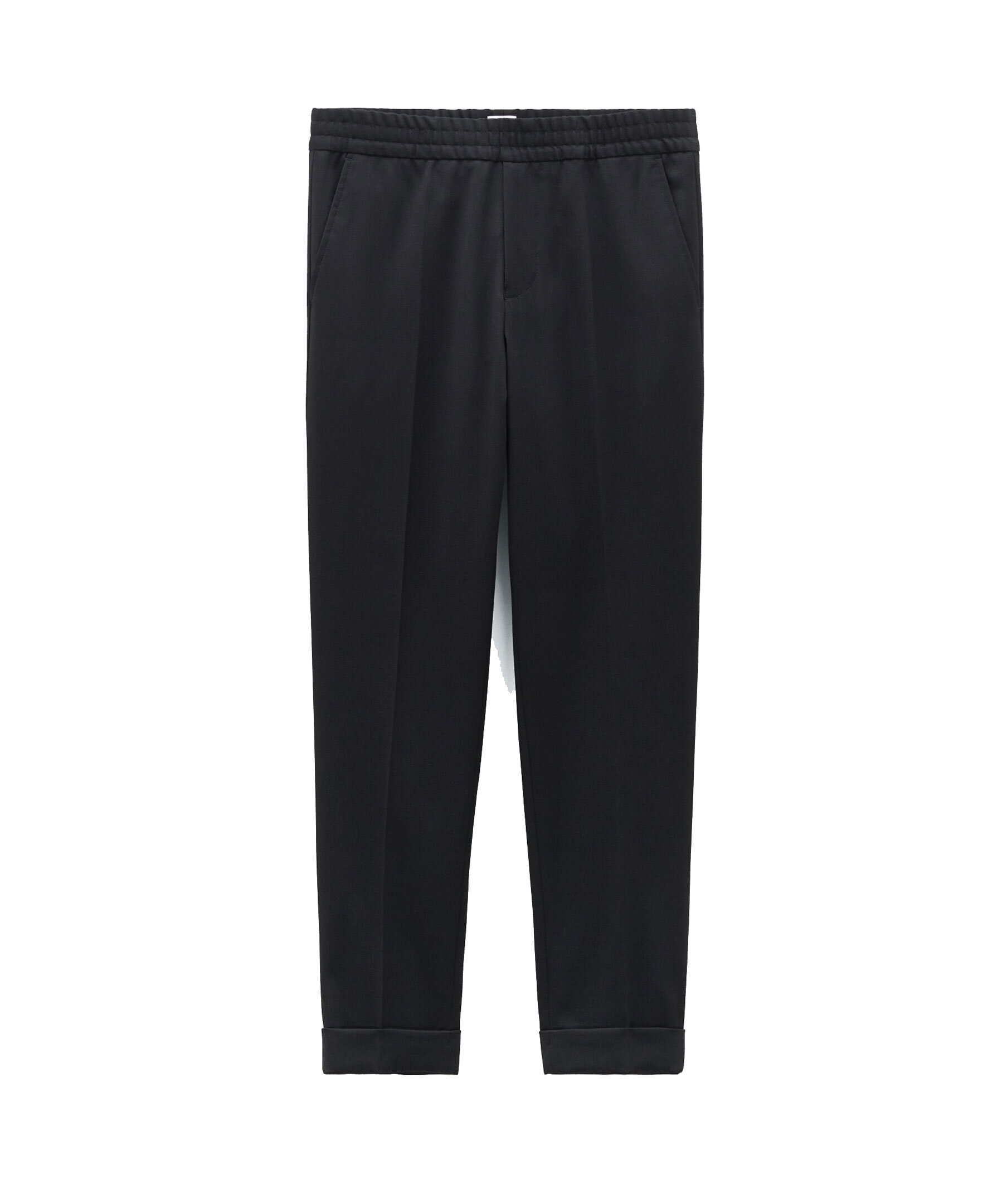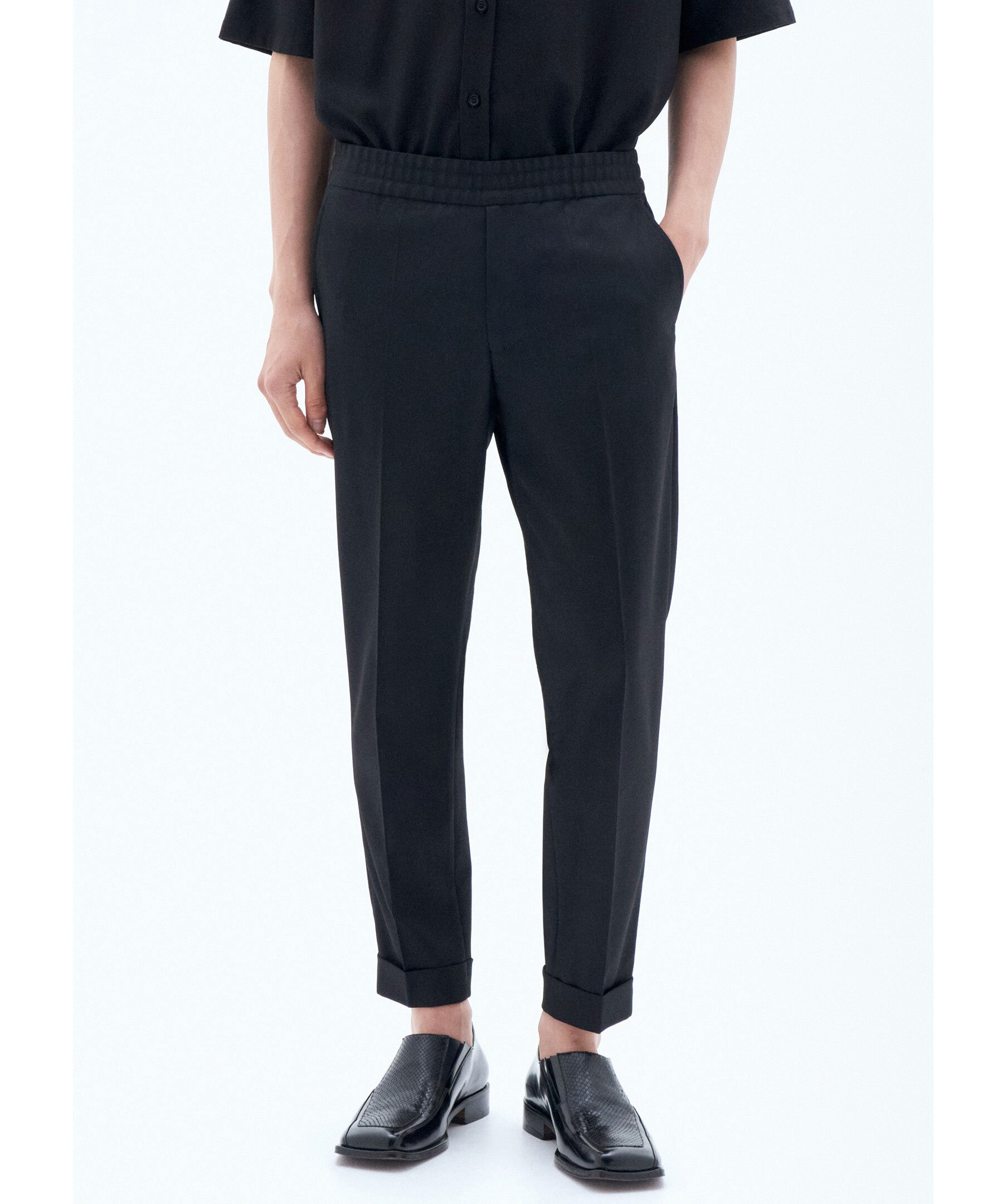 Svarta byxor från Filippa K. Byxorna har en elastisk medelhög midja med dold dragsko, pressade veck och avsmalnande ben. Två sidfickor samt två passpoalfickor bak och uppvikta ben. Slim passform. Tillverkad i en ullblandning.