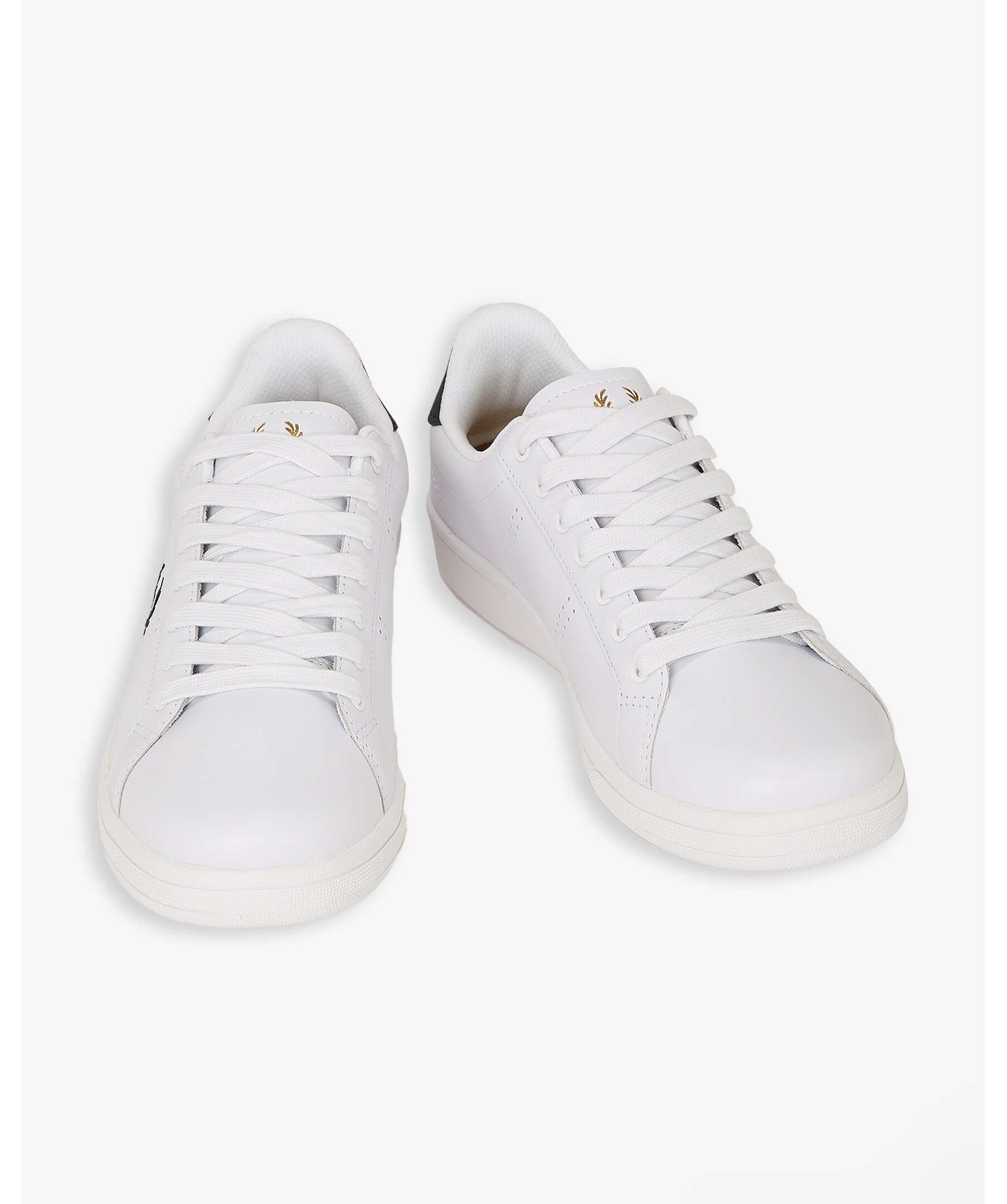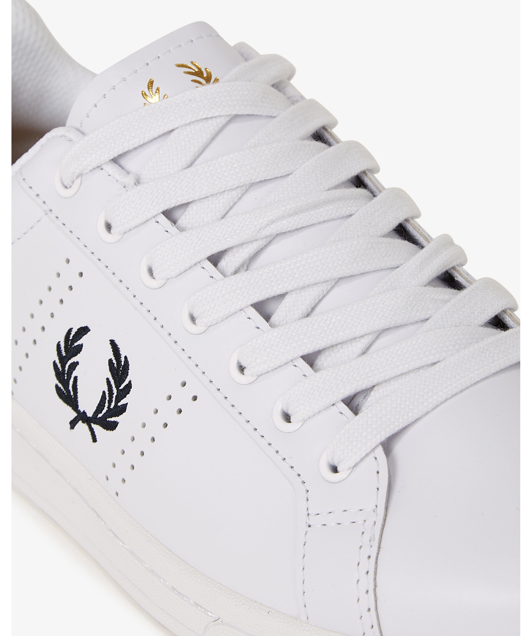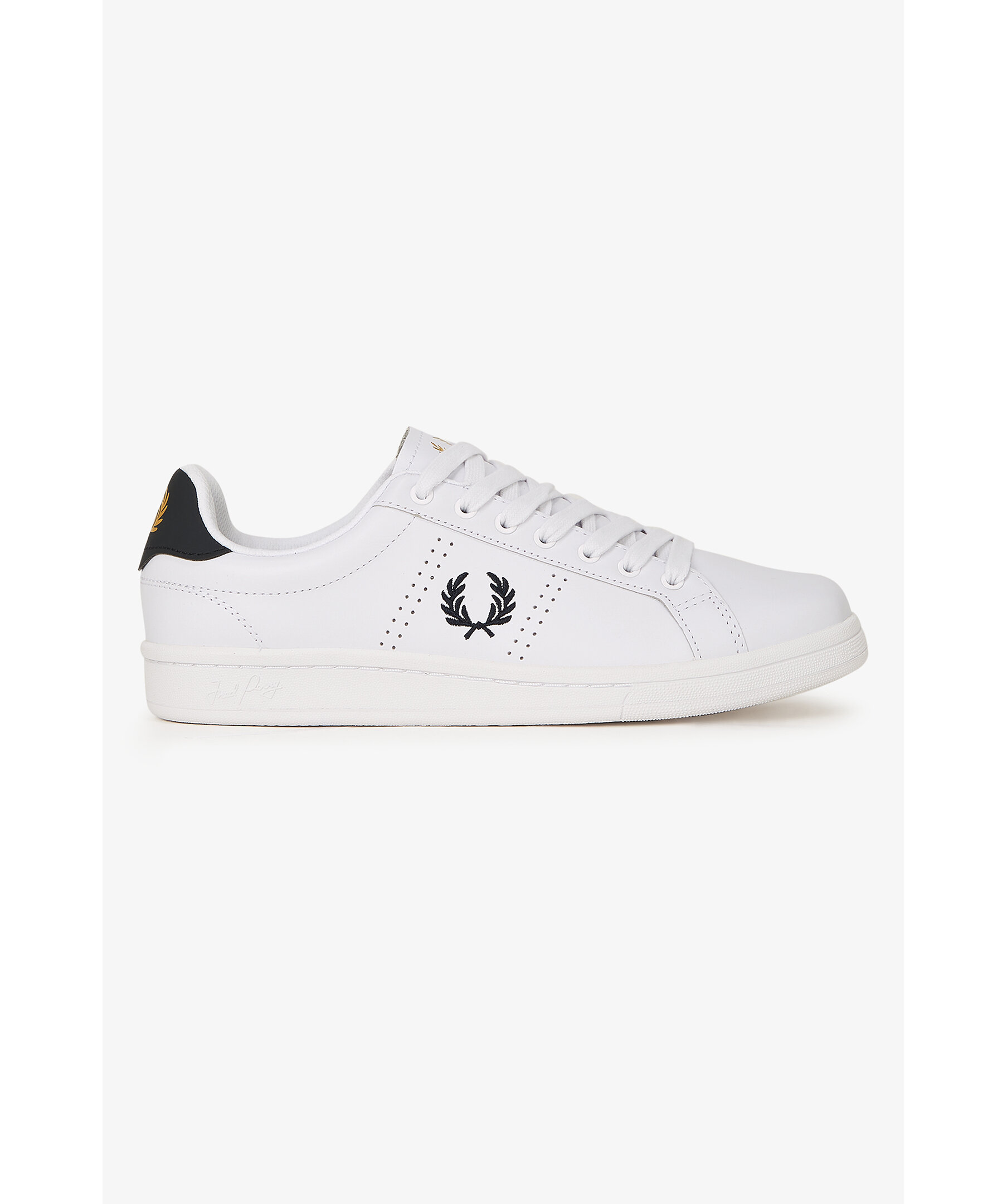 Vita sneakers från Fred Perry. Den klassiska tennisskon i läder kombinerar klassiska sportdetaljer med en modern, upphöjd design. Signerad sula och ikonisk lagerkrans i tryck, guldfolie och präglad finish ger en exklusiv känsla.