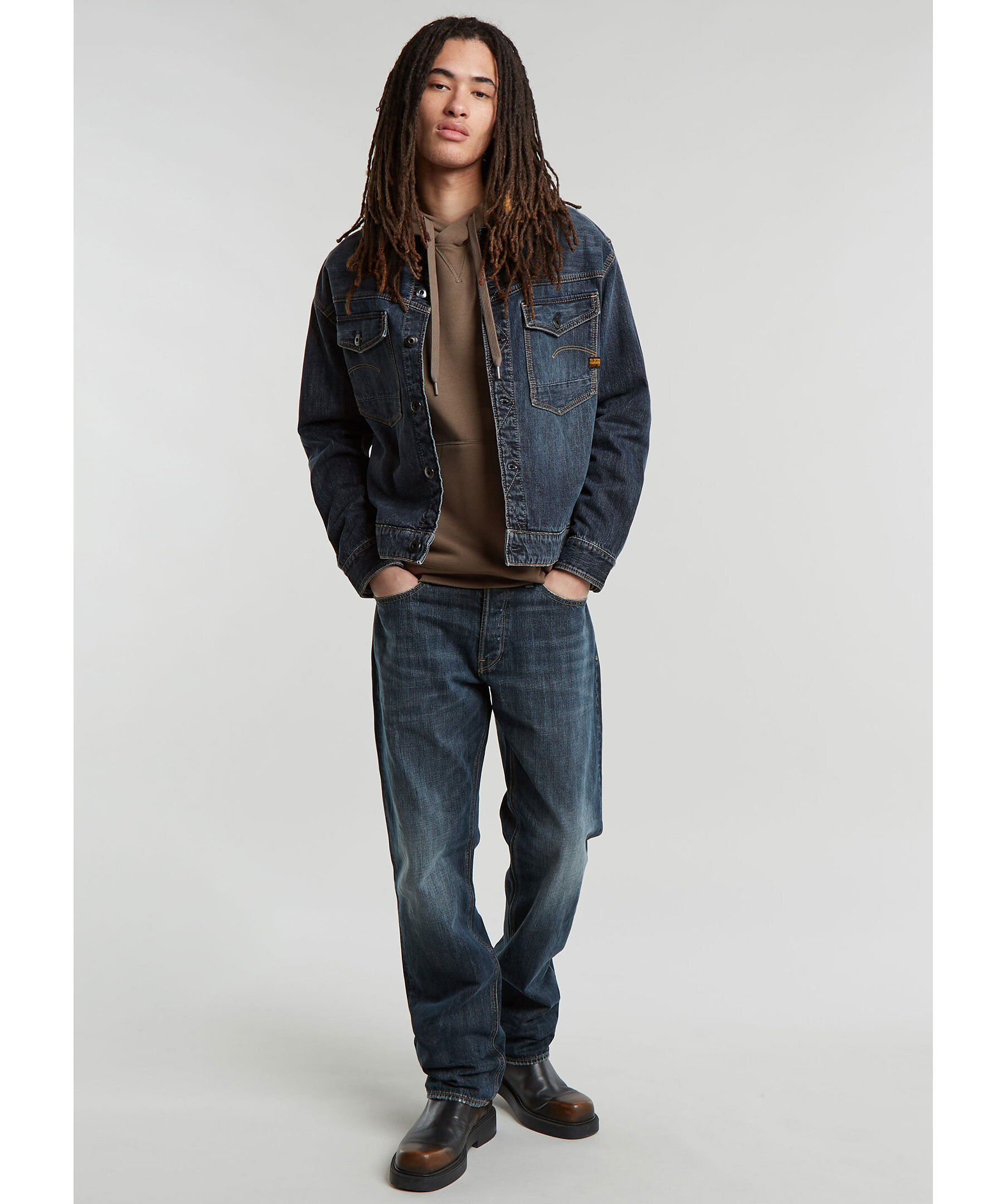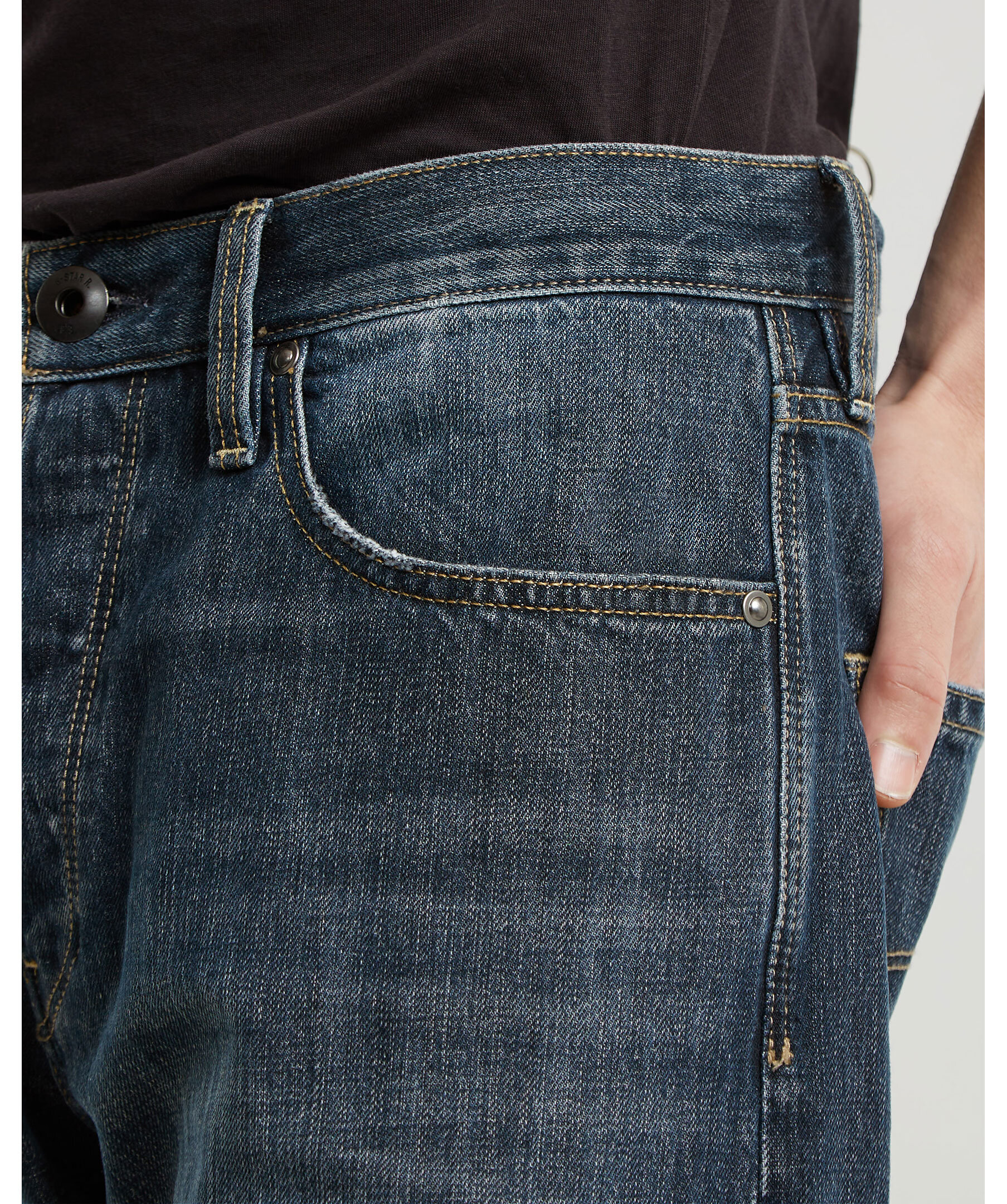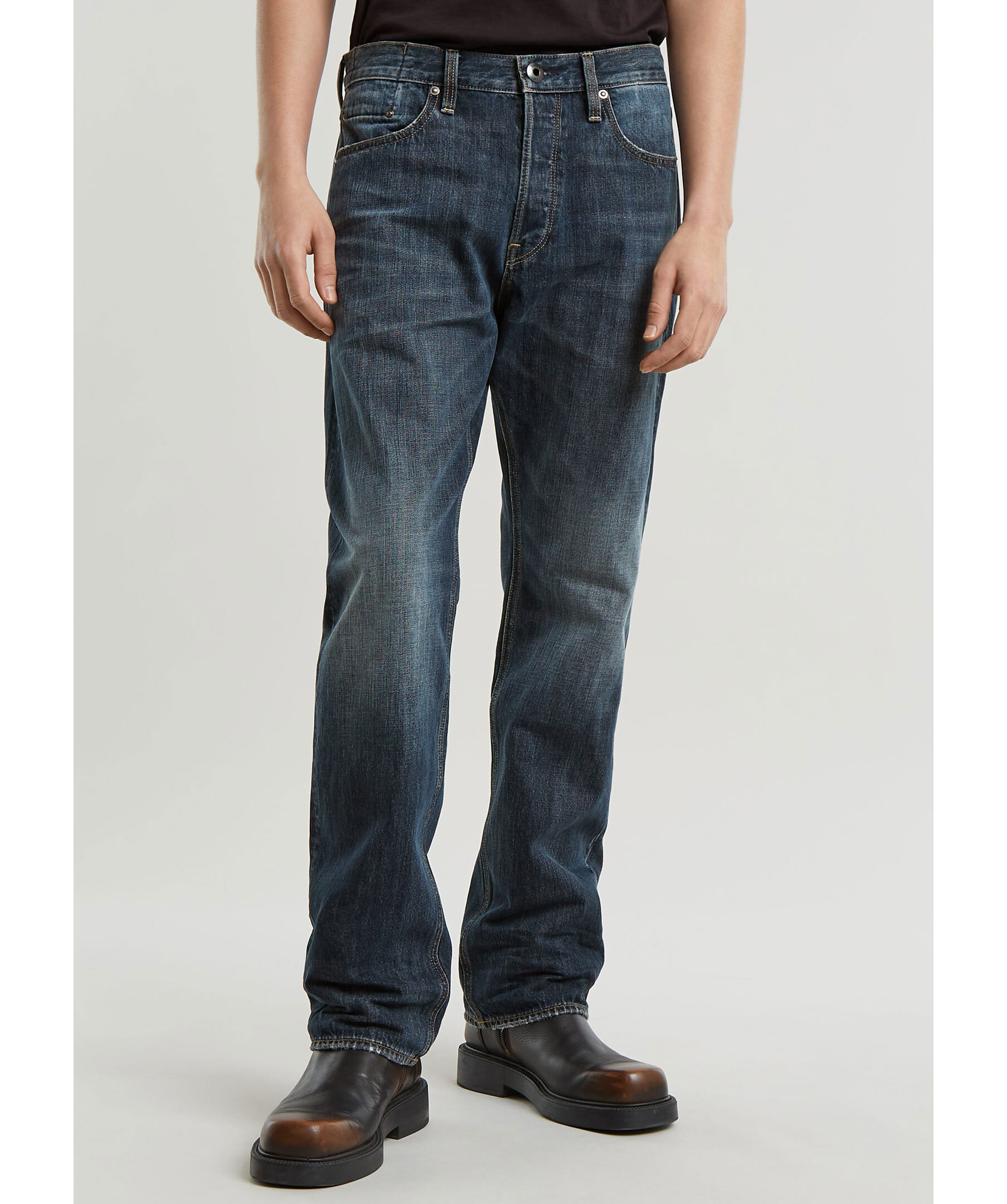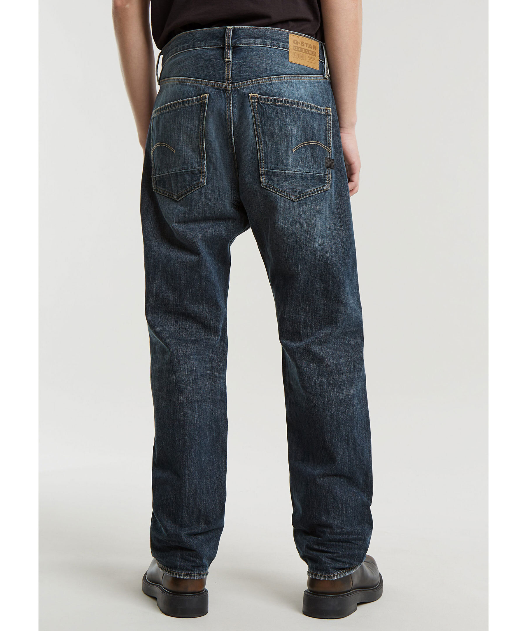 Blåa jeans från G-star. Jeansen är en 5-ficksmodell som är lite rymligare för att ge en mer avslappnad look. Vid linningen på baksidan finns en läderliknande patch med G-stars logotyp. Jeansen stängs med knappar. Tillverkade av en bomullsblandning.