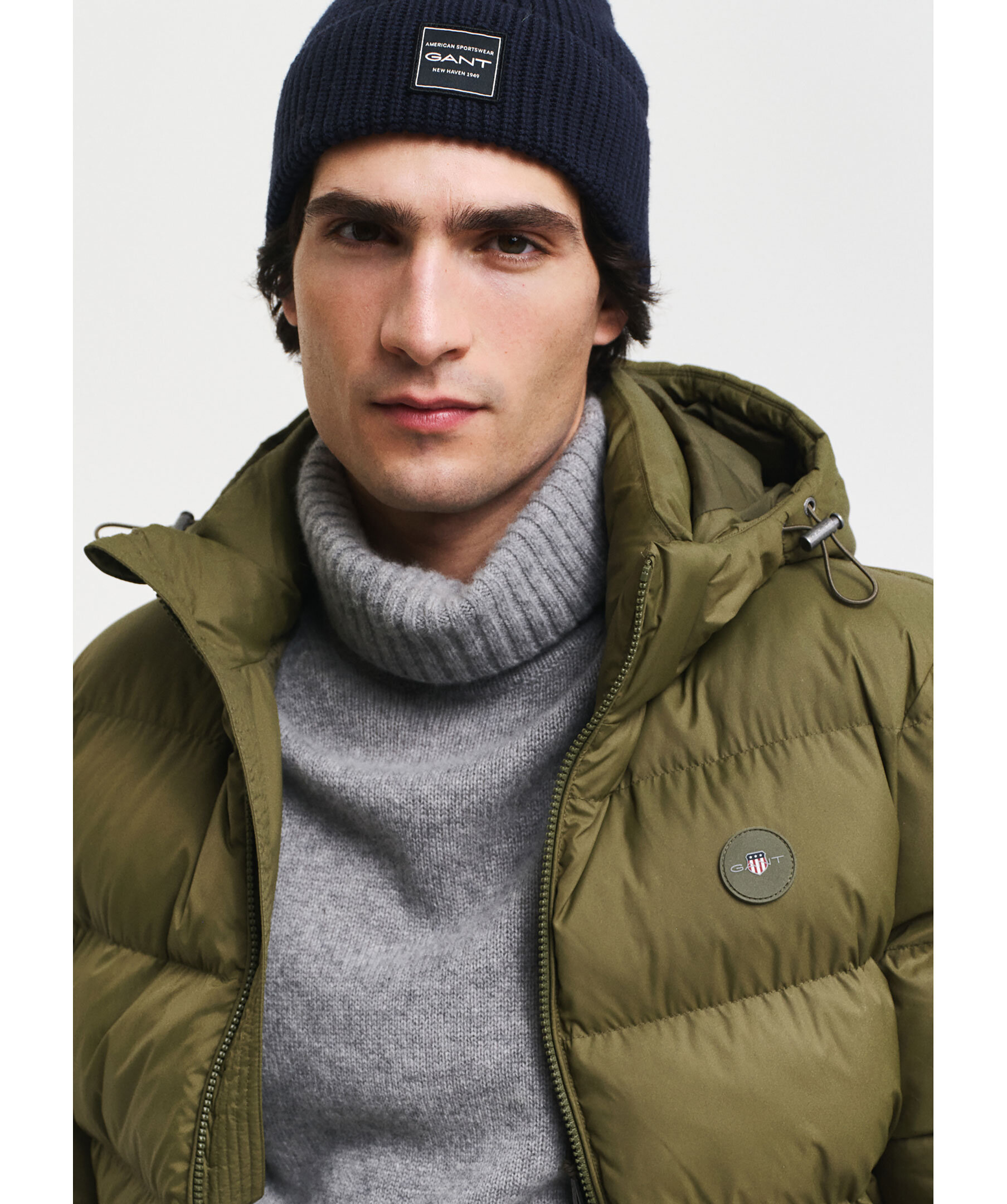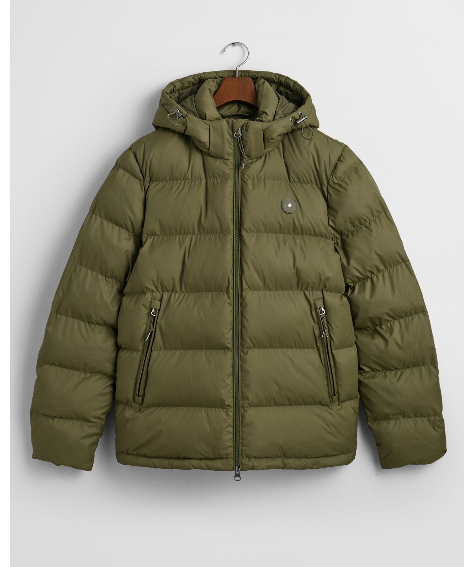 Olivgrön pufferjacka från Gant. Jackan har en vattenavisande finish, avtagbar huva, två framfickor med blixtlås. Jackan stängs med dragkedja och har en logga i silicon på vänster bröst. Tillverkad av 100% återvunnen polyamid.