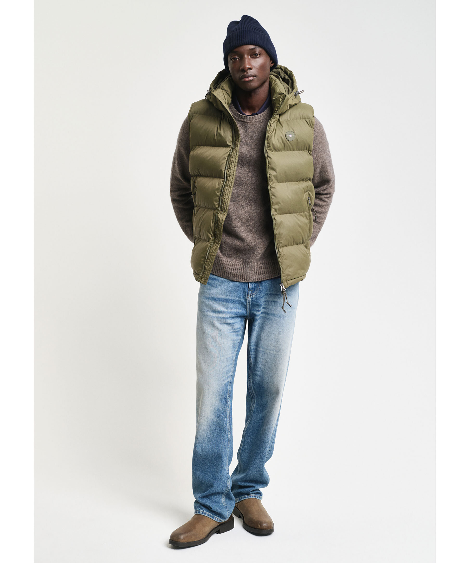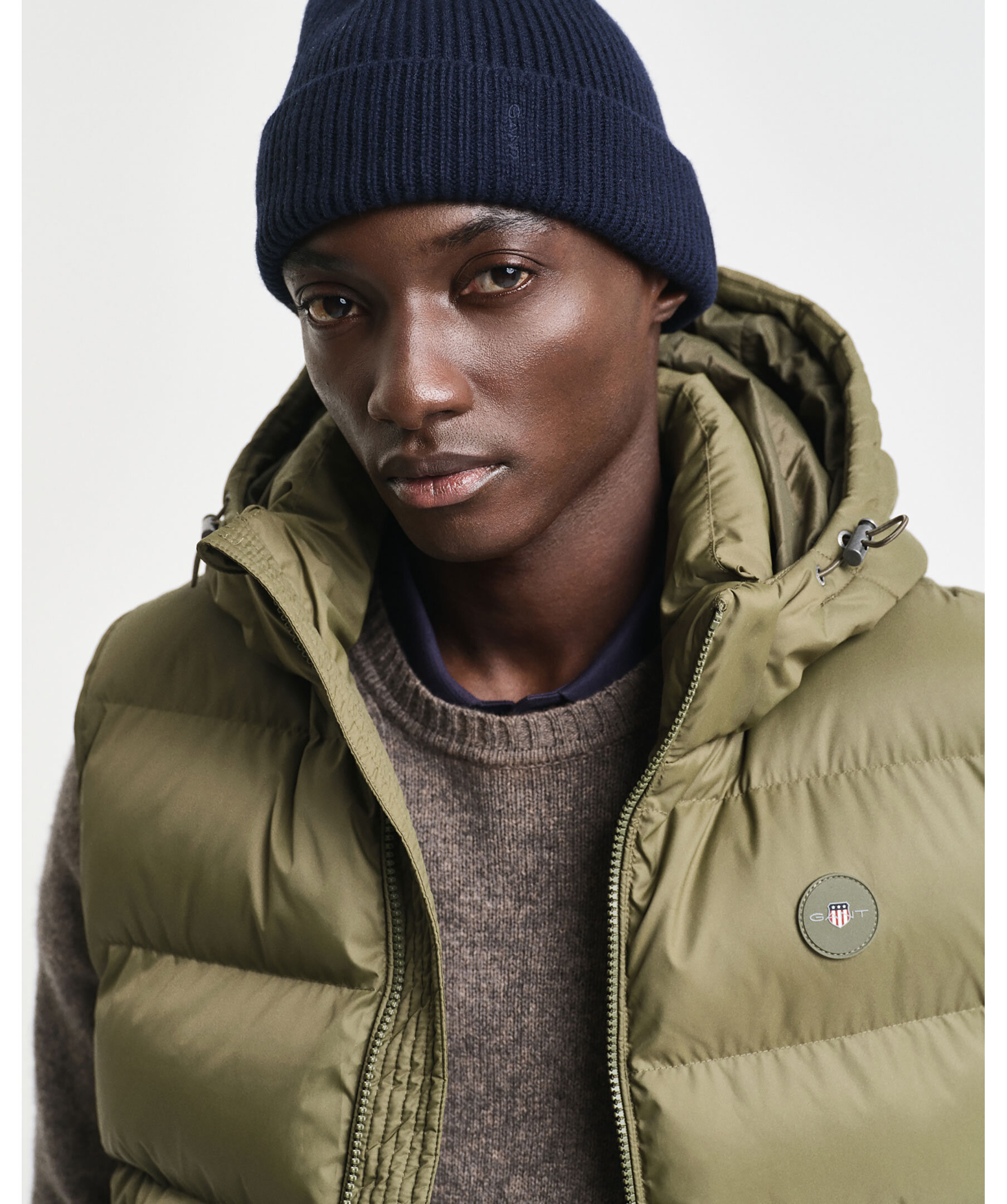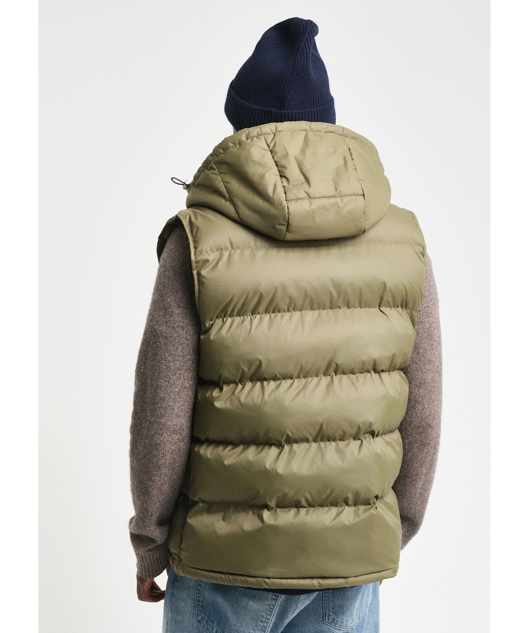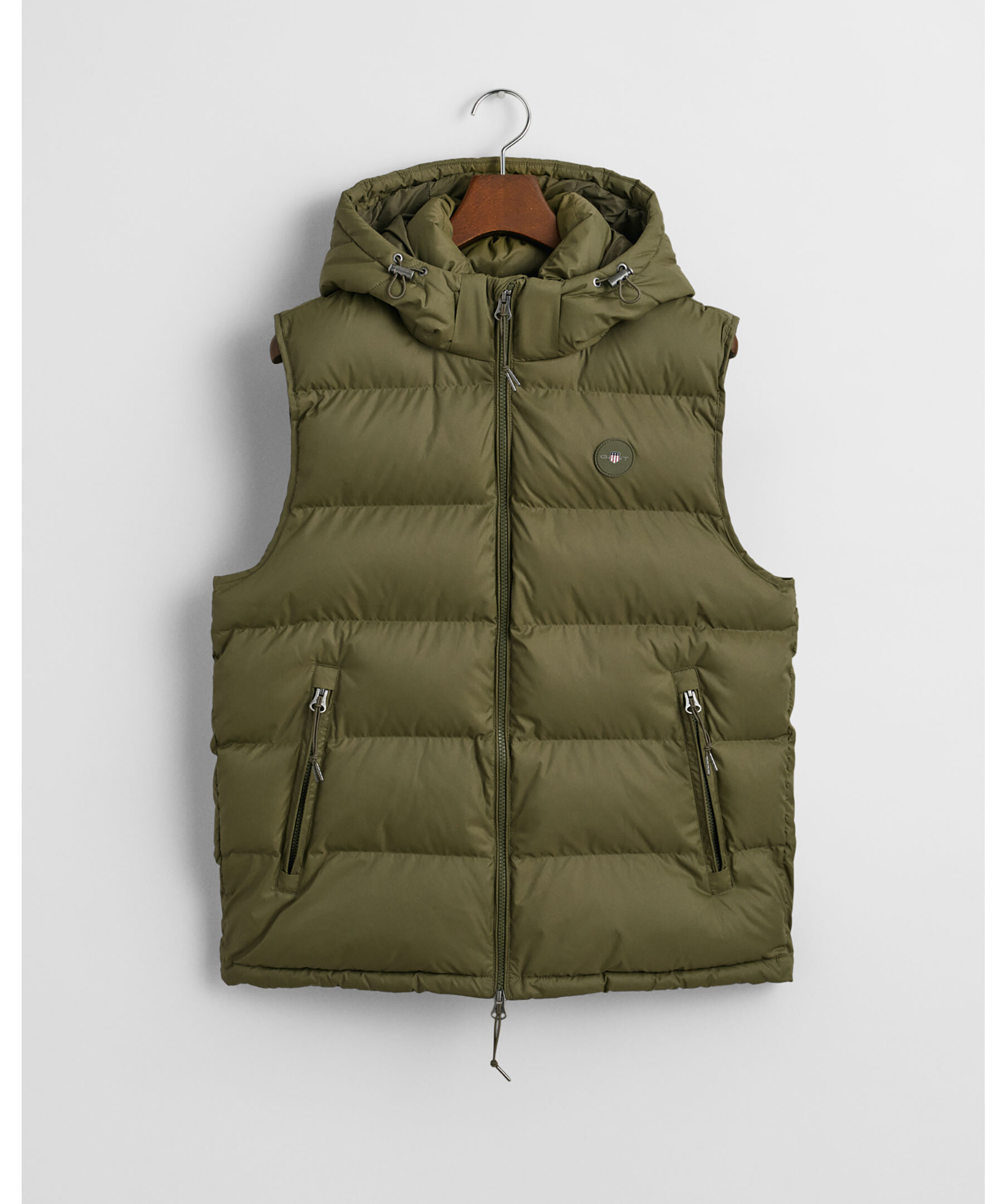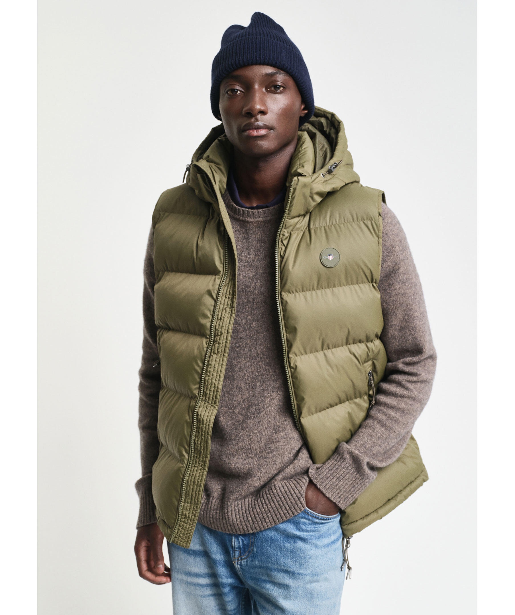 Grön väst från Gant. Västen har en puffer estetik och vatten avisande finish, avtagbar huva och sidfickor med blixtlås. Stängs med blixtlås och har en logotyp i silikon på bröstet. Tillverkad av polyamid.