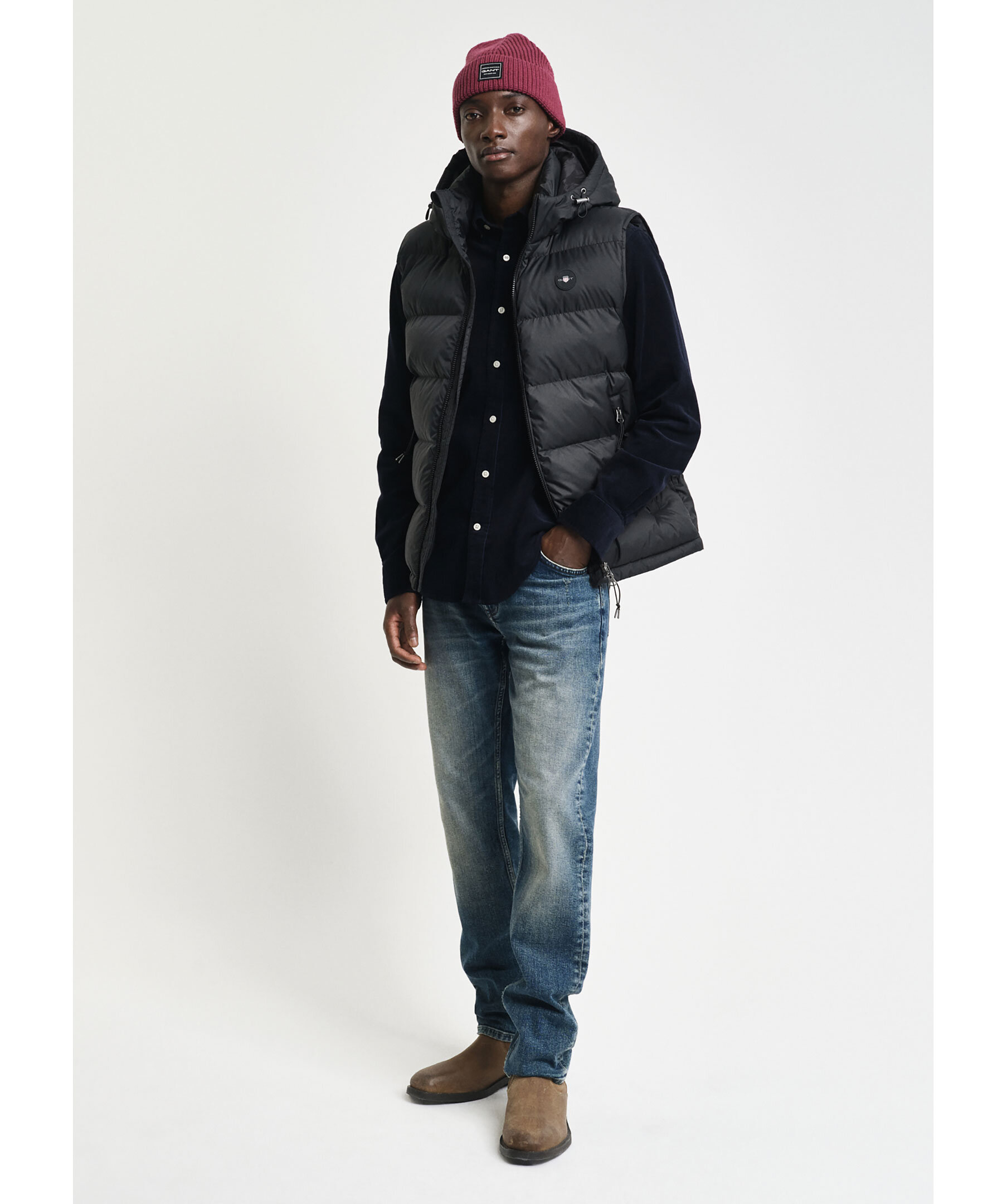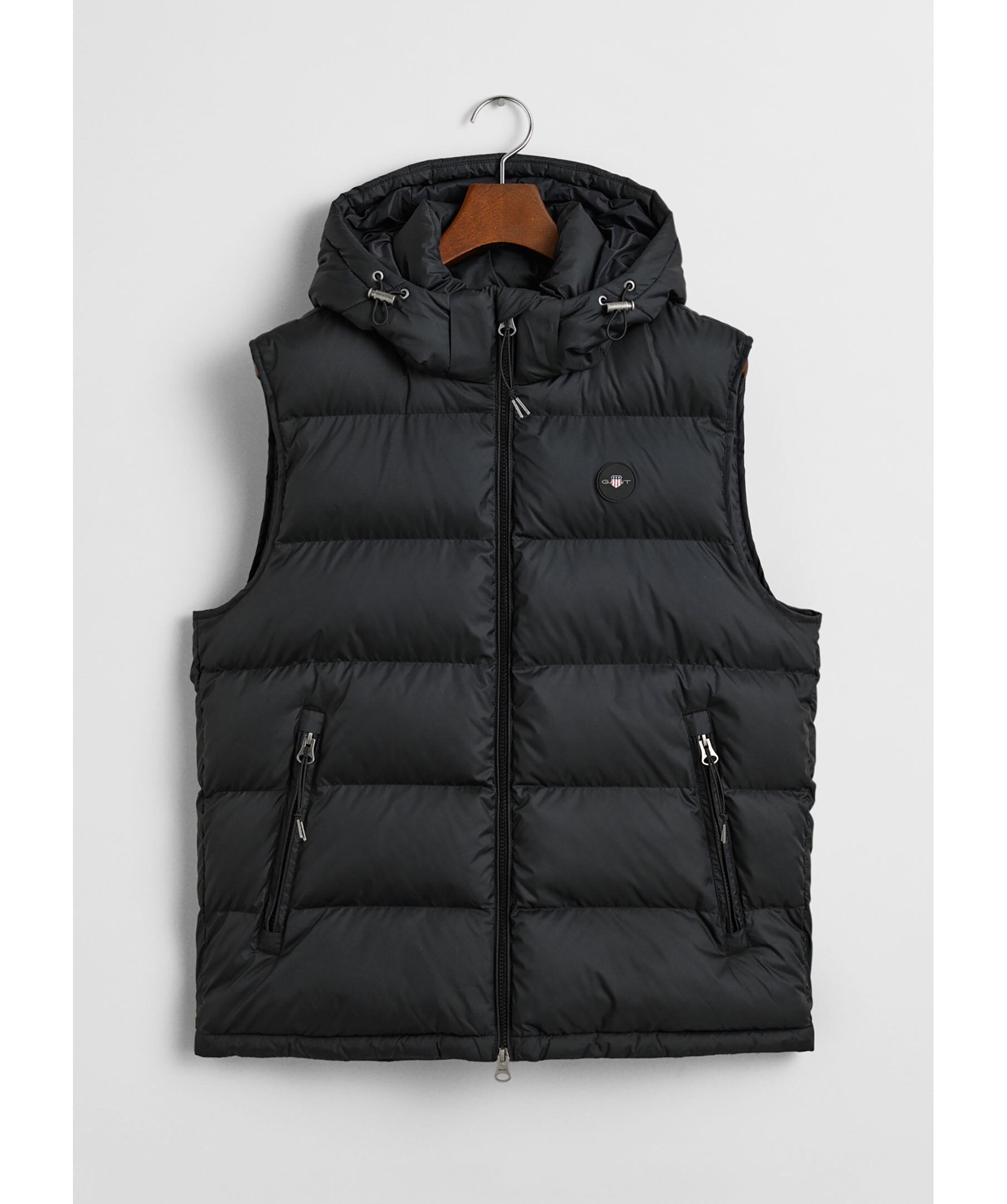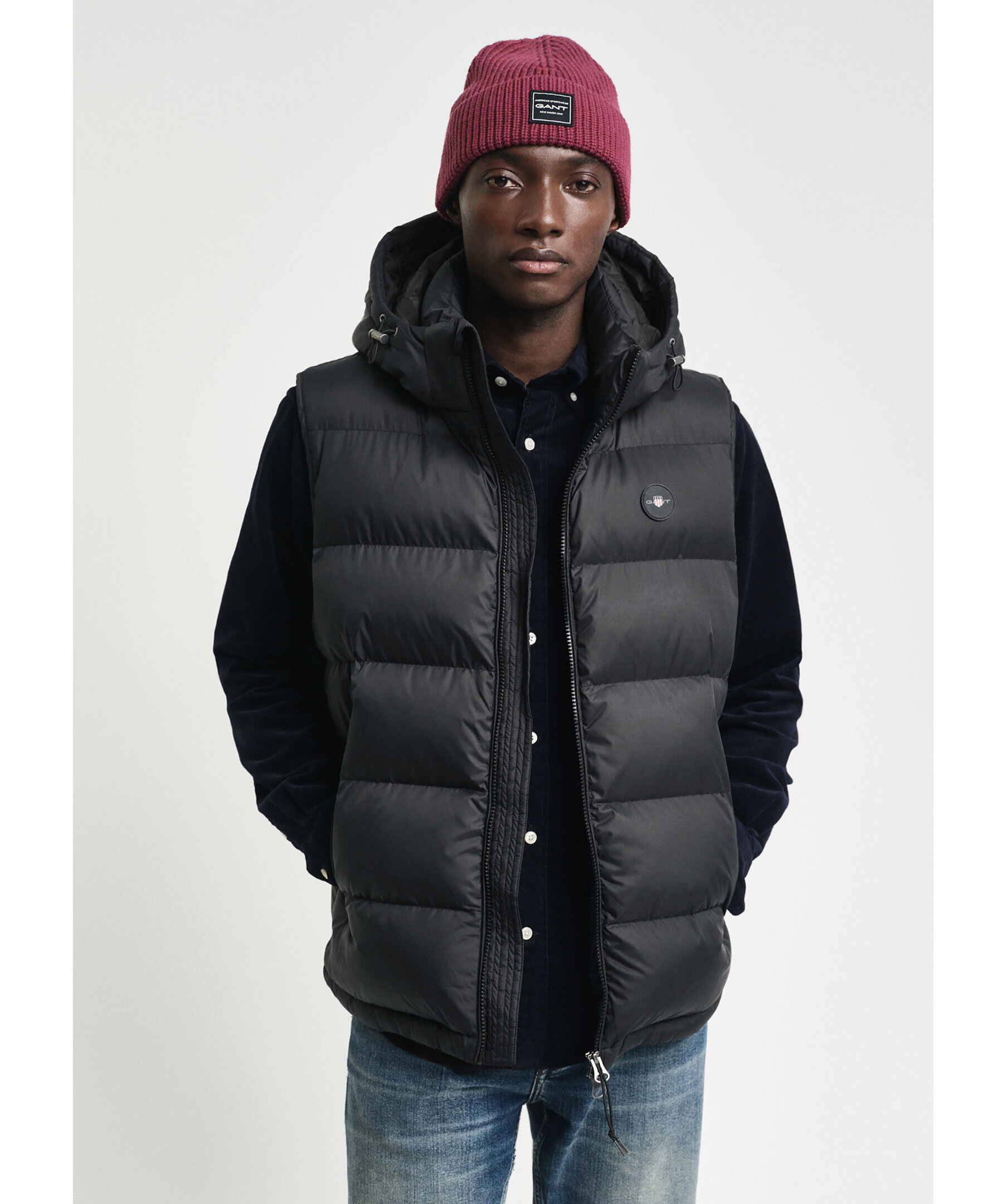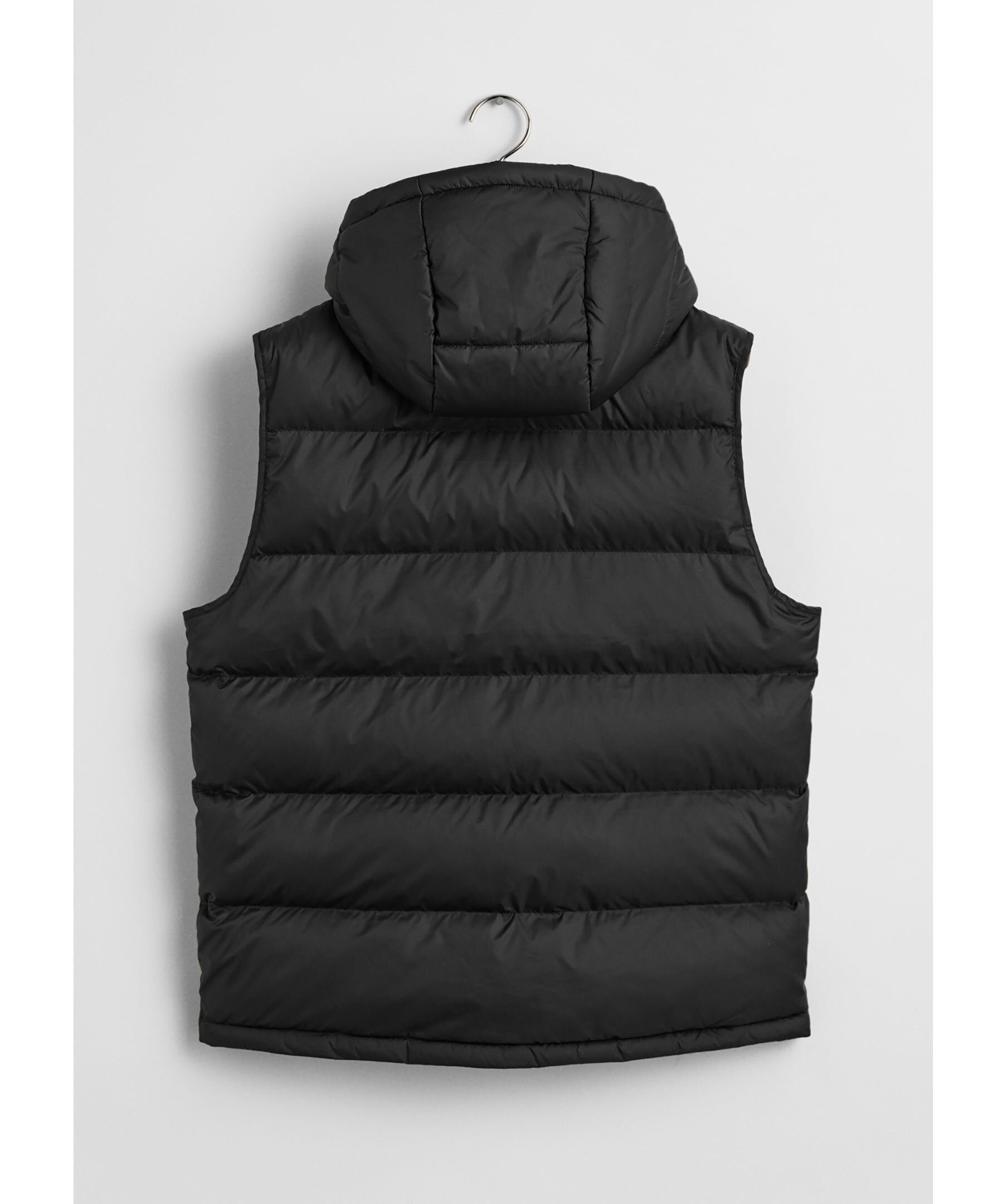 Svart väst från Gant. Västen har en puffer estetik och vatten avisande finish, avtagbar huva och sidfickor med blixtlås. Stängs med blixtlås och har en logotyp i silikon på bröstet. Tillverkad av polyamid.