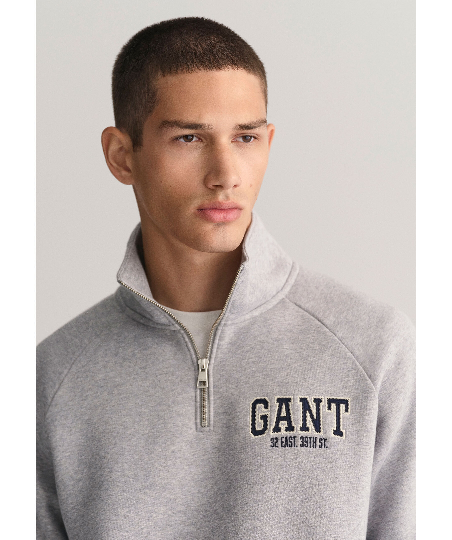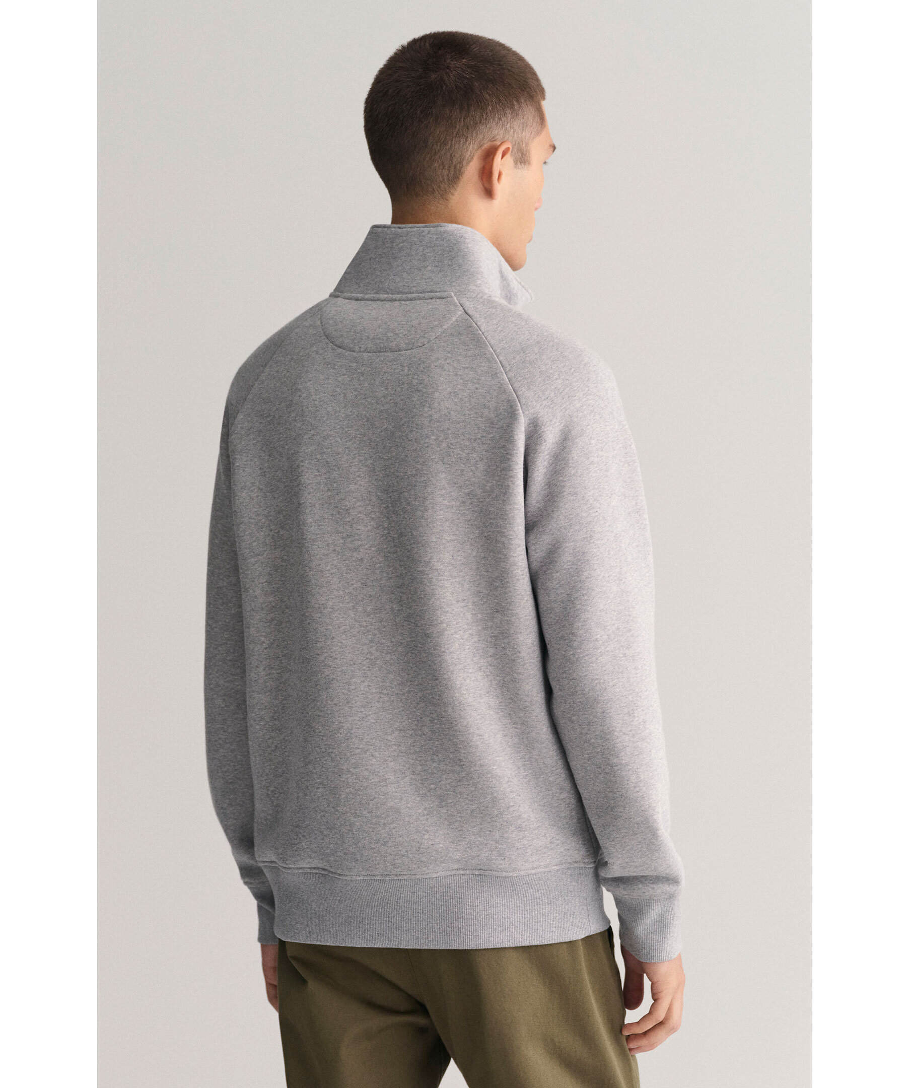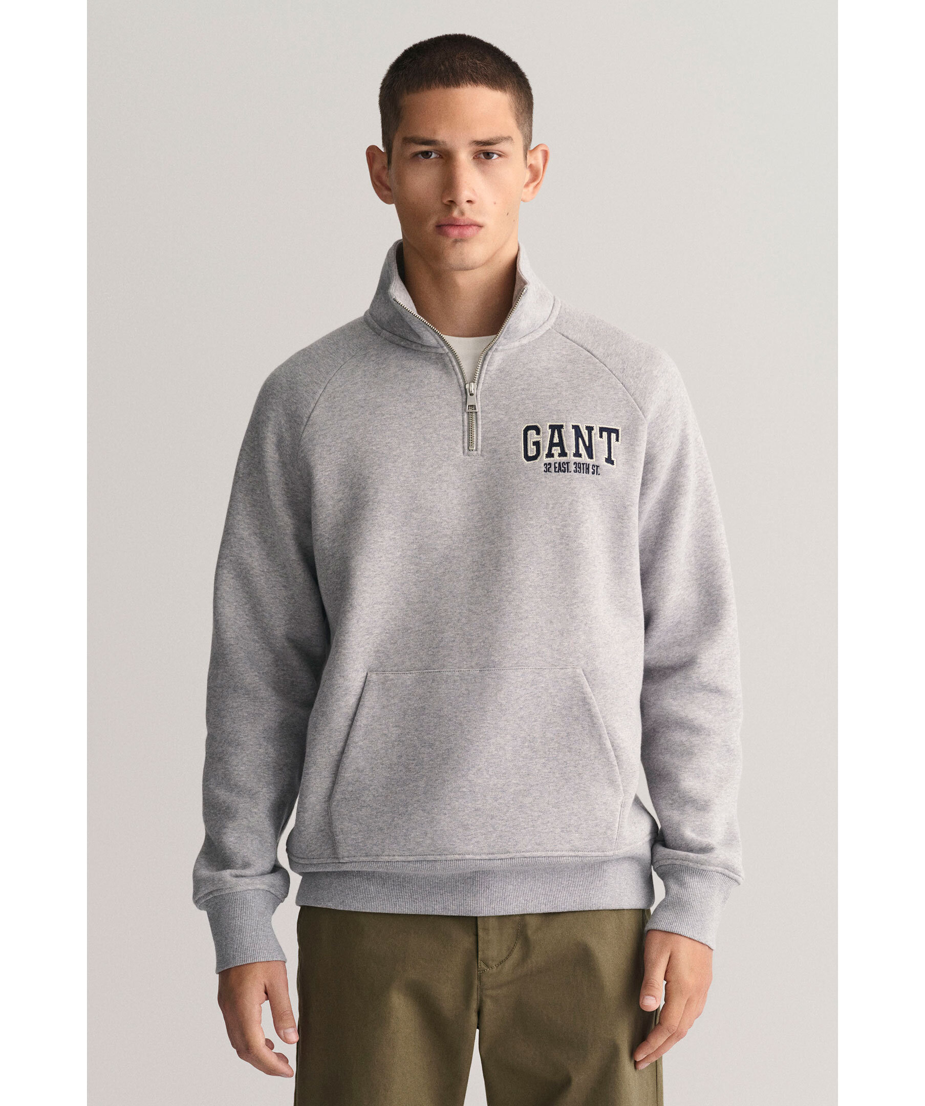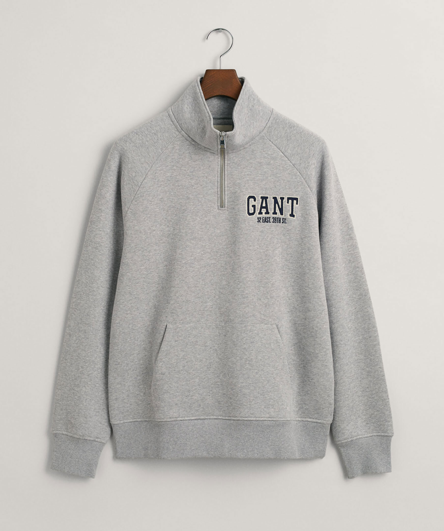 Grå, melerad half-zip i sweatshirt material från Gant. Broderad logotyp på vänster bröst. Känguruficka på magen. Ribbstickade muddar vid ärm- och plaggslut. Borstad insida. Tillverkad i bomullsblandning. Broderad logotyp på vänster bröst.