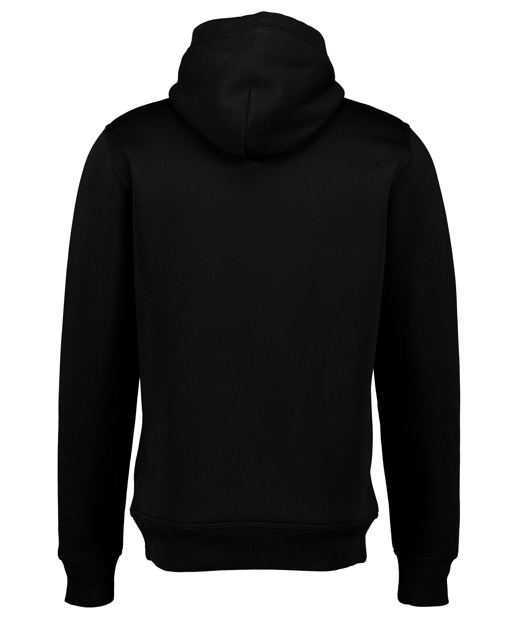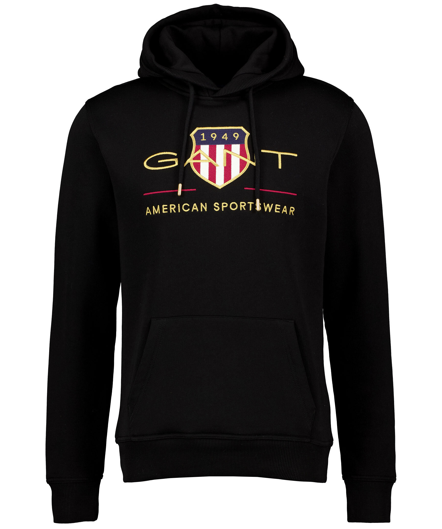 Svart hoodie från Gant i skön bomull. Tröjan har luva med snörning samt stor ficka på magen. Ribbstickade muddar och broderad logotyp på bröstet. Har en borstad insida och är tillverkad i bomull och polyesterblandning.