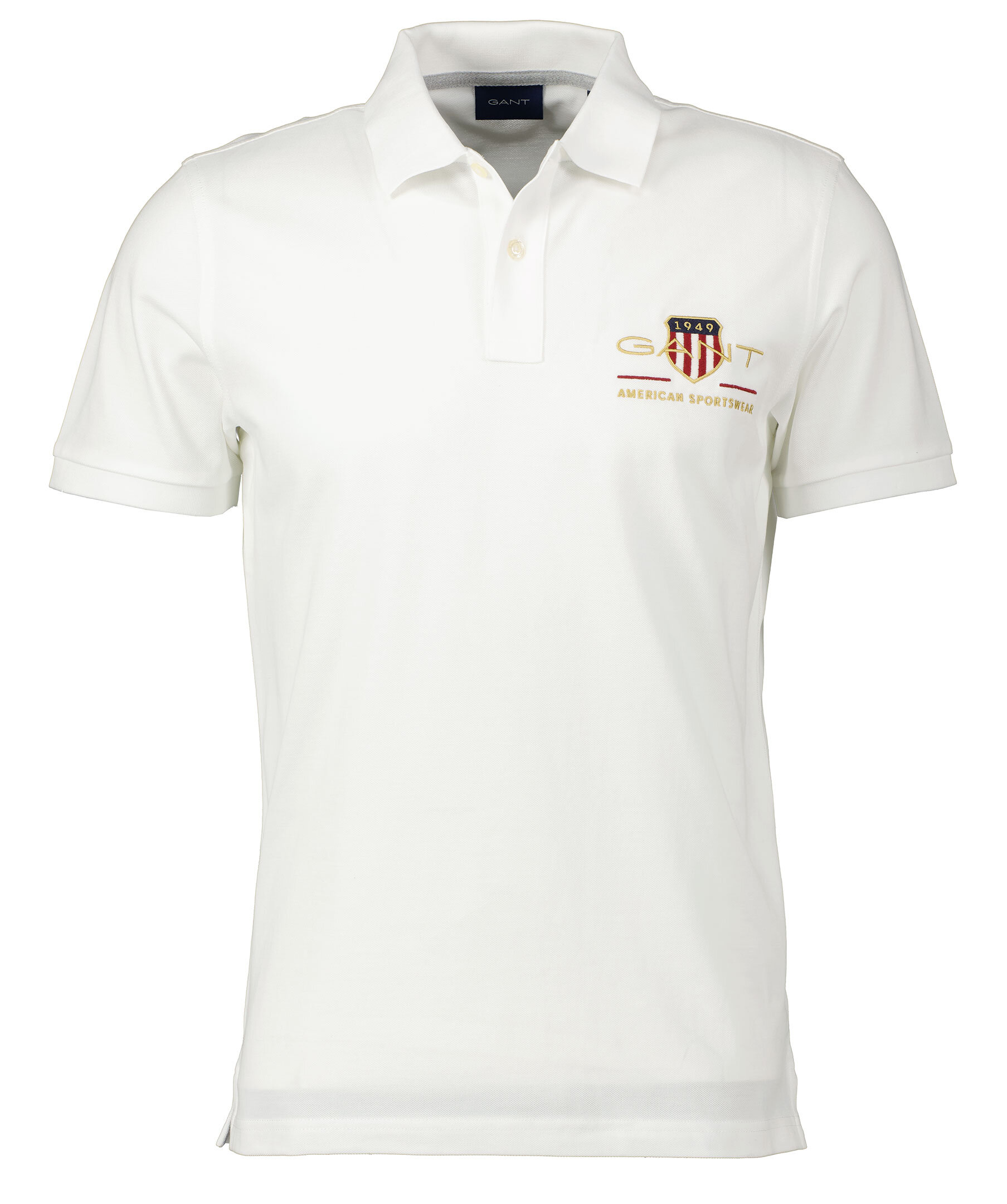 Vit kortärmad piké från Gant. Tröjan har en normal passform och är gjord i 100% bomull. Krage i twill material. Mellanstor broderad logotyp med GANT-sköld på ena sidan av bröstet.