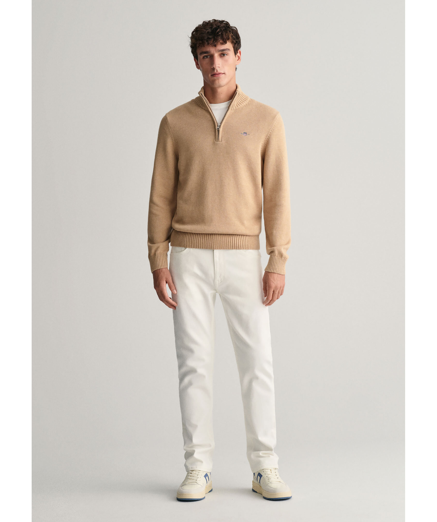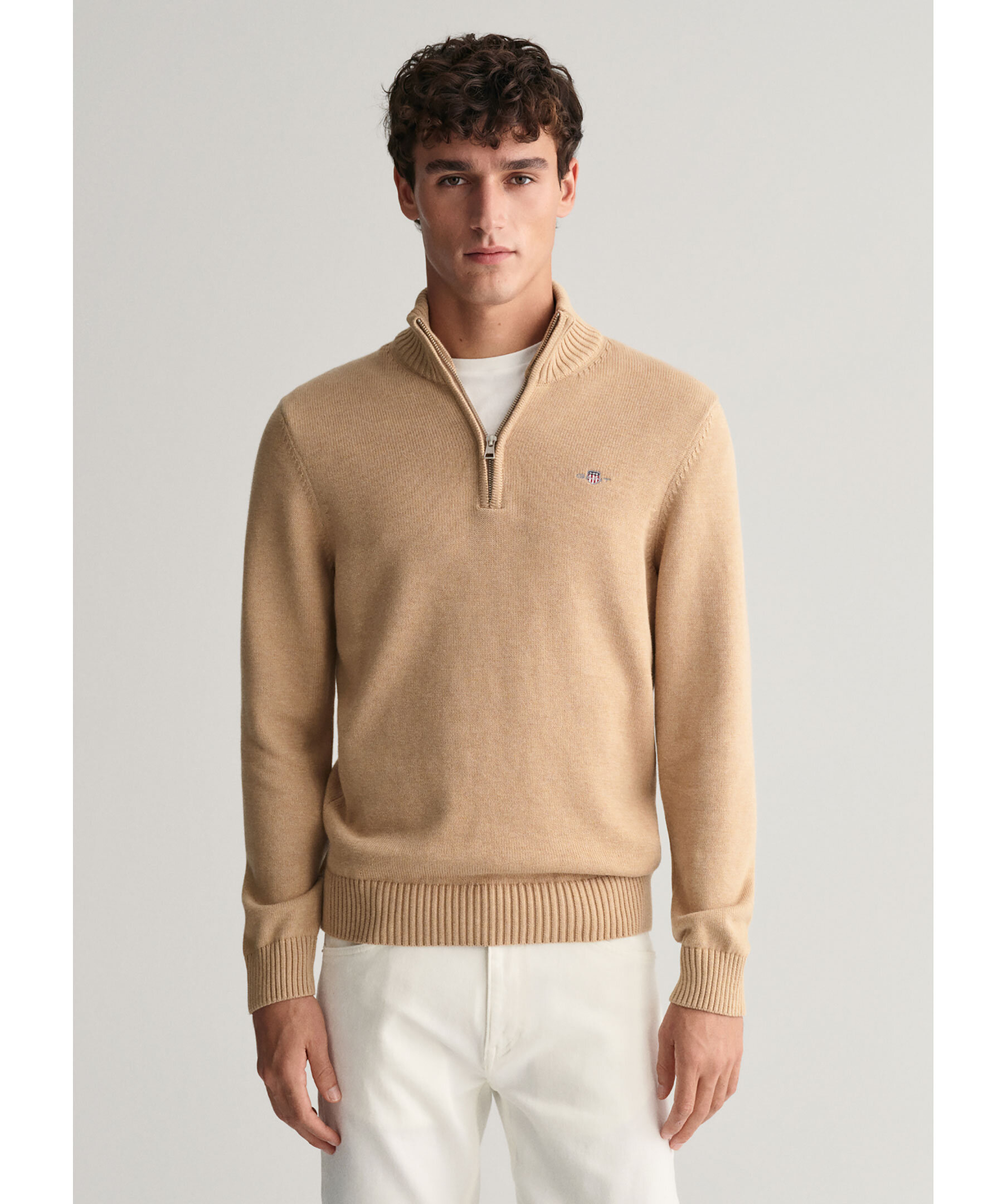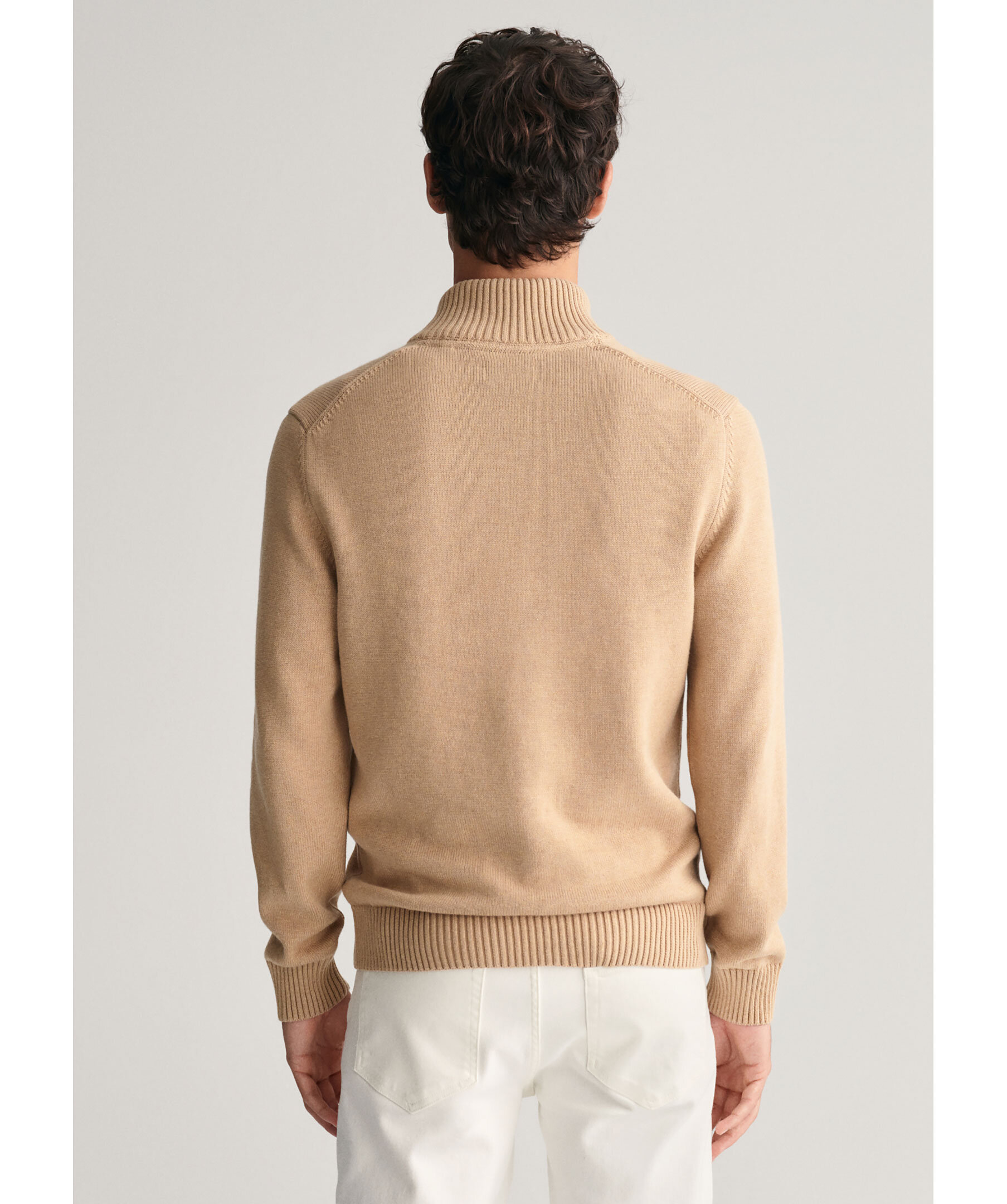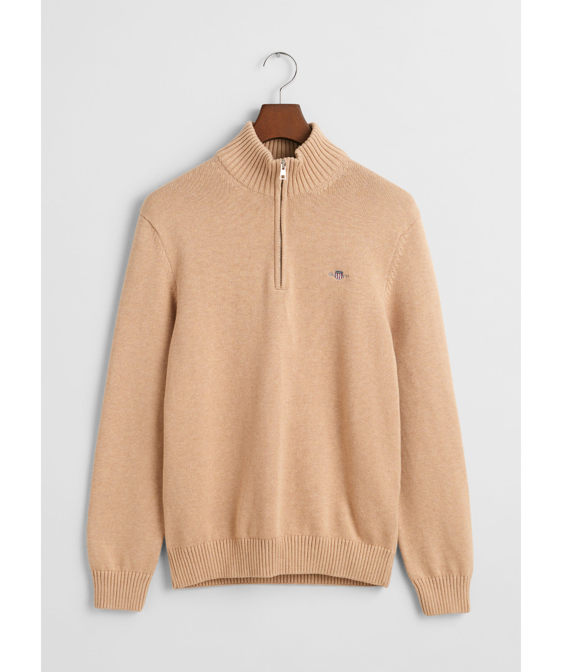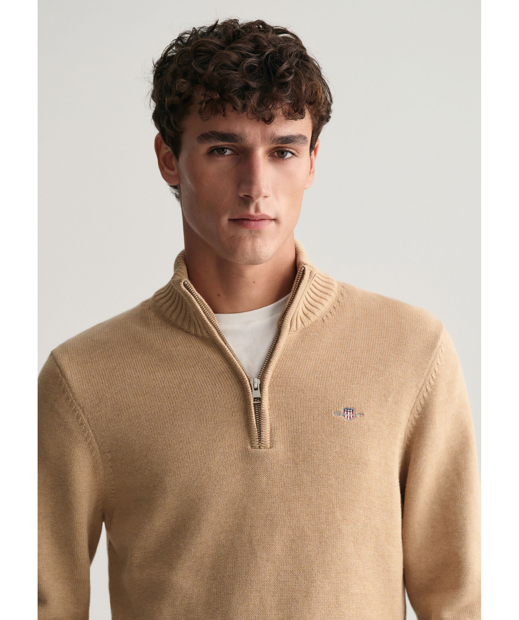 Ljus, khakifärgad och stickad tröja med krage och halv dragkedja i mellantjock bomull från Gant. Tröjan har, ribbstickade muddar och deras sköldlogotyp broderad på bröstet. Den är ett värmande stillager som du snyggt stylar med jeans eller välskurna byxor. Tillverkad i 100% bomull.