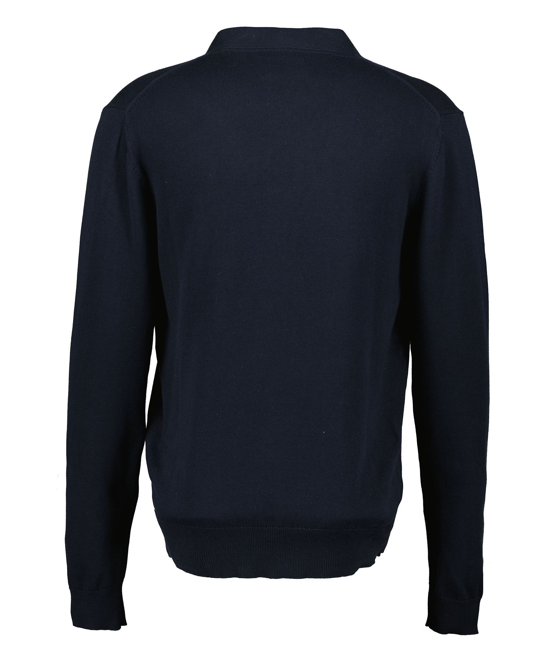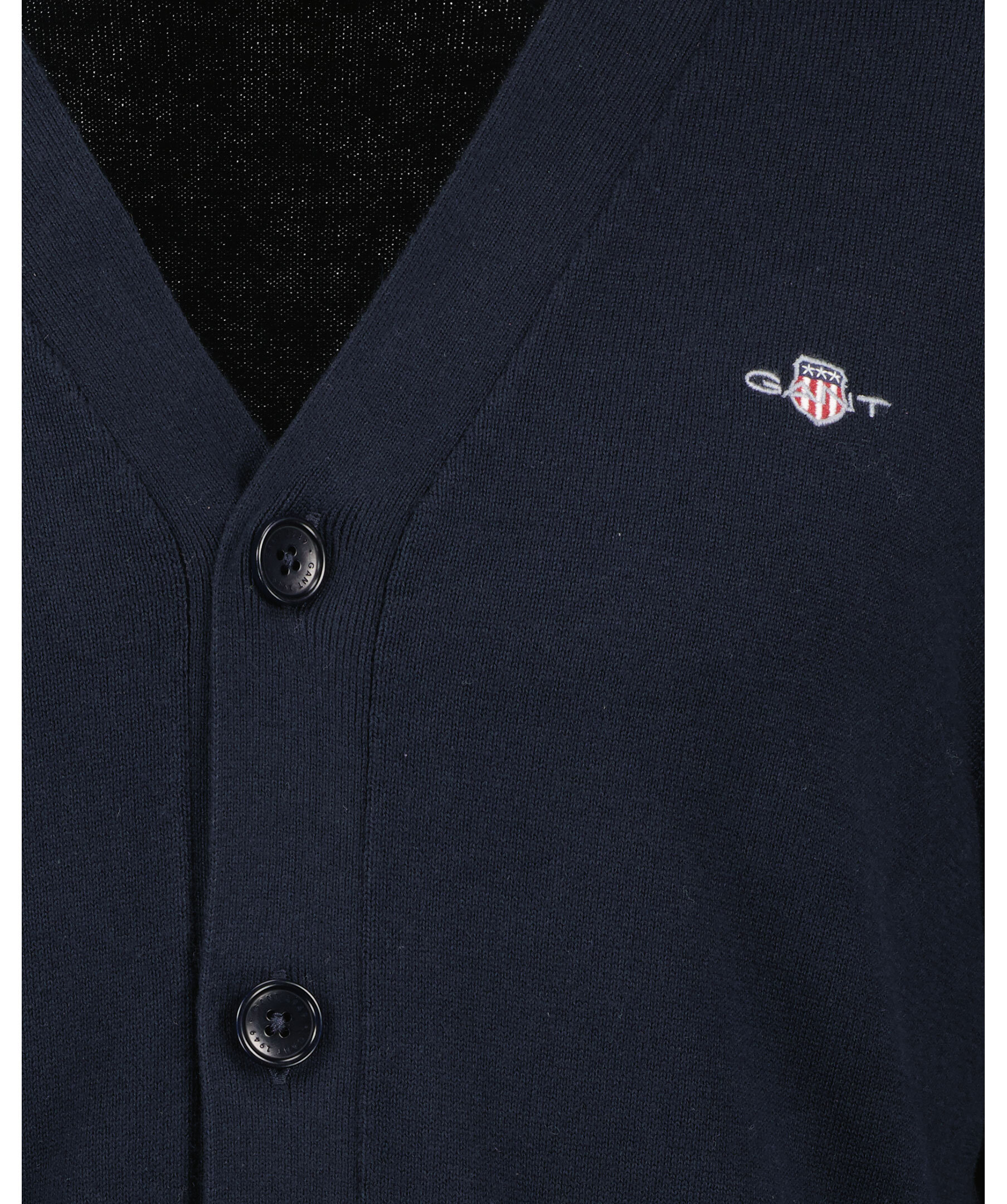 Marinblå, klassisk och mångsidig cardigan i bomull med V-ringning och normal passform från Gant. Den har detaljer som ribbstickade muddar, corozoknappar med logotyp, två fickor och en liten GANT-sköld broderad på bröstet. Bär över en skjorta med välskurna byxor och en elegant sko för en tidlös stil.