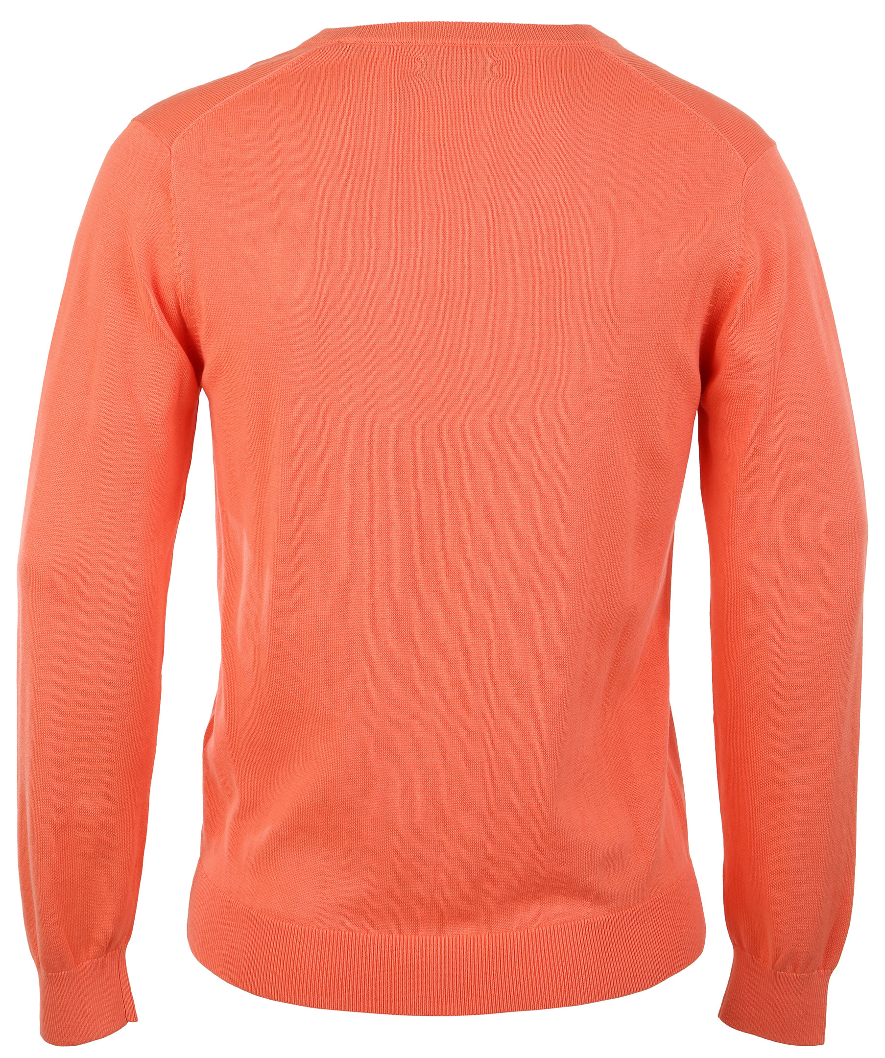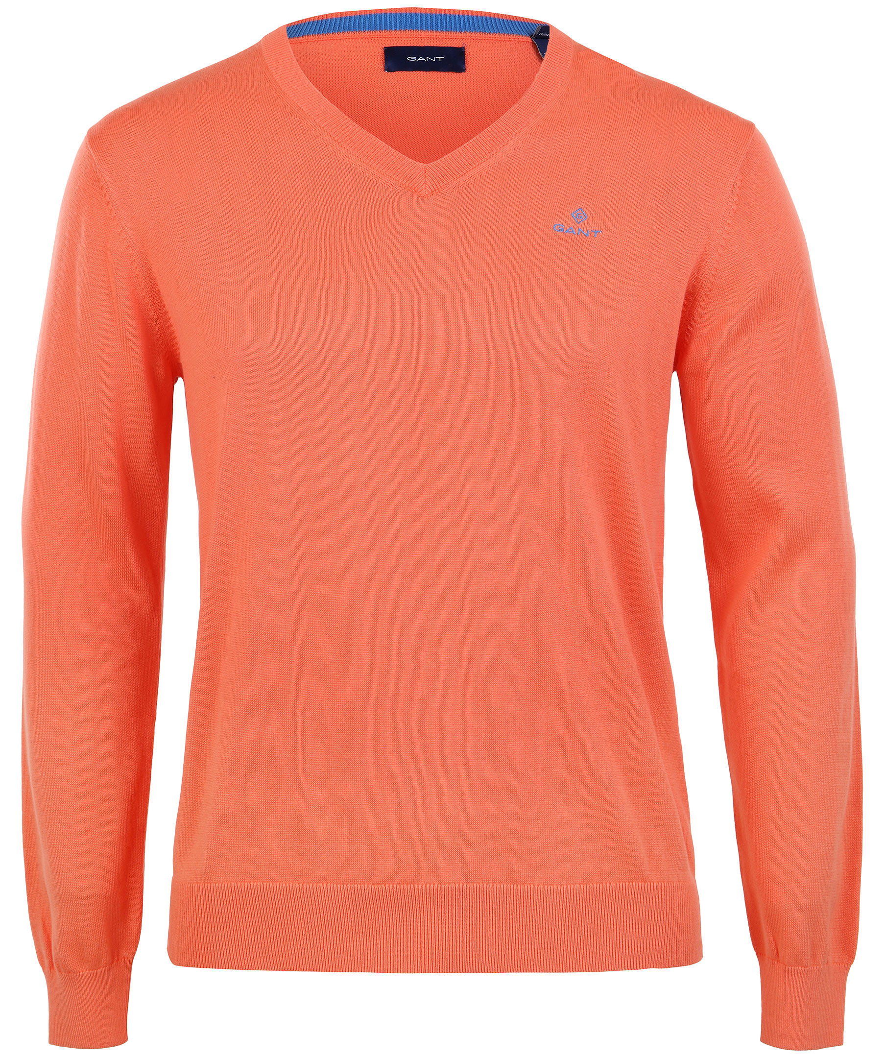 Orange finstickad tröja med v-ringnig från Gant. Tillverkad i 100% bomull. Broderad logotyp på bröstet och muddar i ärmslut.