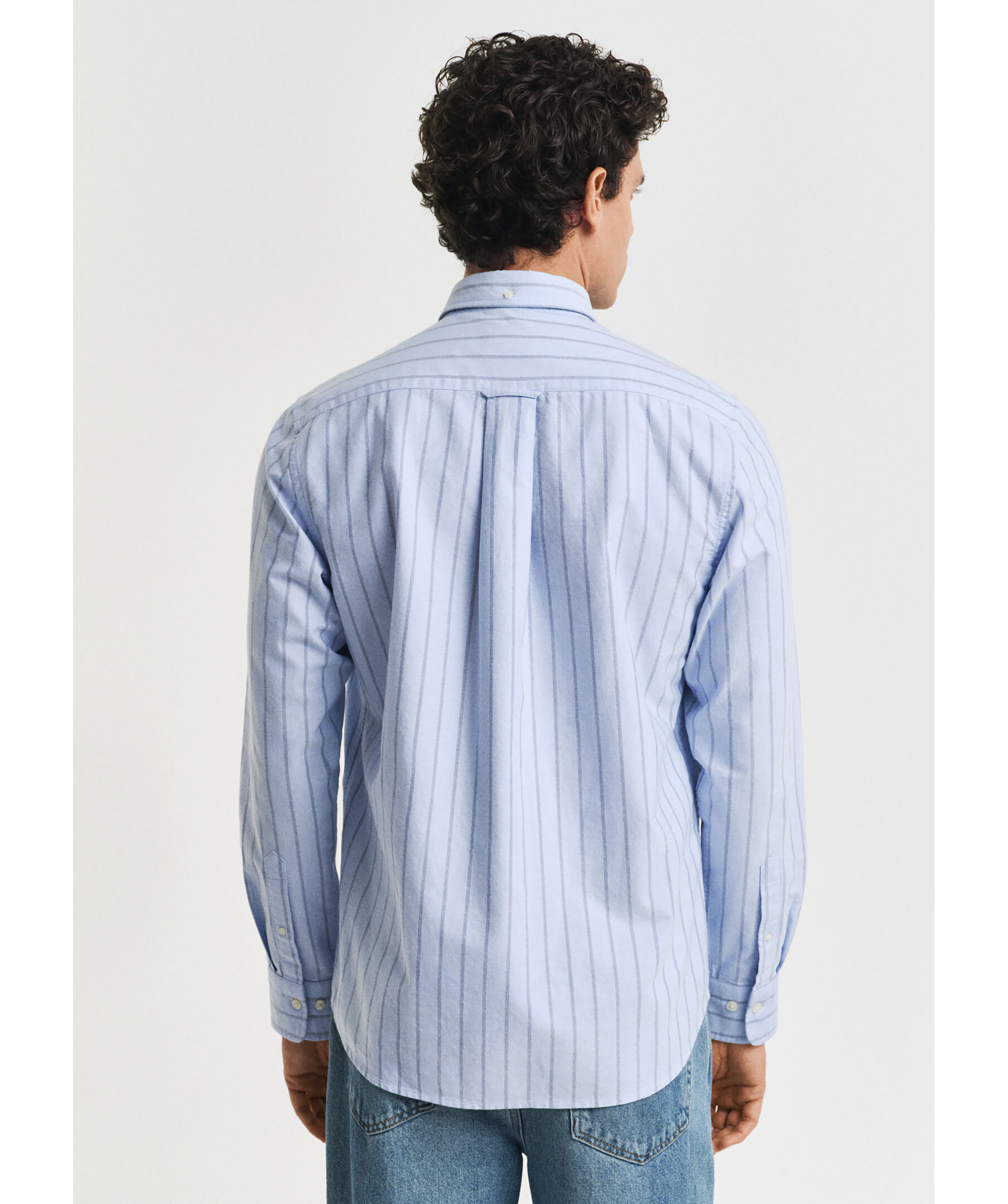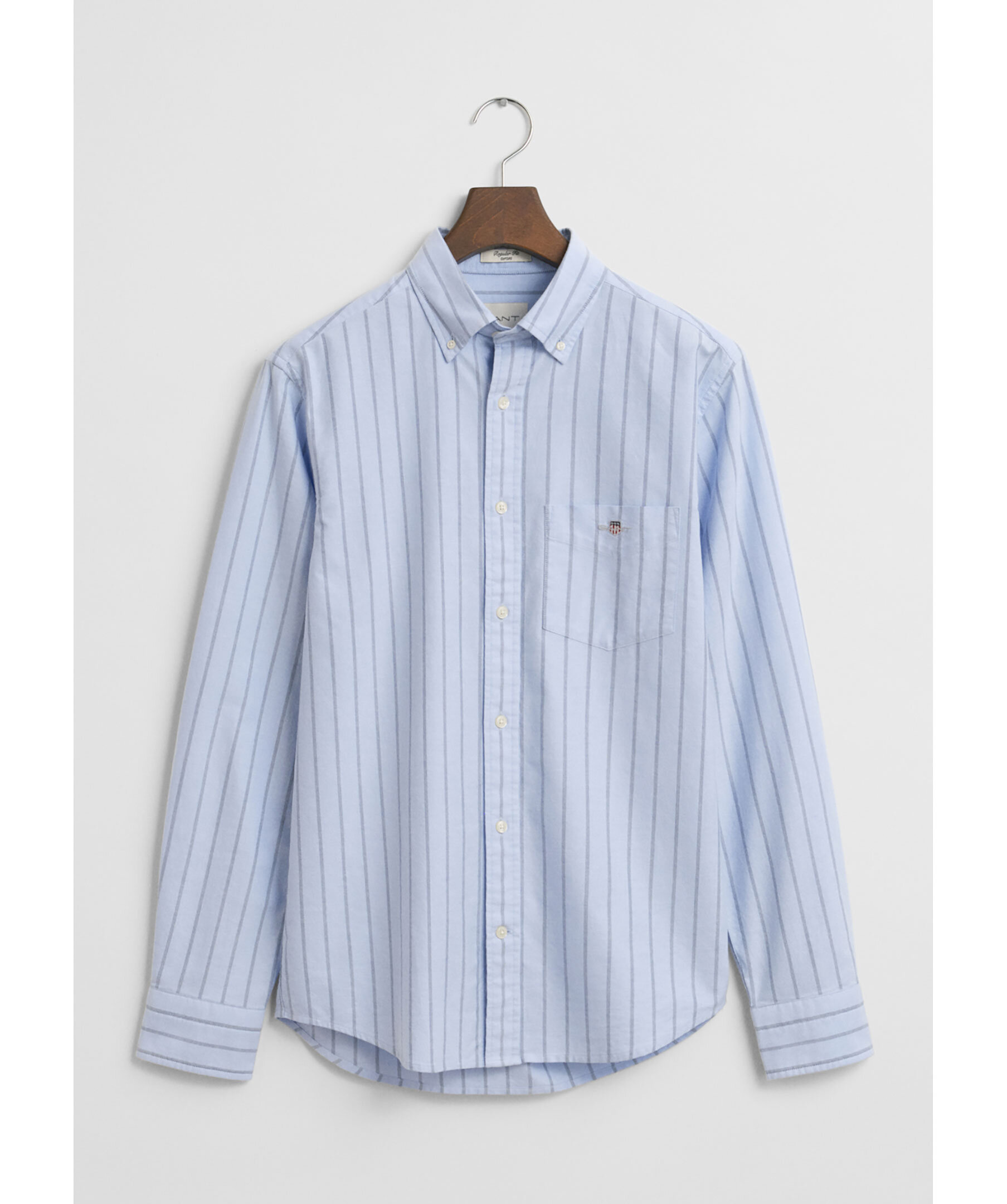 Blå, randig oxfordskjorta från Gant. Skjortan har button-down krage, en bröstficka med liten broderad logotyp, rundad fåll, justerbara ärmslut och boxpleat med deras klassiska locker loop i ryggen. Tillverkad i bomull.