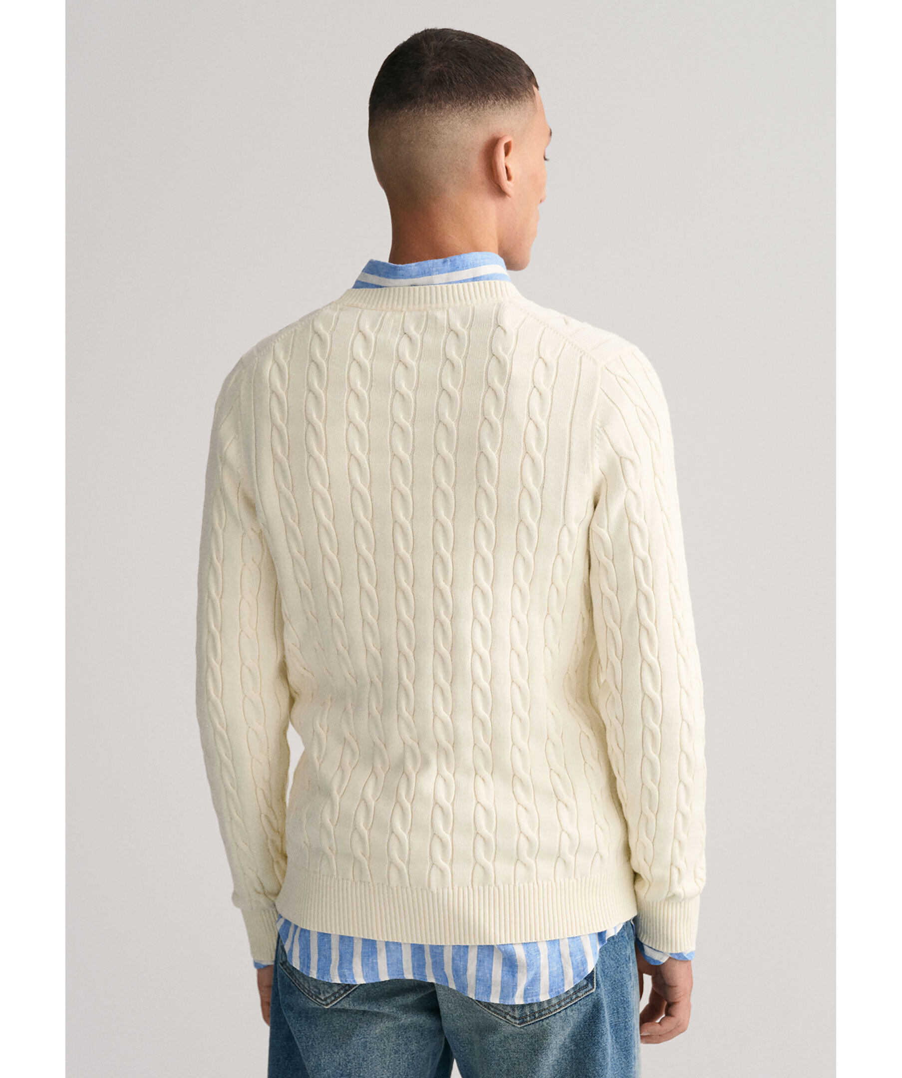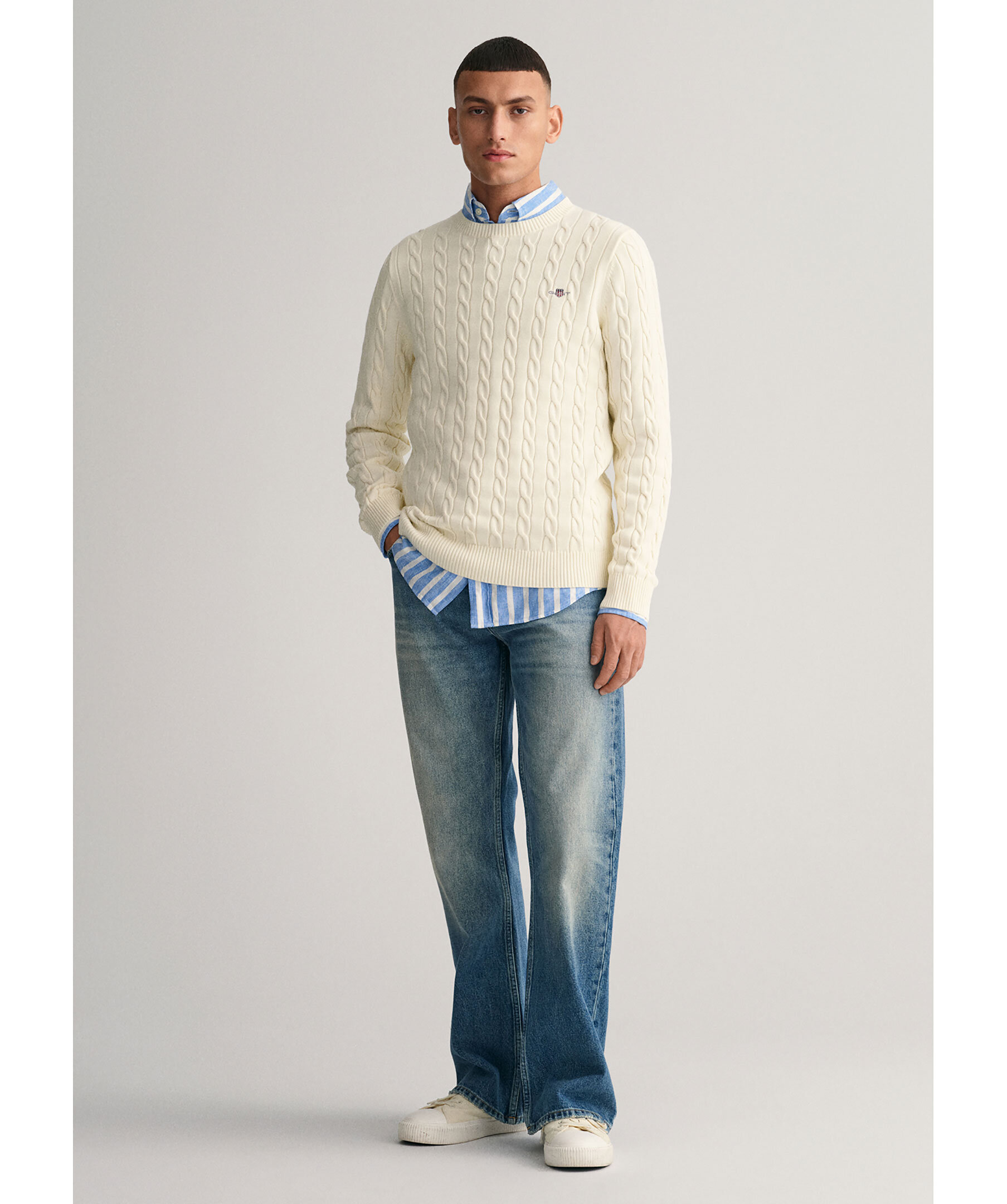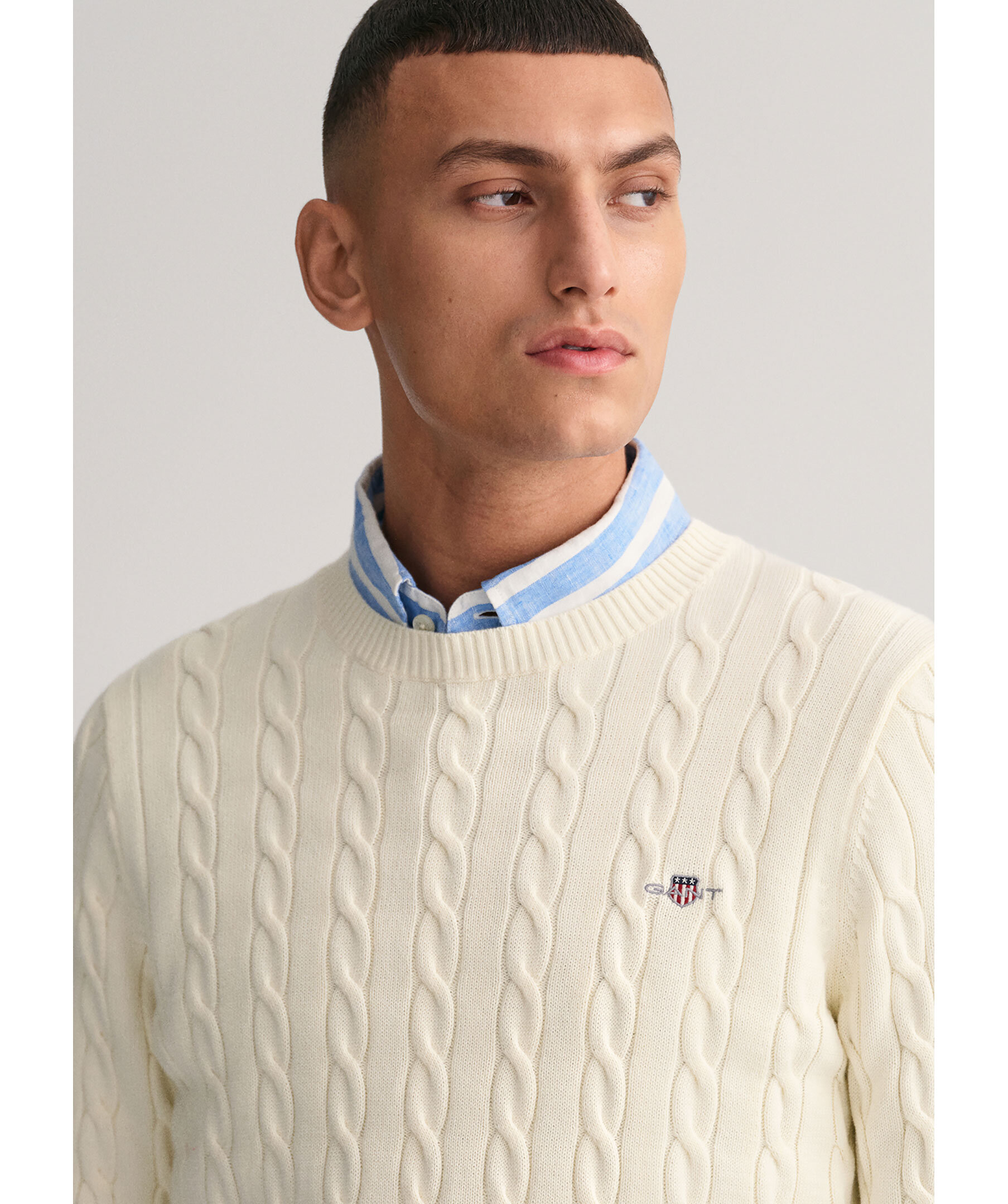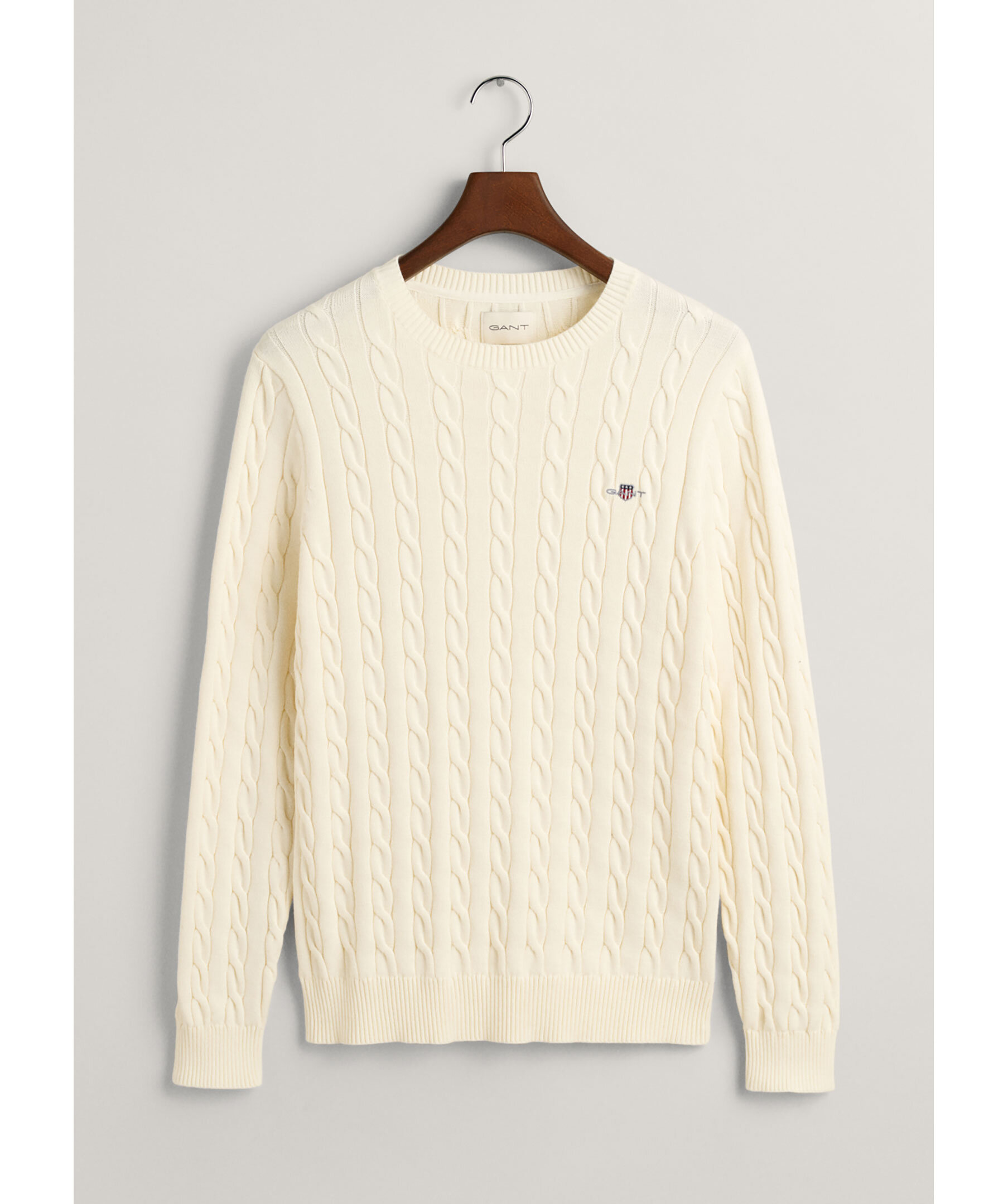 Krämvit kabelstickad tröja från Gant. Tröjan har ribbstickad krage och ribbstickade muddar samt broderad Gant-logotyp på bröstet. Tillverkad i bomull.