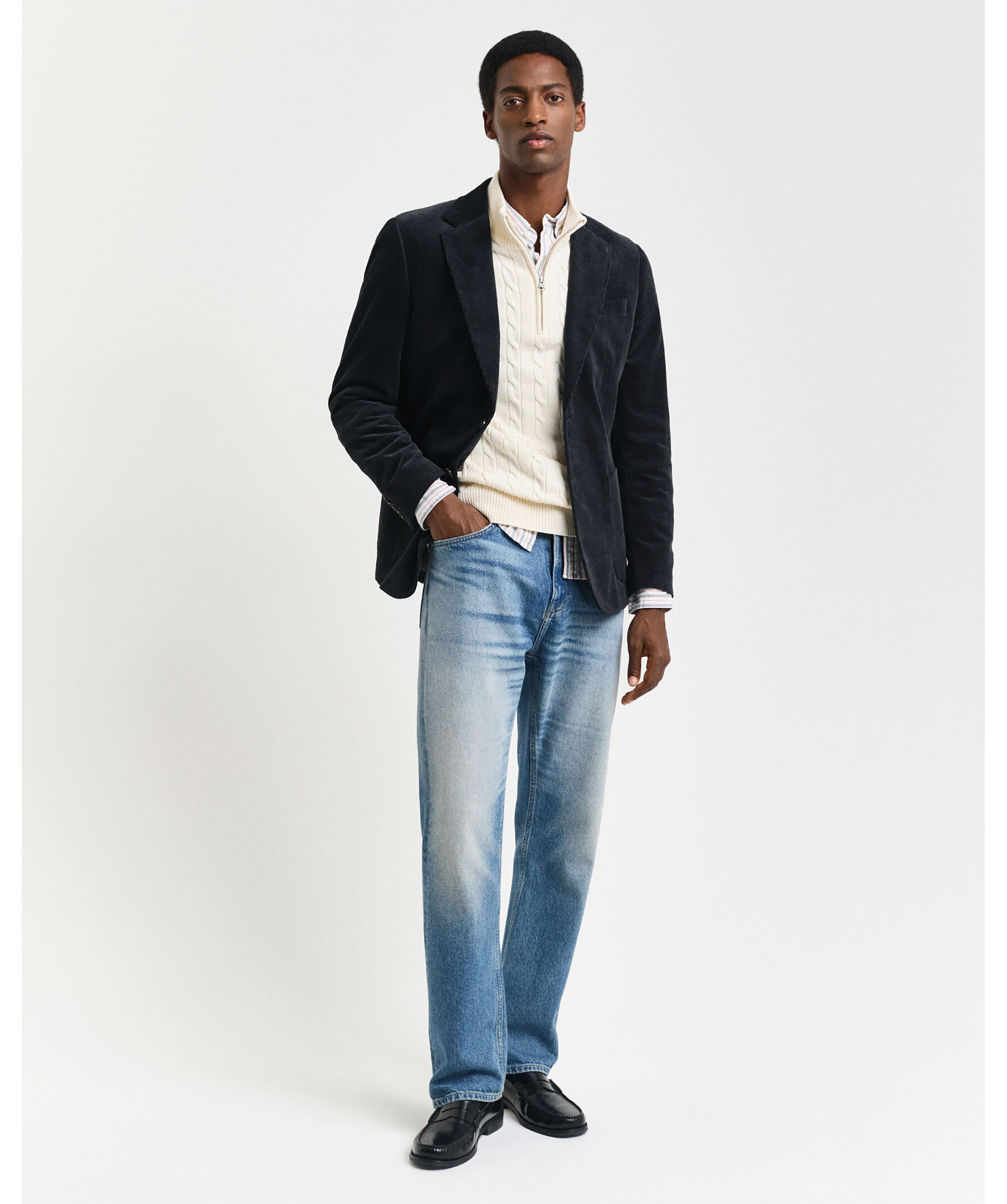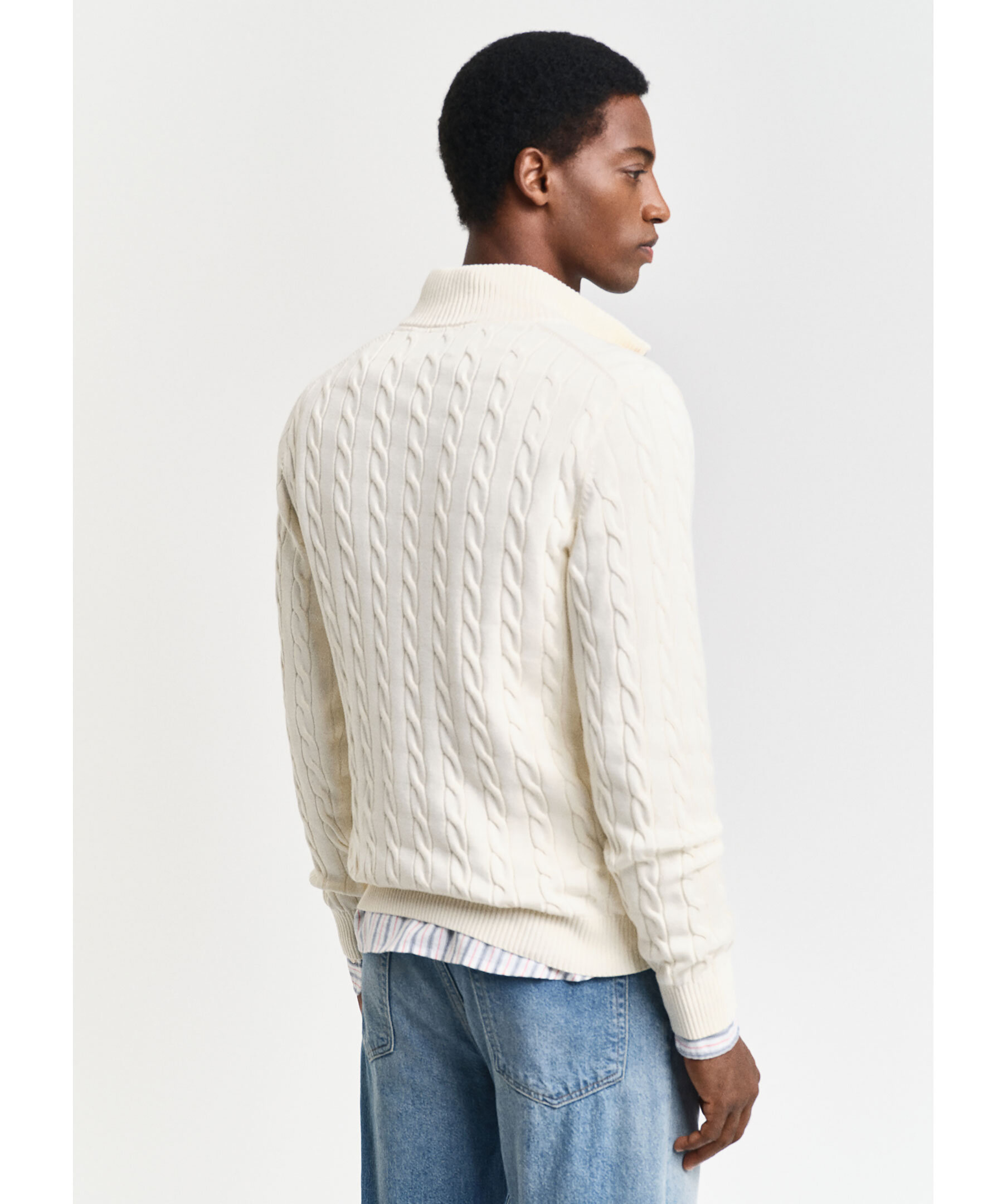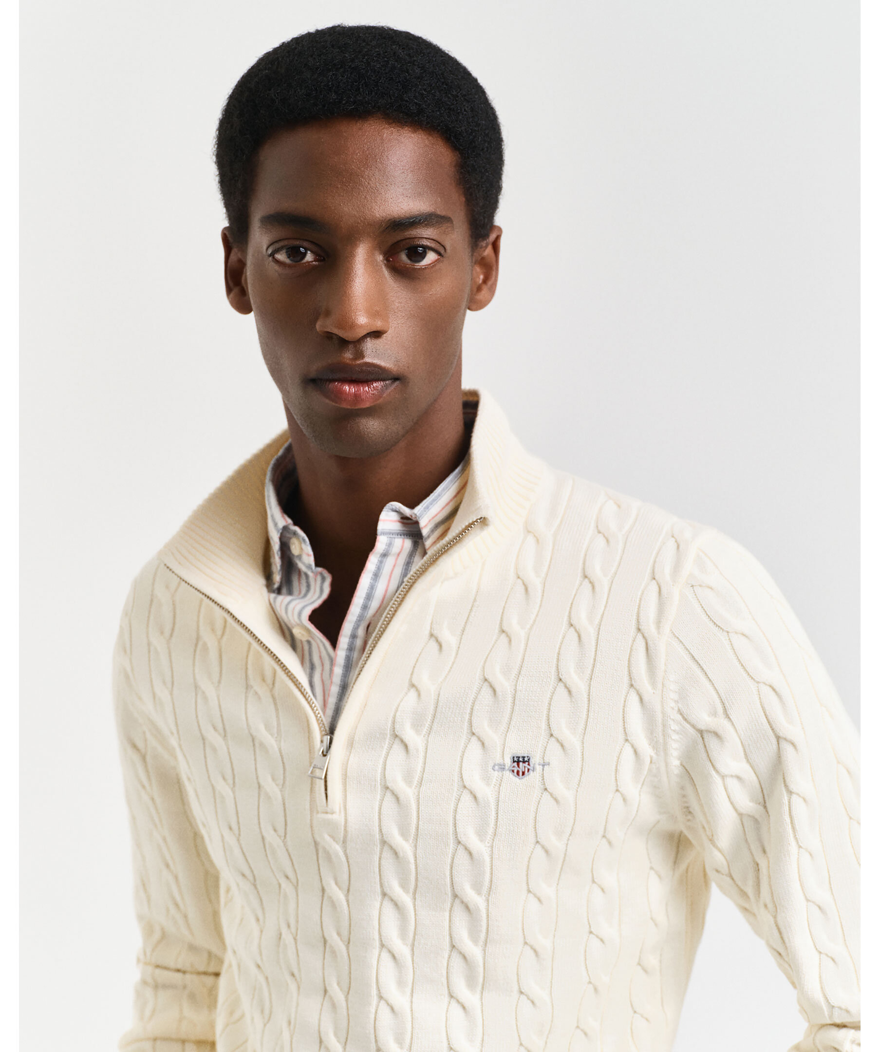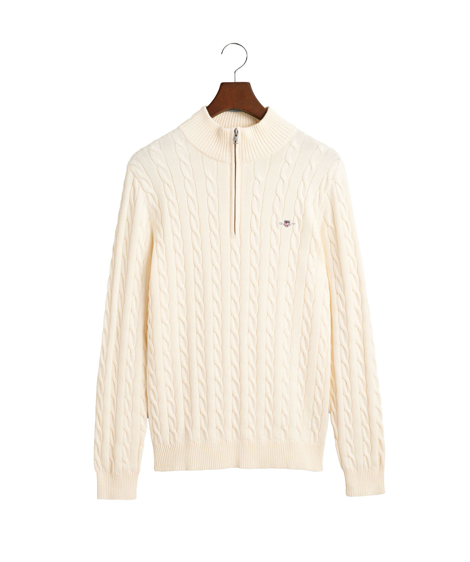Krämfärgad, kabelstickad half-zip från Gant. Tröjan har ribbstickad krage samt muddar vid ärm- och plaggslut och en broderad GANT-logotyp på bröstet. Tillverkad i bomull.