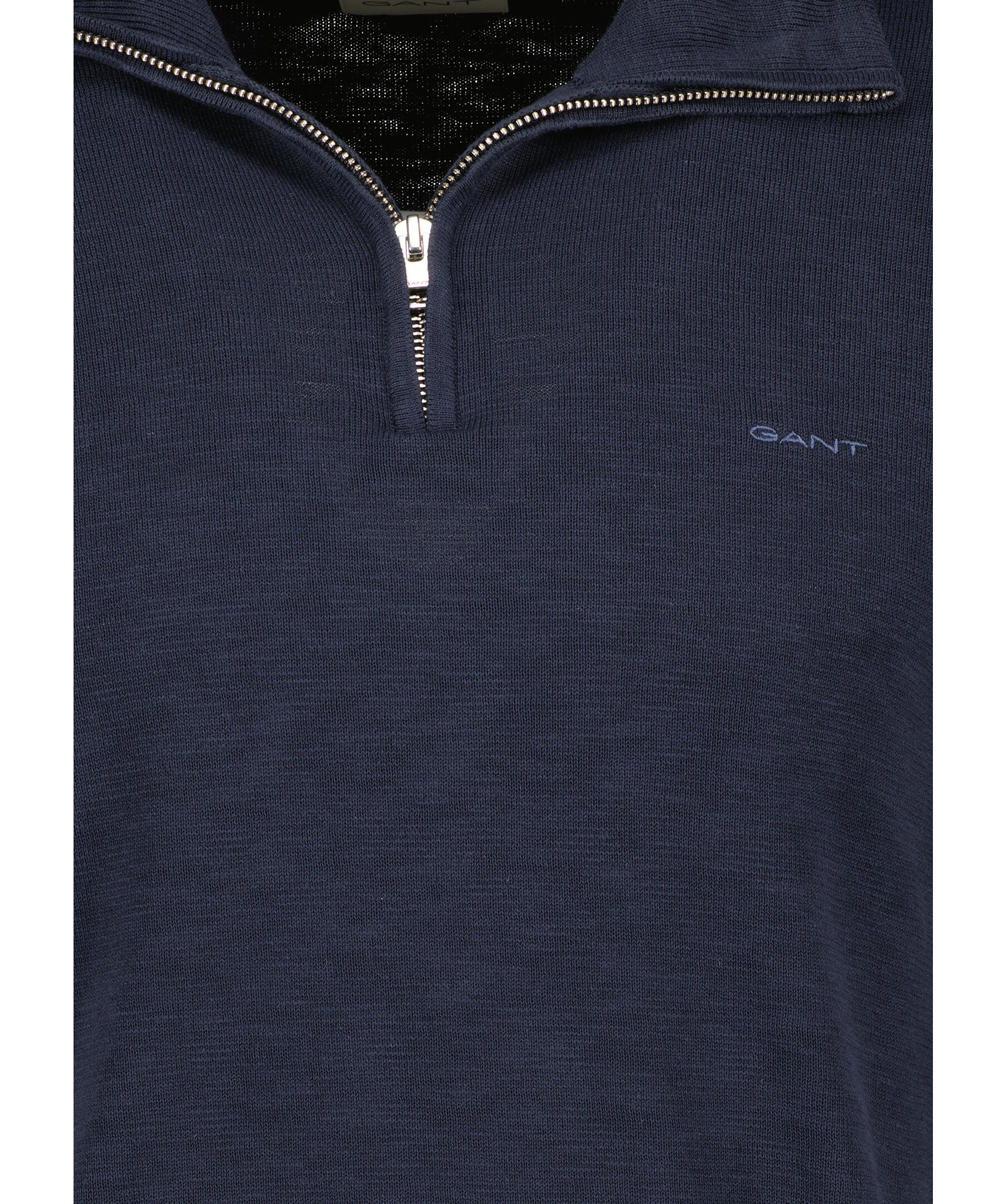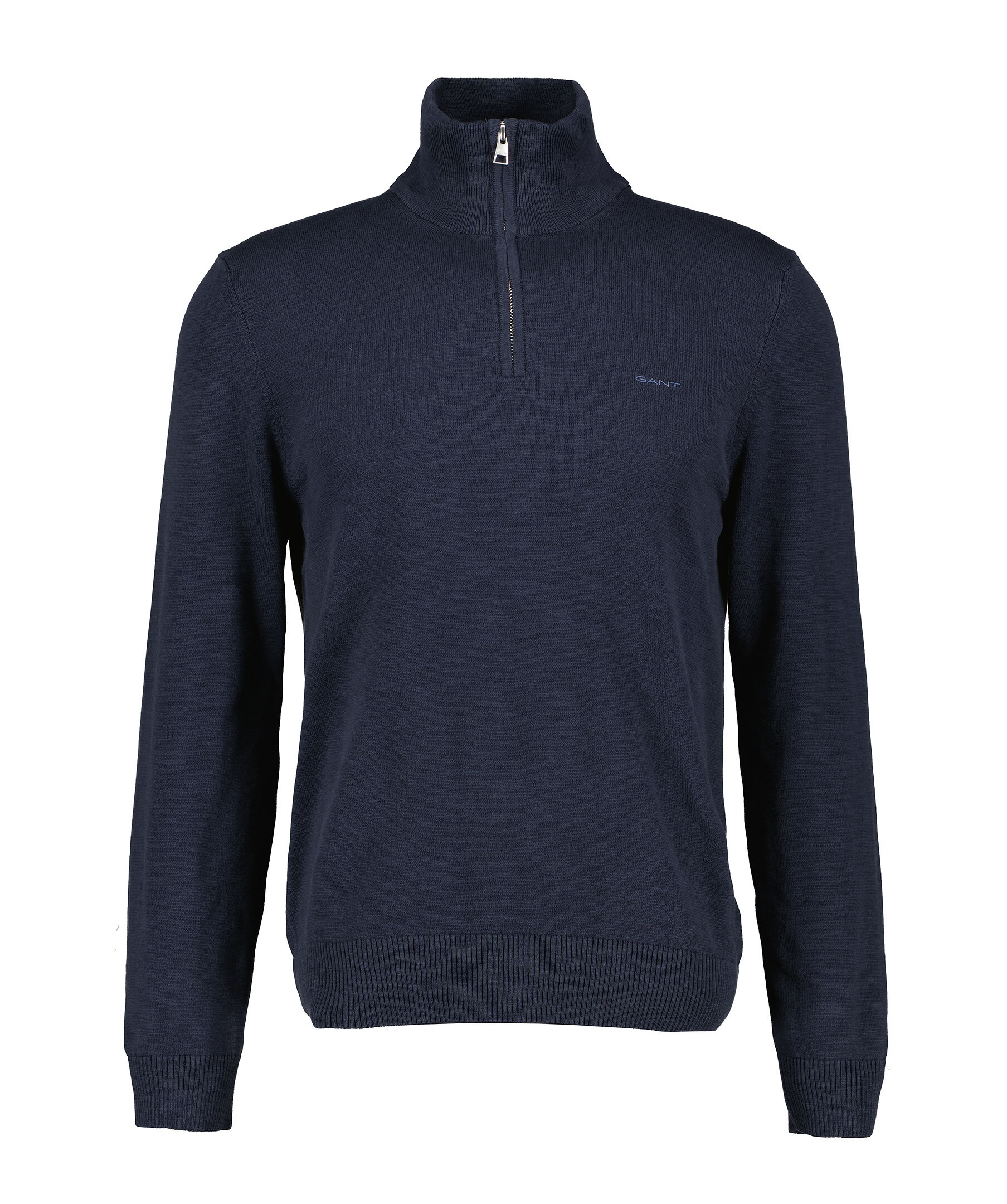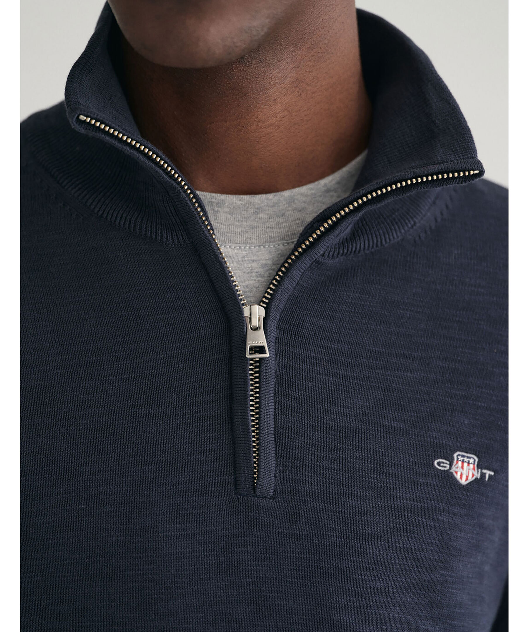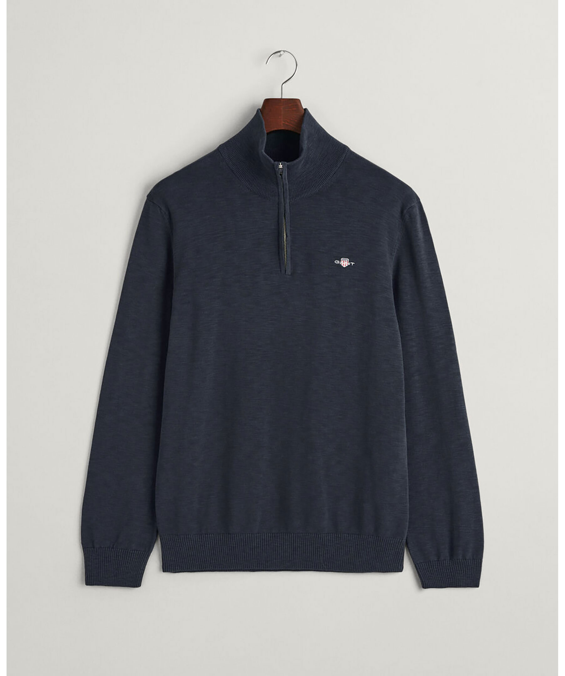 Marinblå, finstickad half-zip tröja från Gant. Tillverkad i 100% bomull. Skuren för en normal passform och har ribbade detaljer vid fållen och ärmsluten och en GANT-logotyp broderad på bröstet.