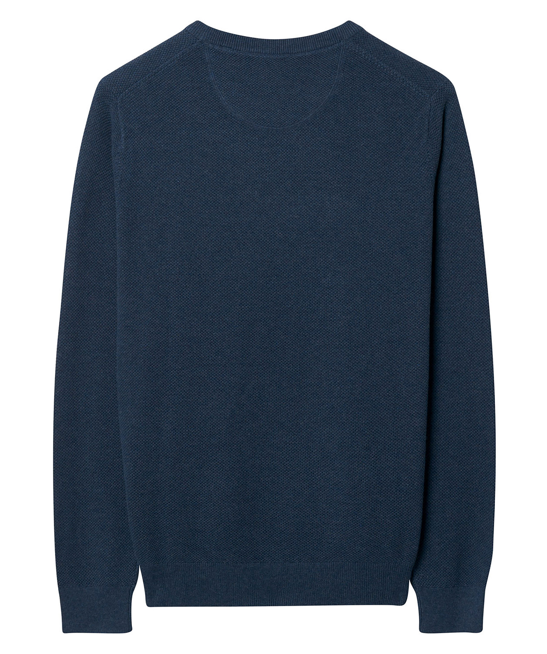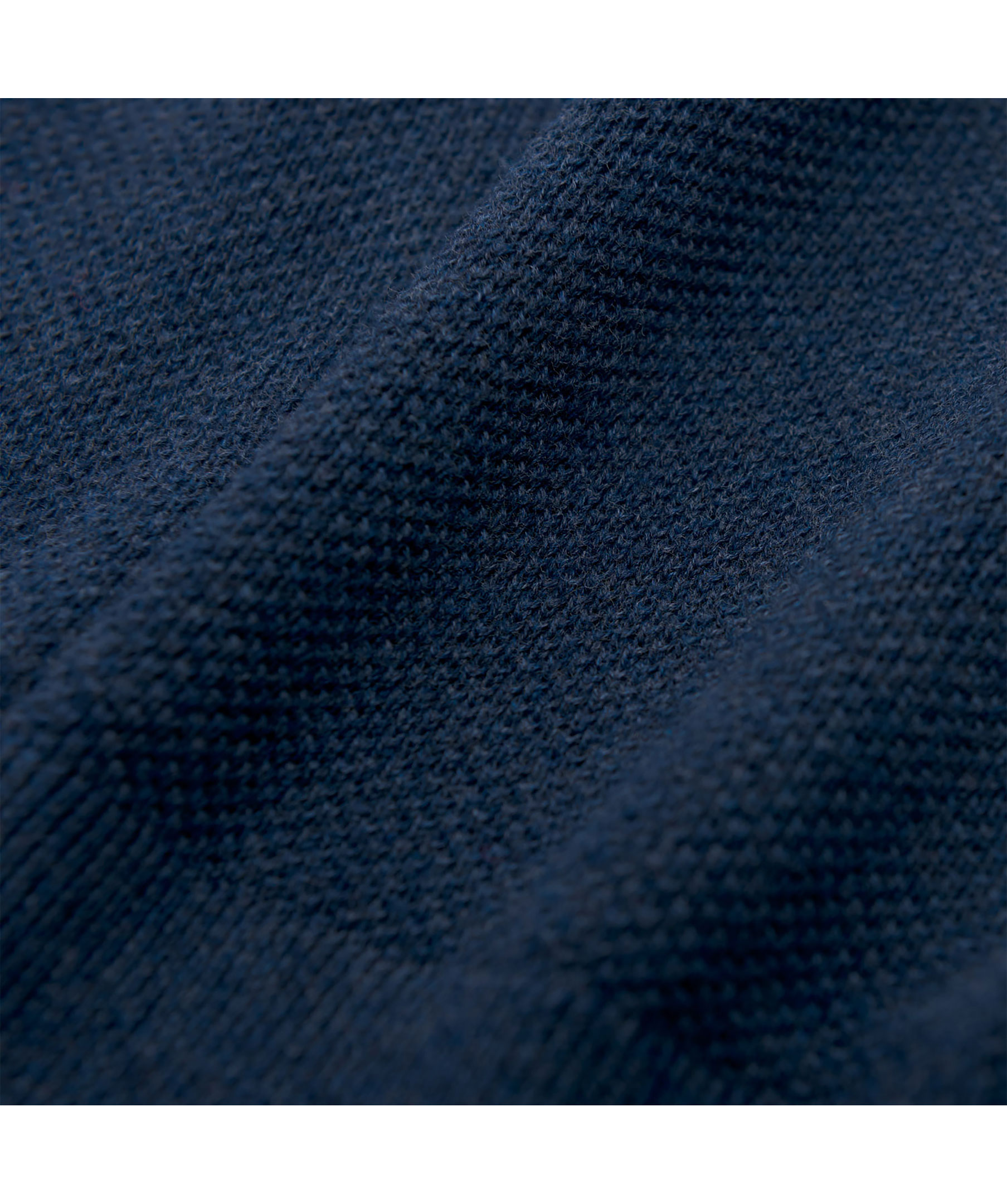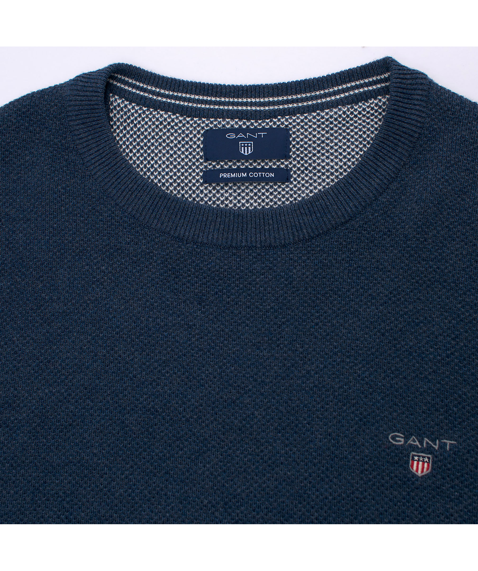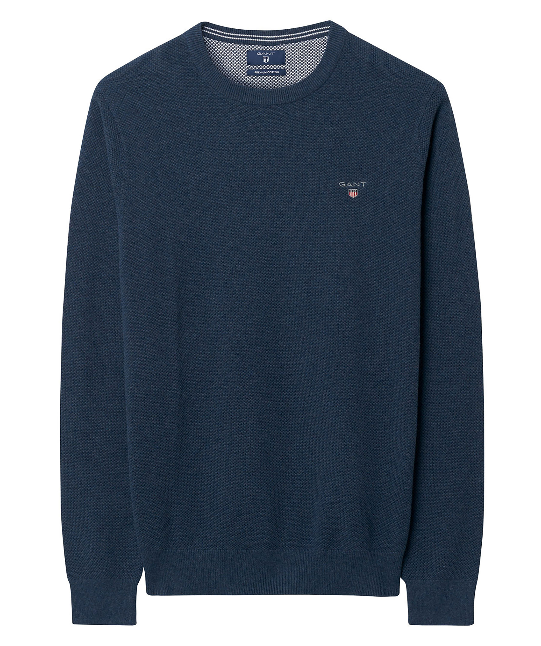 Blå tröja i pikéstruktur från Gant med broderad logotyp på bröstet. Normal passform, rundad hals och ribbstickade muddar.