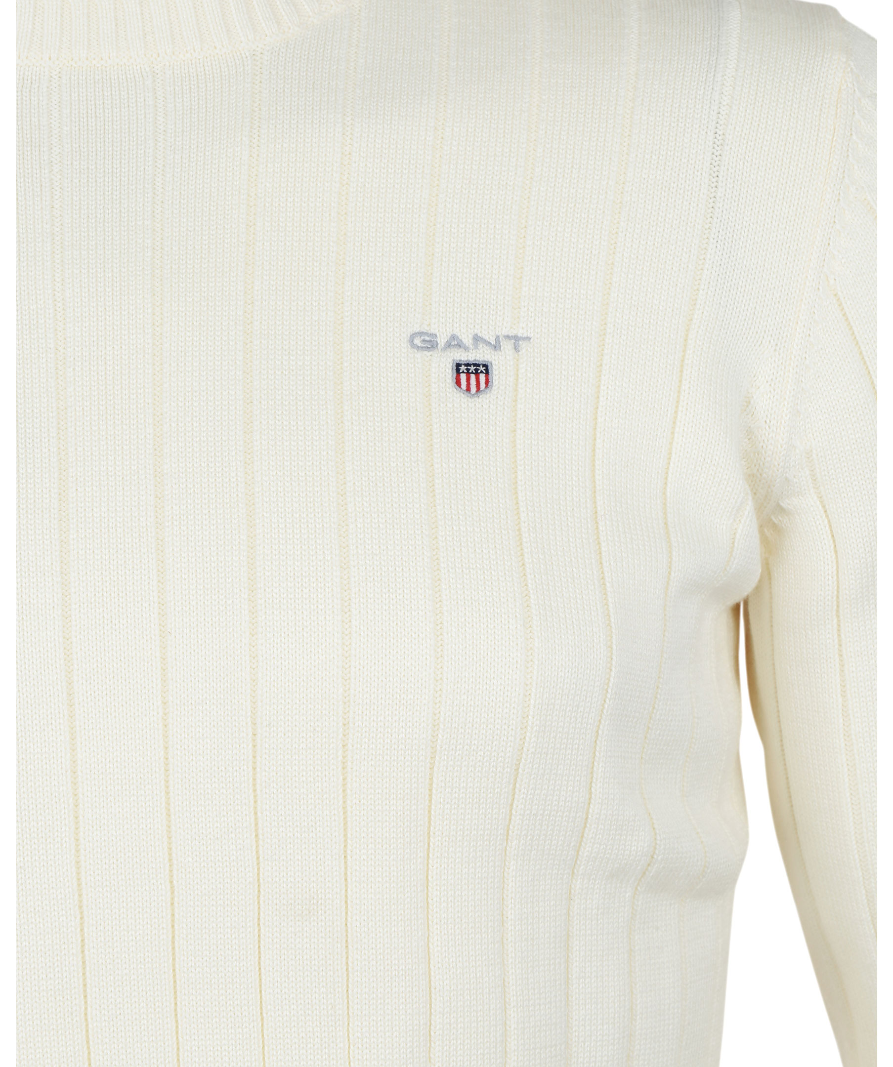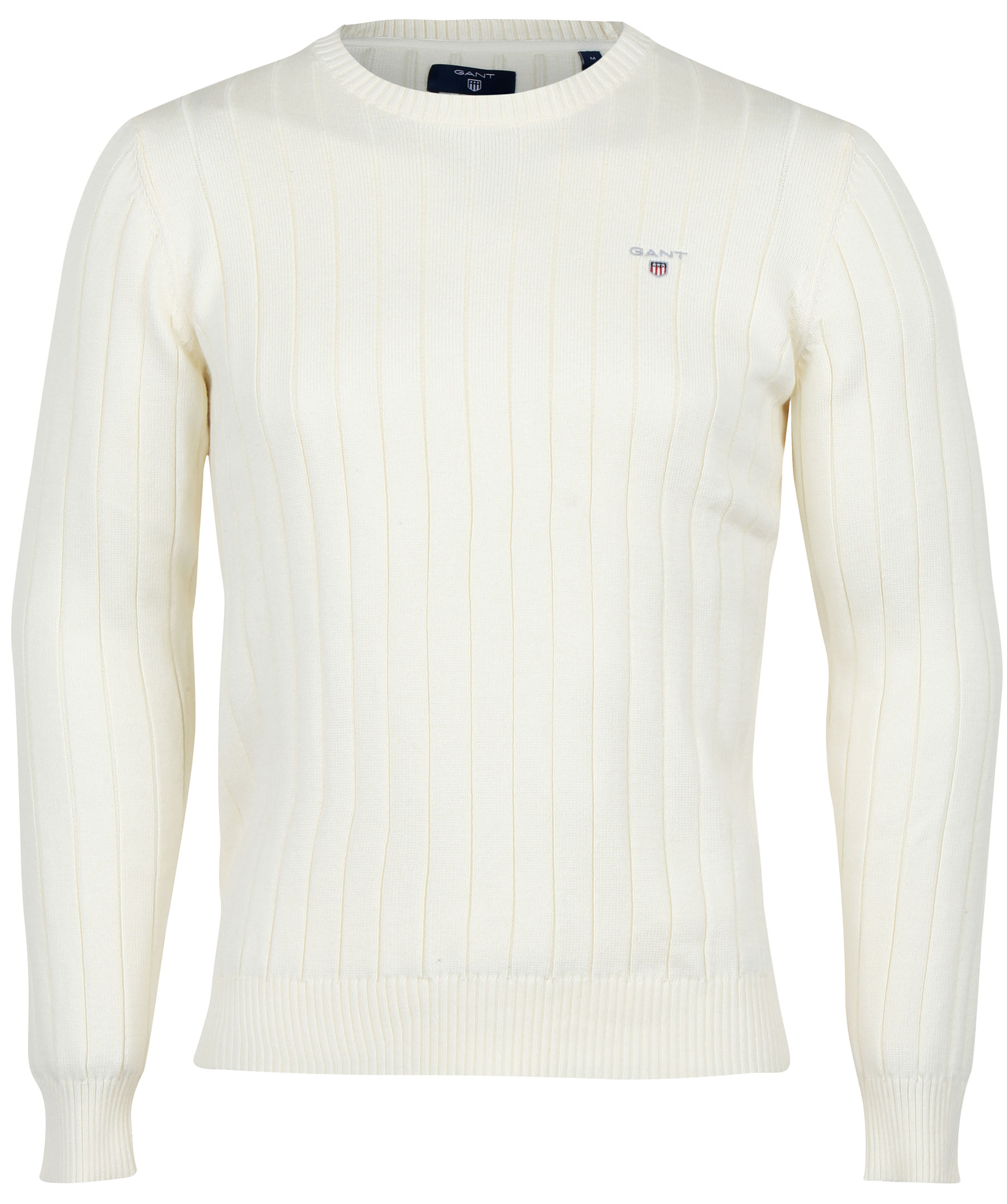 Stickad tröja från GANT i benvitt. Rund halsring, ribbstickade muddar vid hals, plagg och ärmslut. Broderad logga på vänster bröst. Tillverkad i 100% bomull.
