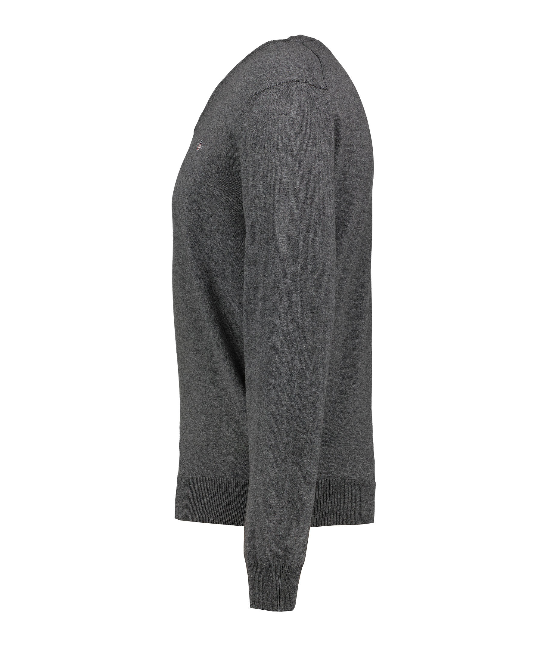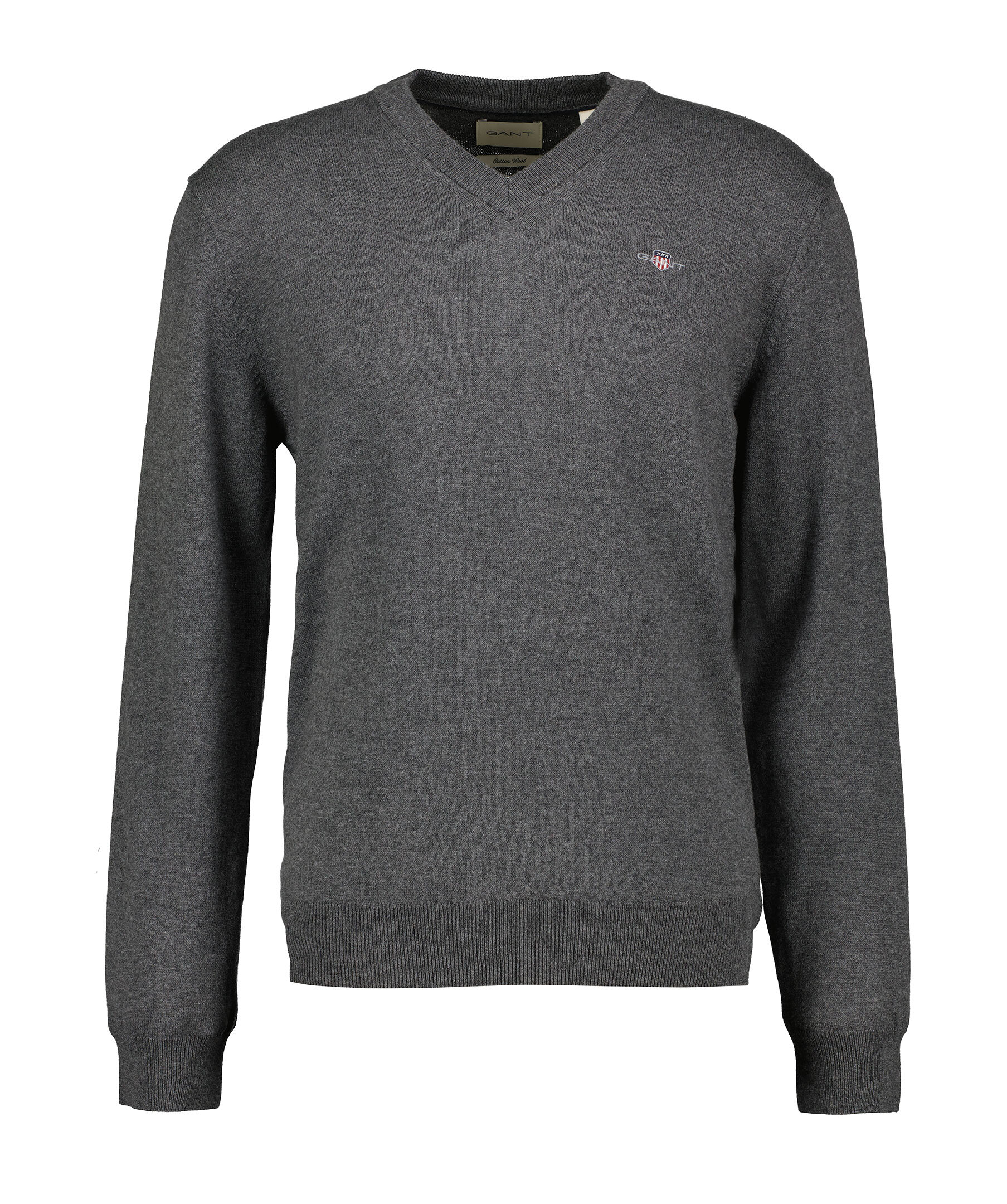 Grå finstickad tröja från Gant. Tröjan har en ribbstickad, v-ringad halsringning samt ribbstickade muddar vid ärm- och plaggslut och en broderad logotyp på bröstet. Tillverkad i en ullblandning.