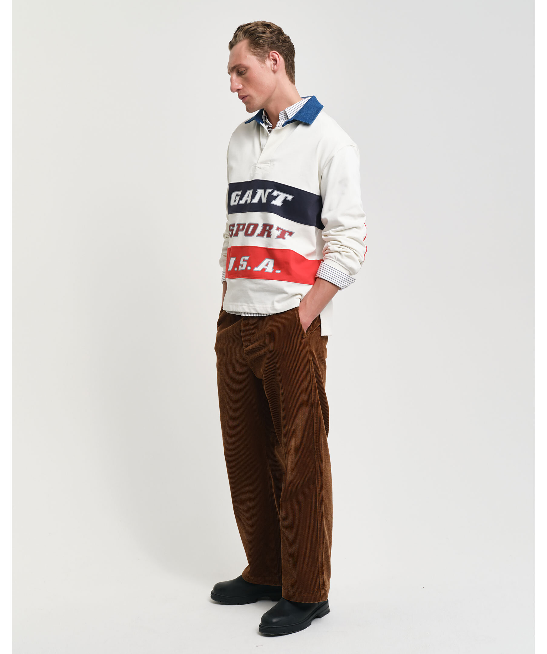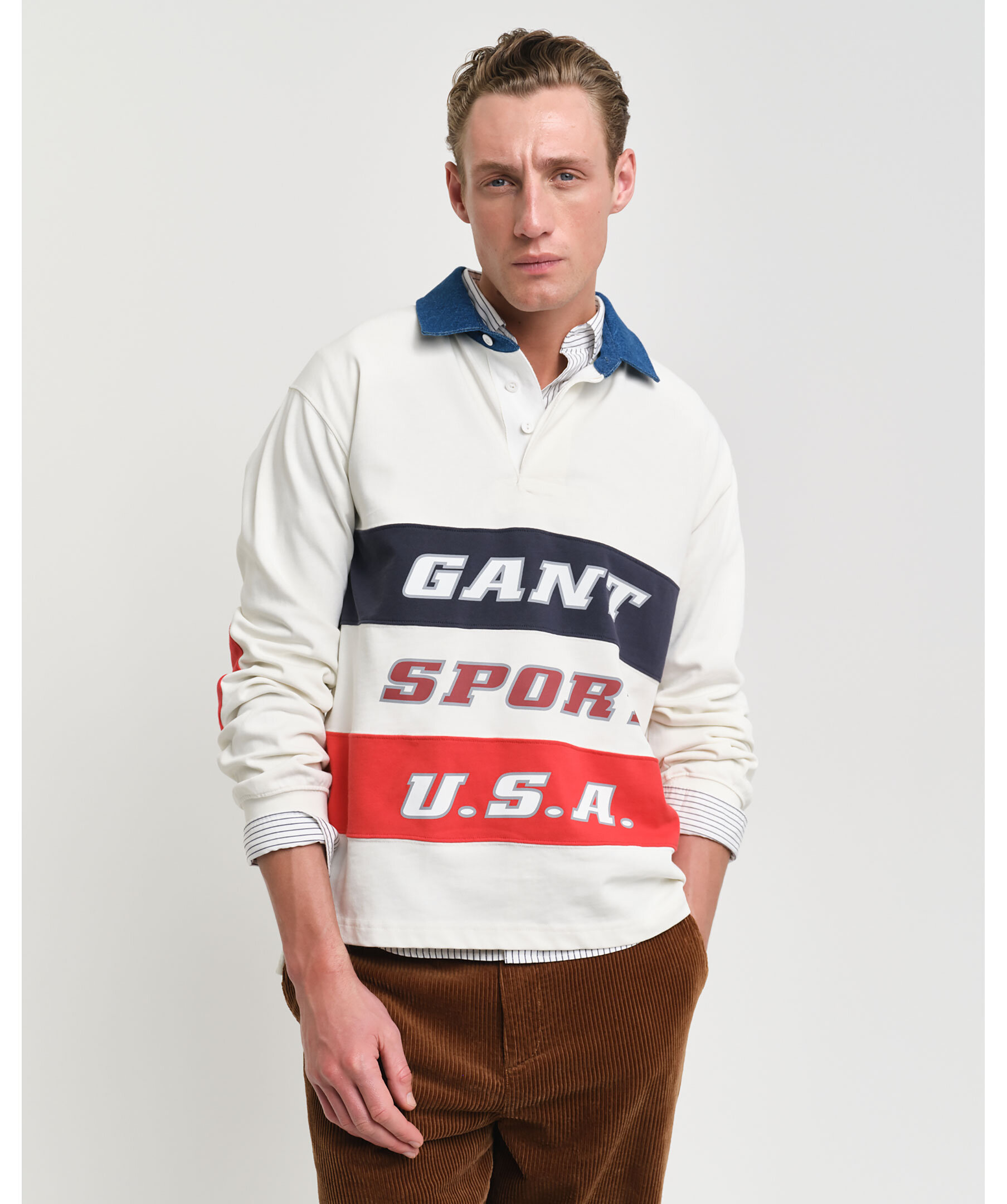 Rugbytröja från GANT. Inspirerad av 90-talets ikoniska Sport-line, erbjuder den en avslappnad unisex-passform och detaljer som denimkrage, X-stitching och cut-and-sewn paneler. Varsity-inspirerad logotyper. Tröjan tillhör Gant's 75-årsjubileum och deras 'Anniversary Collection'.