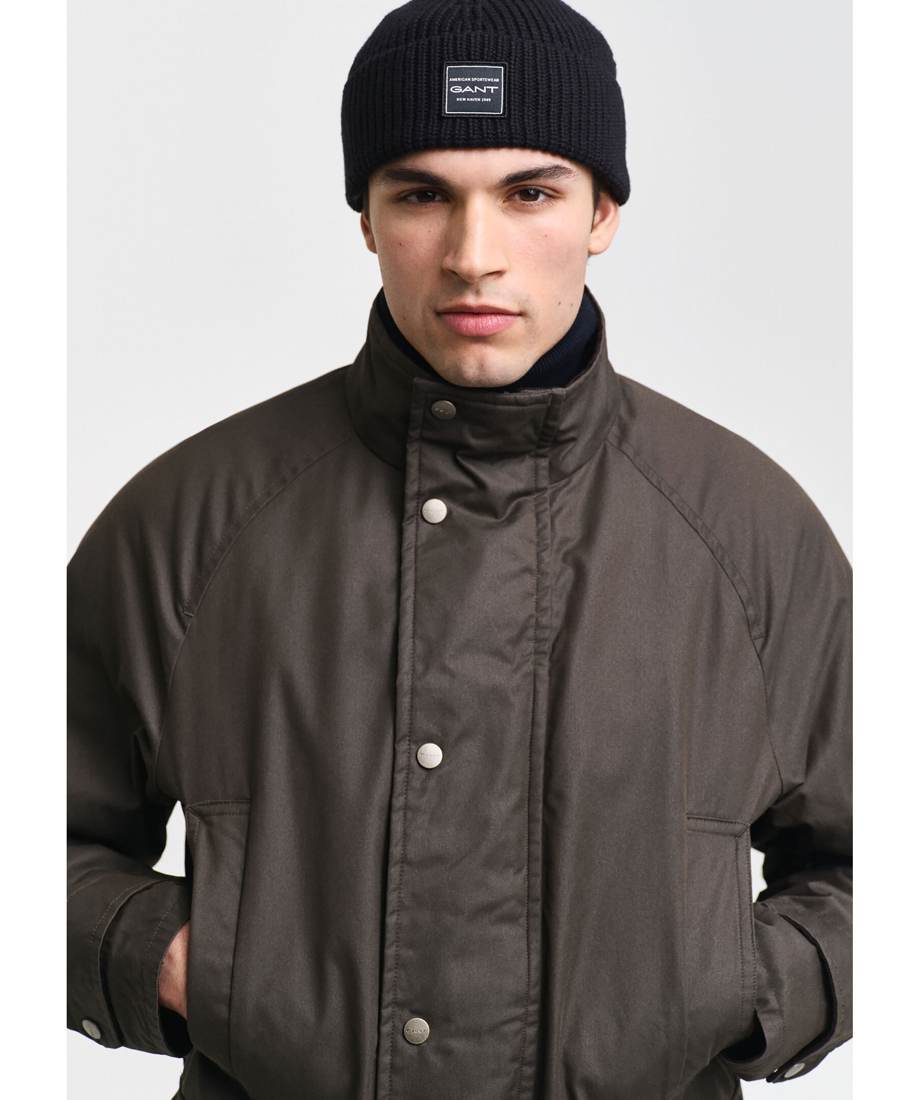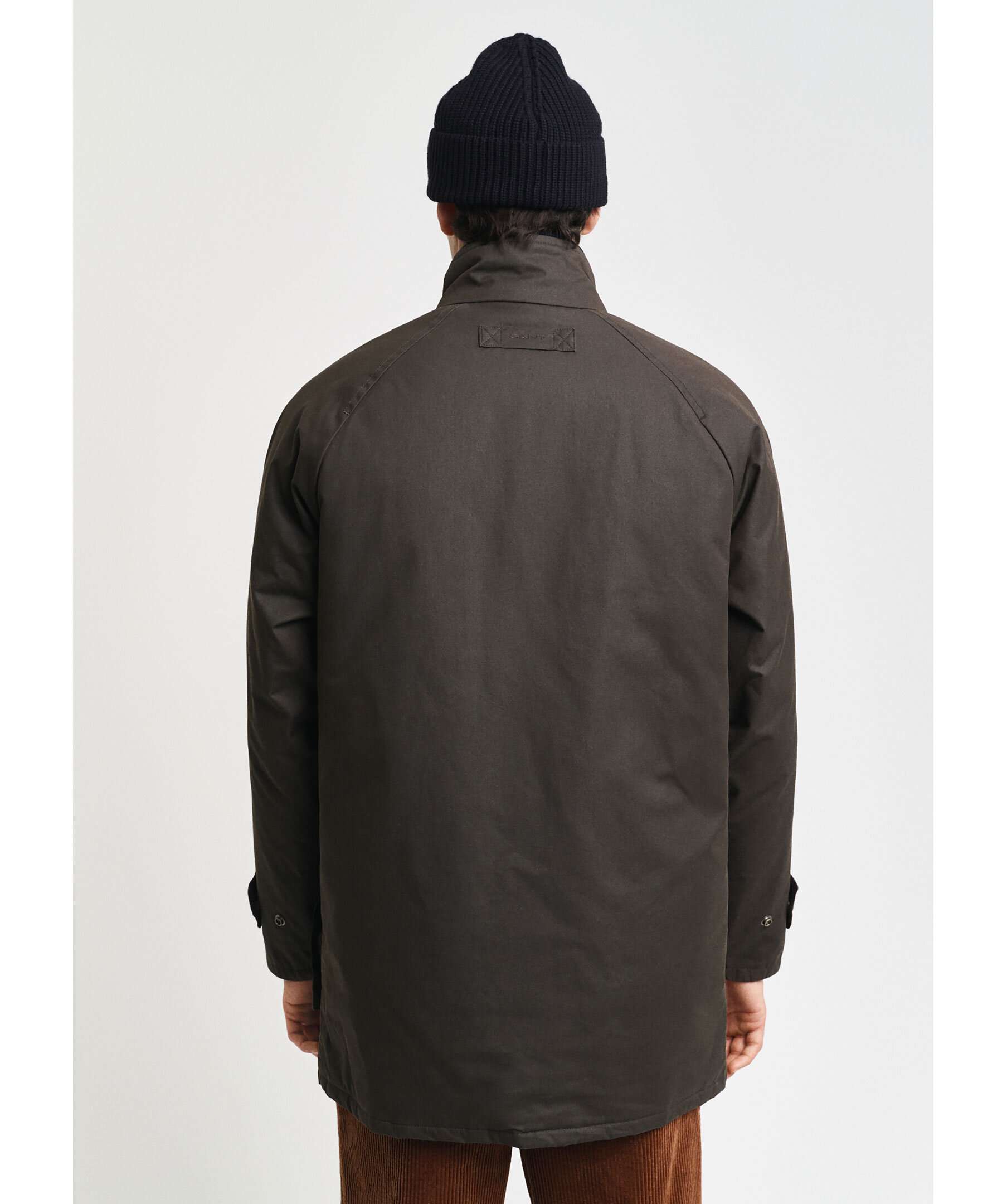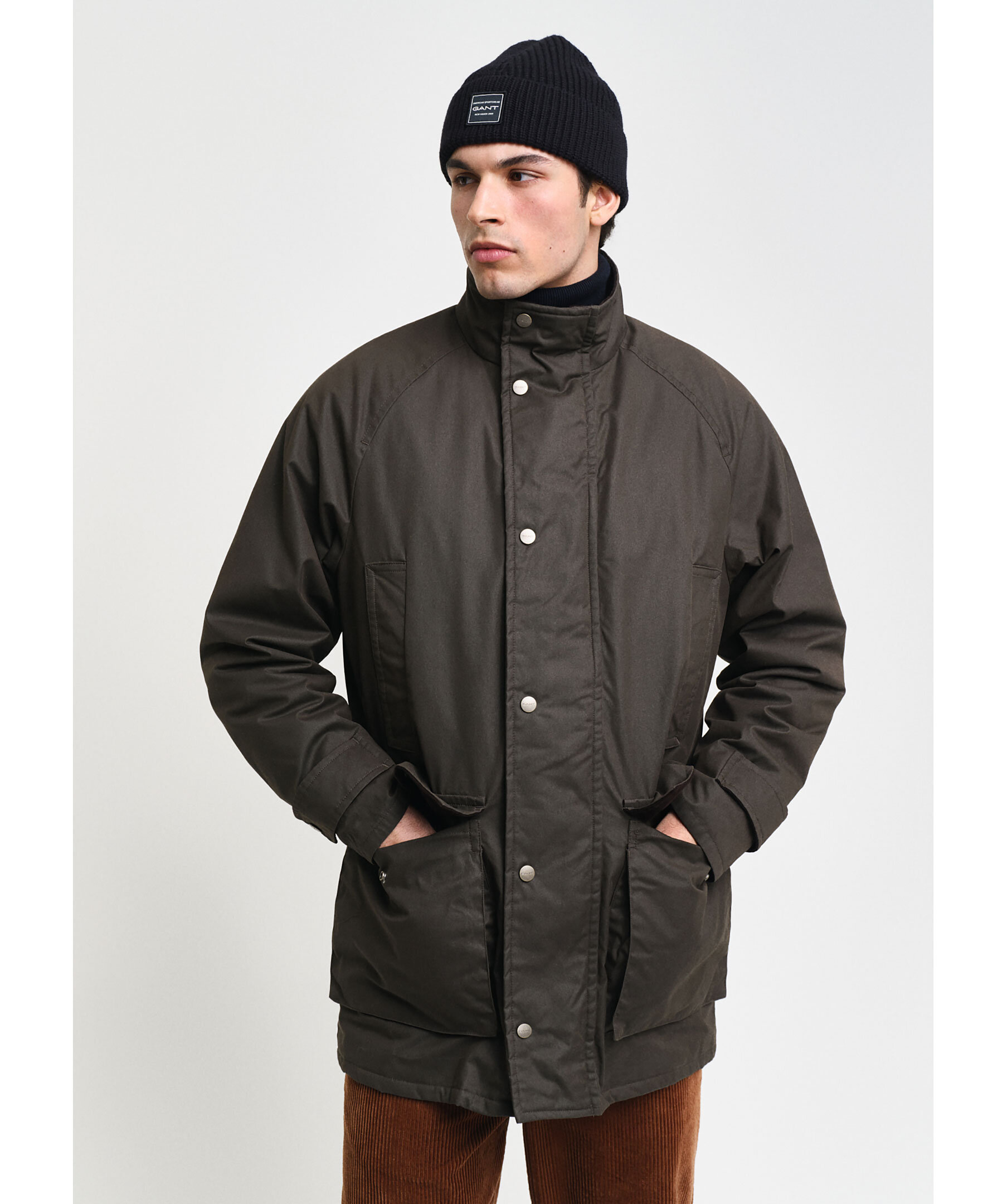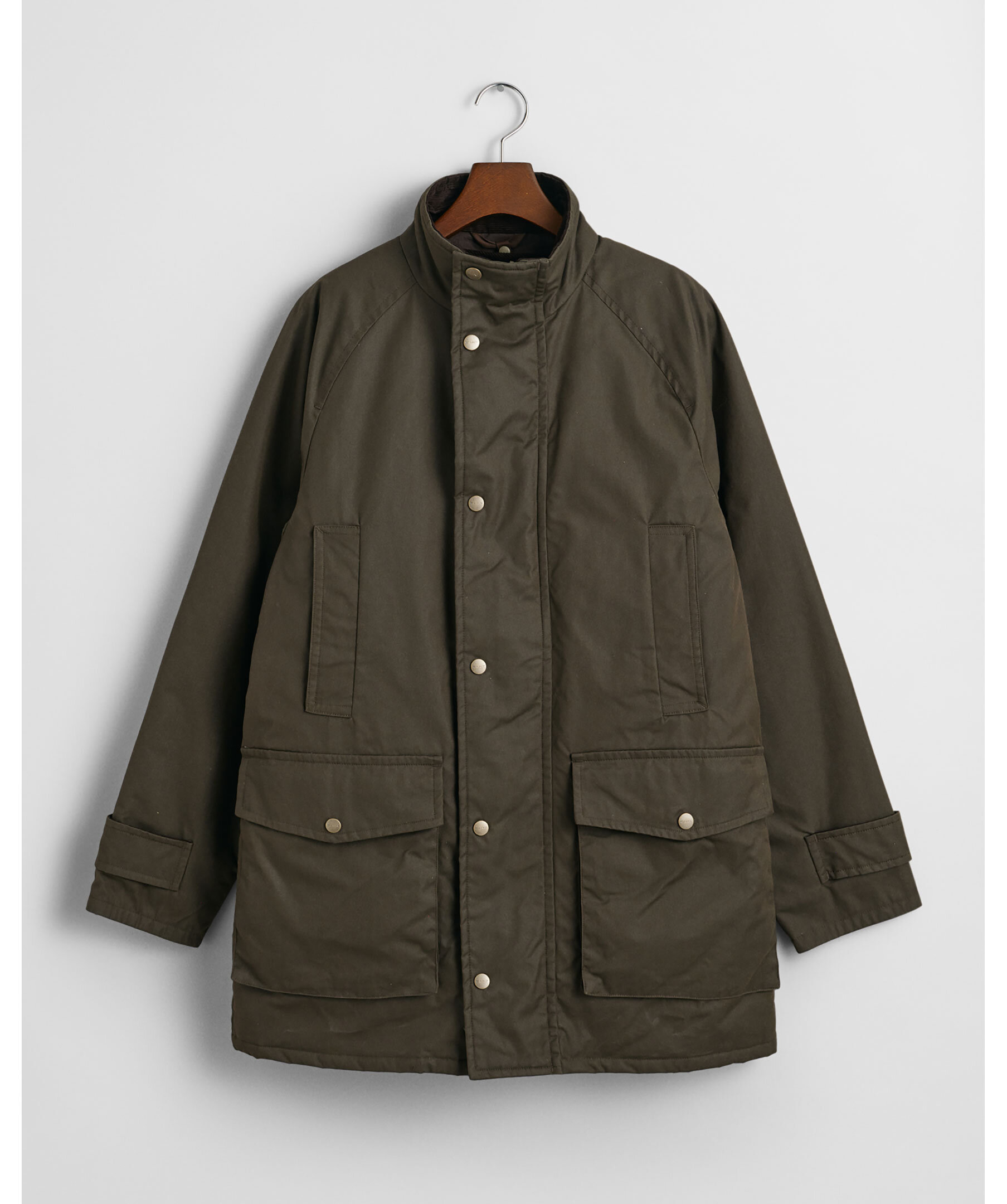 Mörkgrön jacka från Gant. Jackan stängs med dold dragkedja och tryckknappar och har två stora, helfodrade fickor med lock, ståkrage, raglanärmar samt en avtagbar väst. Slutar strax ovanför knät. Tillverkad i en bomullsblandning.