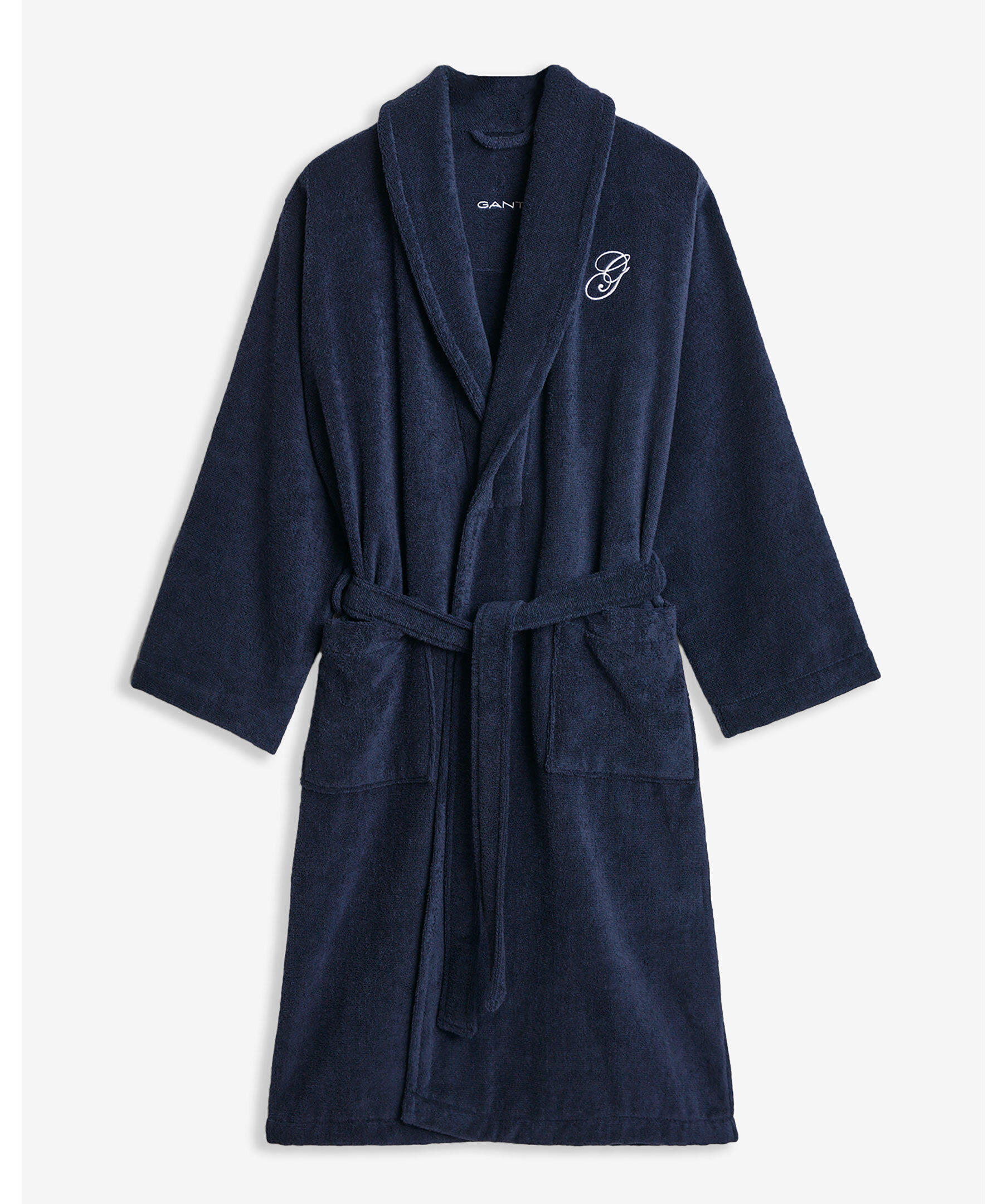 Blå badrock från GANT i vävt bomullsfrotté. Badrocken har en tjock krage och ett broderat 'G' på bröstet samt ett midjebälte och två framfickor.